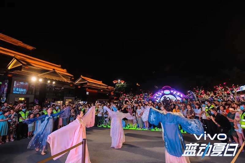 夜幕降临,一场场表演轮番登场,此刻是“她来听我的演唱会”,歌声入耳,余音绕梁;此刻是“大唐荣耀,歌舞升平”,充满古色的舞蹈,梦回唐朝。