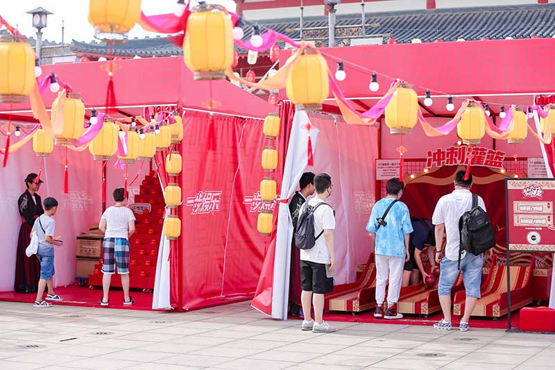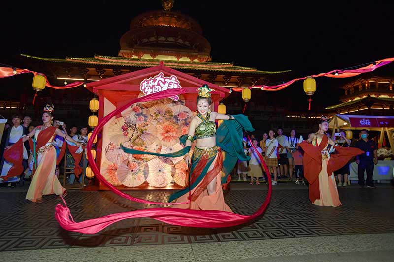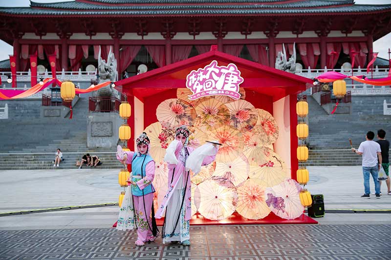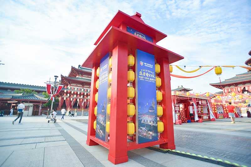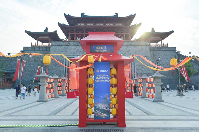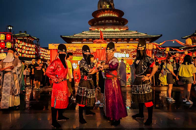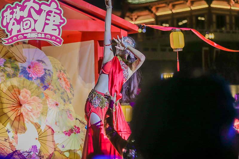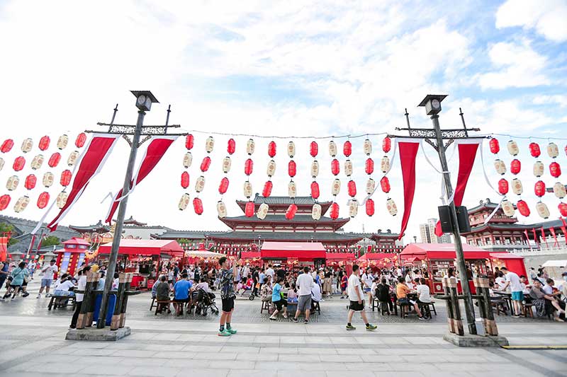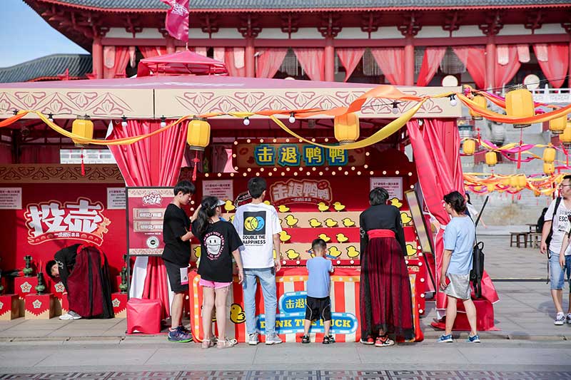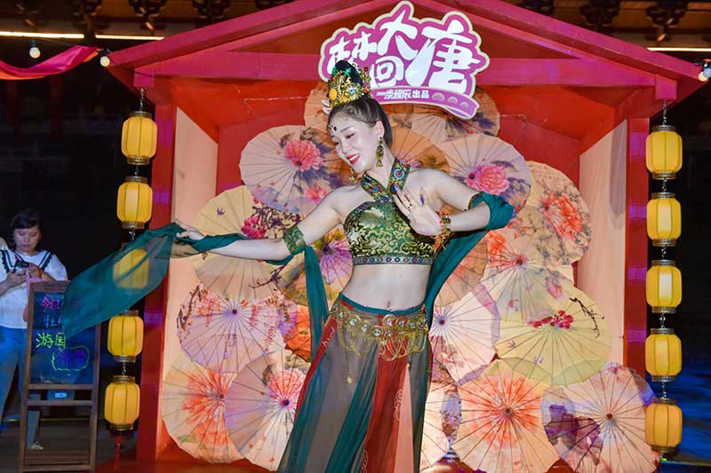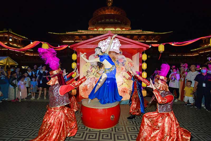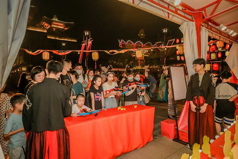 2021暑期华谊兄弟电影世界“盛唐奇幻夜”活动现场还原了大唐市集风貌,电影世界园内处处张灯结彩,古长安平康坊歌舞升平,狄仁杰电影场景再现,沉浸式潮玩大唐。200+专业演员穿梭于市集中,倾情演绎西域公主、绝美歌姬、万国使丞、曲艺杂耍,游客入园即穿越,感受一千四百年前的盛唐奇景。从开市到闭市,从金甲护卫、市井功夫,到宵禁打更、西域风情,每晚12场市集演艺及不间断互动剧情,带您体验盛唐“极乐之宴”!