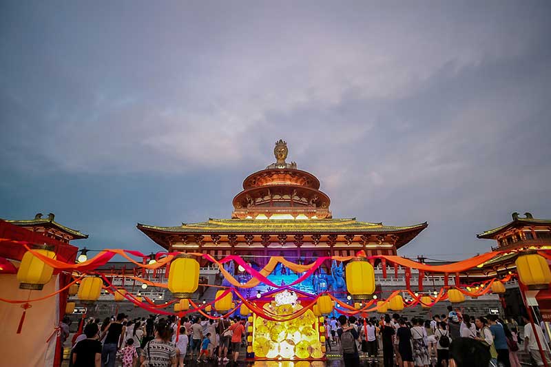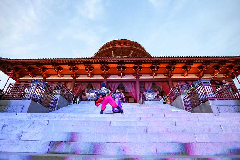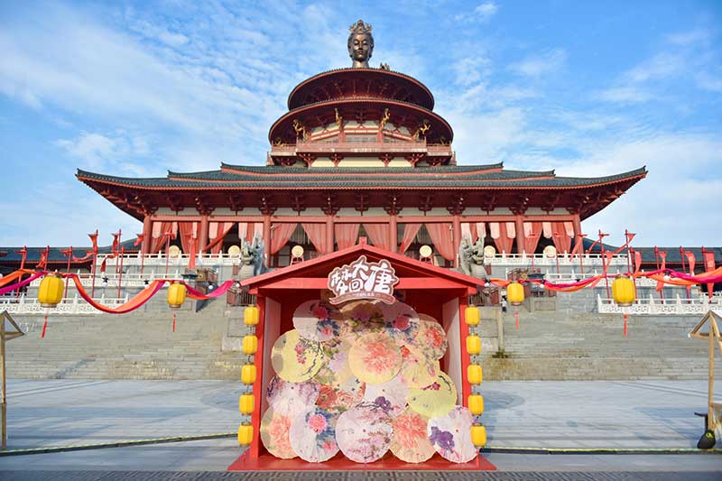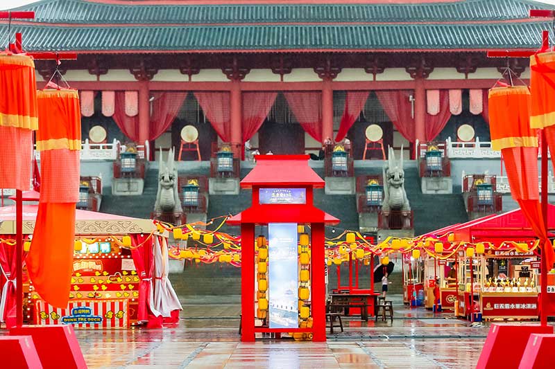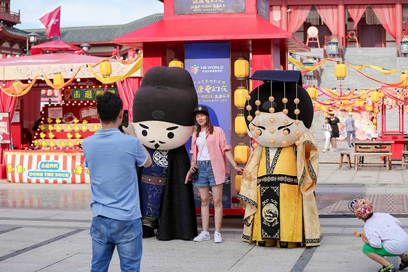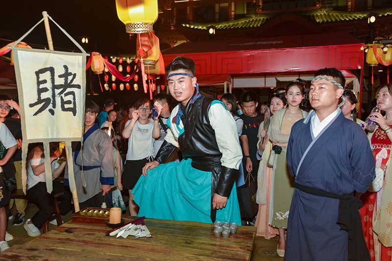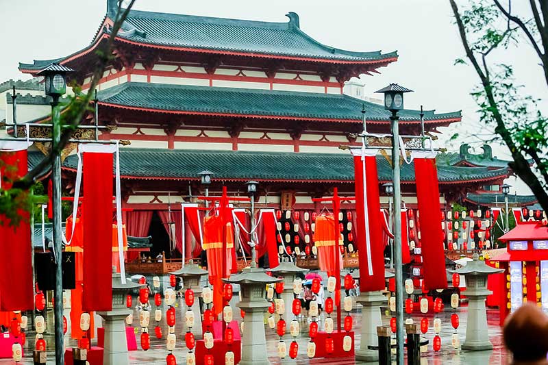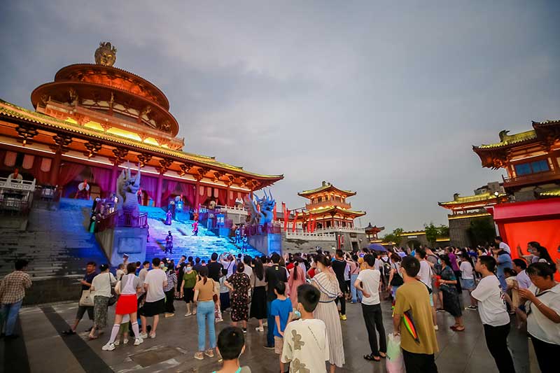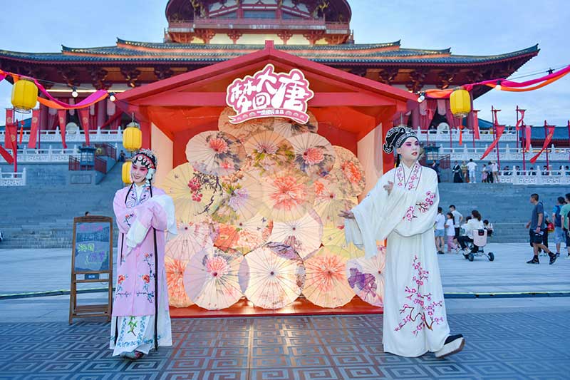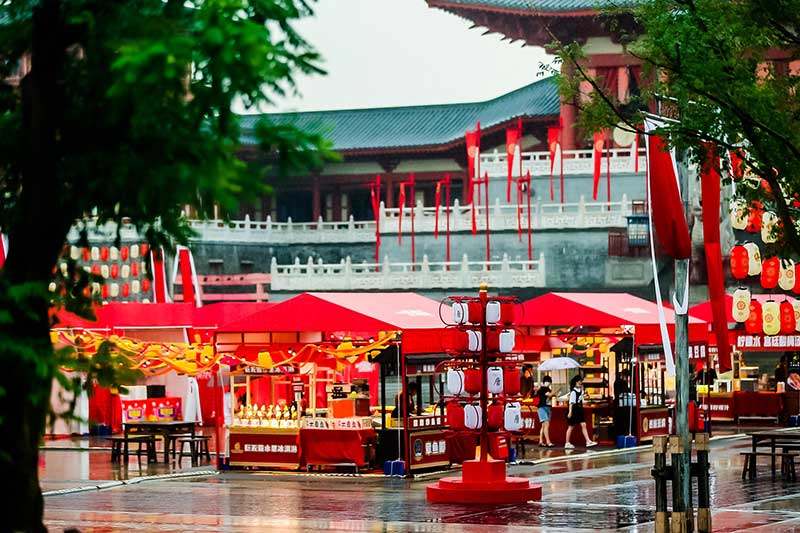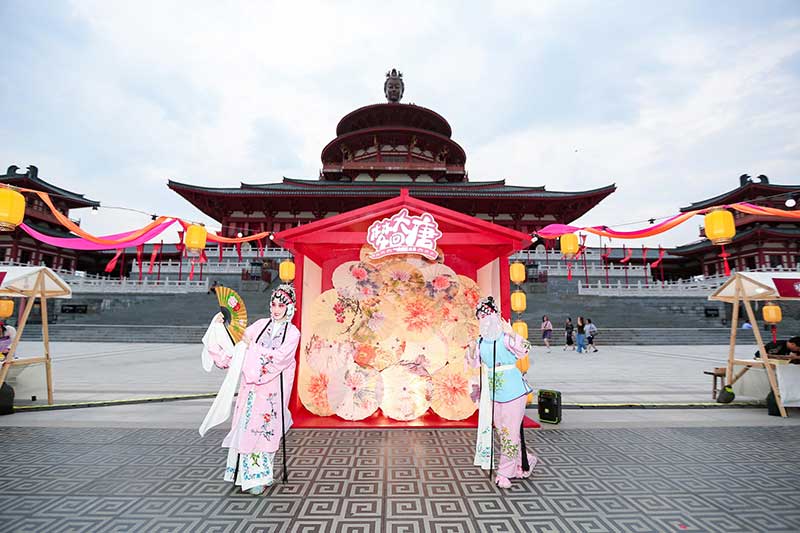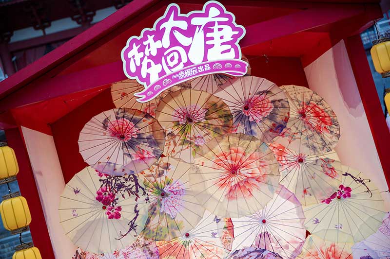 2021暑期华谊兄弟电影世界“盛唐奇幻夜”活动现场还原了大唐市集风貌,电影世界园内处处张灯结彩,古长安平康坊歌舞升平,狄仁杰电影场景再现,沉浸式潮玩大唐。200+专业演员穿梭于市集中,倾情演绎西域公主、绝美歌姬、万国使丞、曲艺杂耍,游客入园即穿越,感受一千四百年前的盛唐奇景。从开市到闭市,从金甲护卫、市井功夫,到宵禁打更、西域风情,每晚12场市集演艺及不间断互动剧情,带您体验盛唐“极乐之宴”!