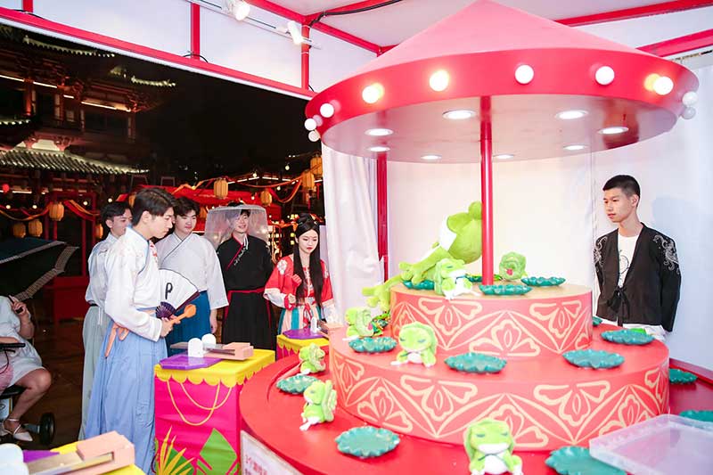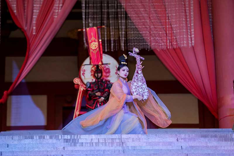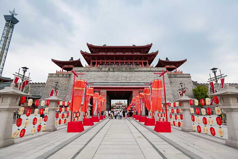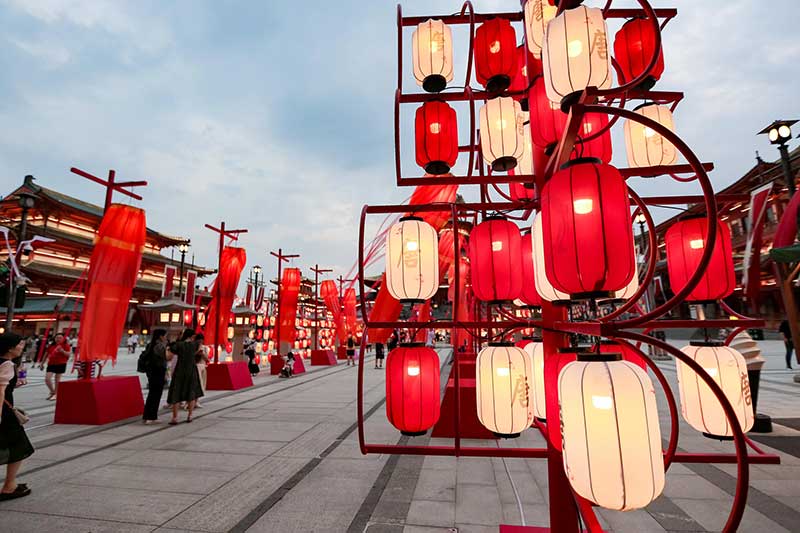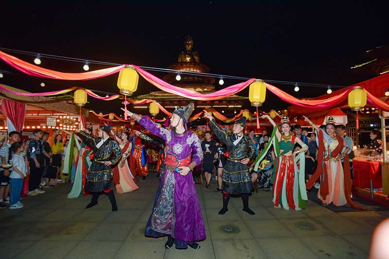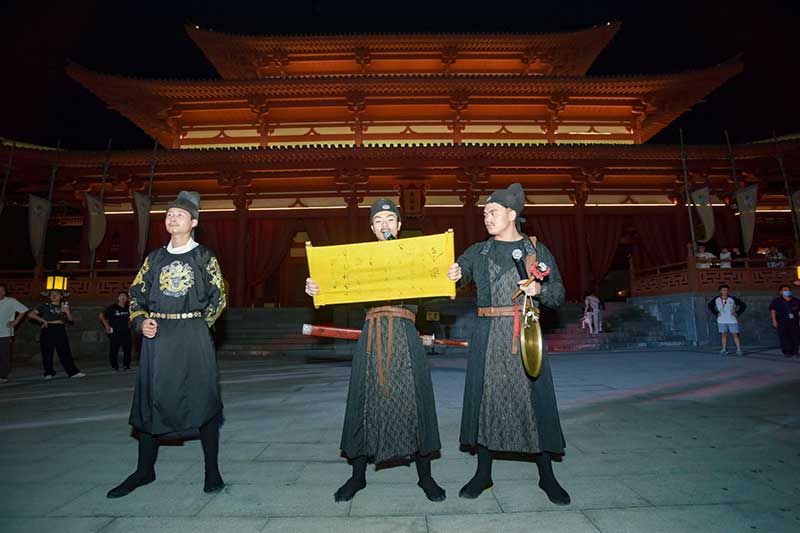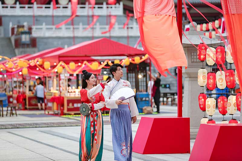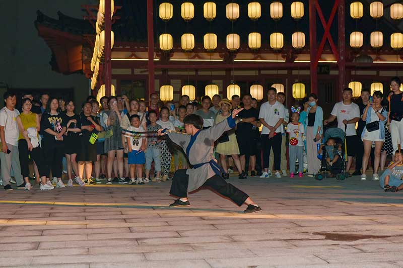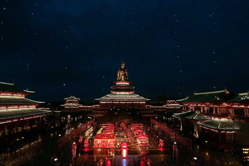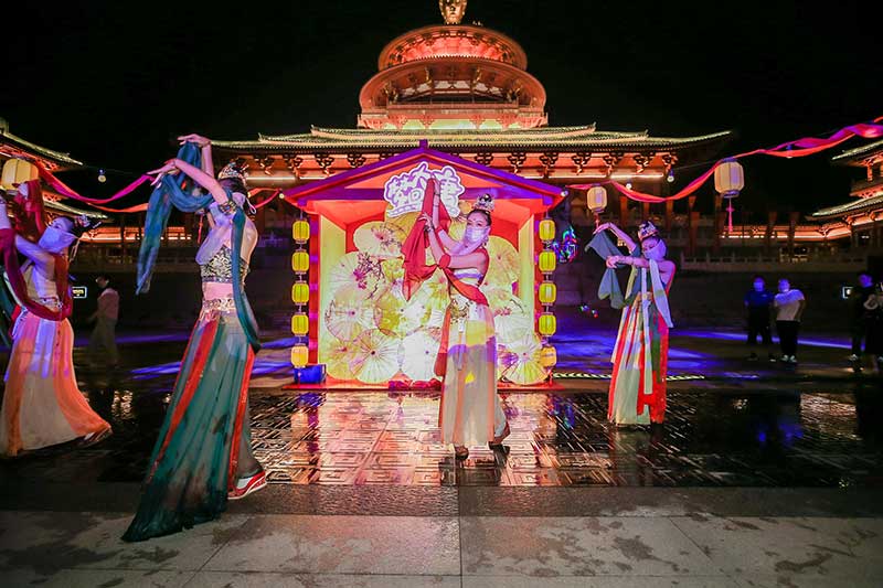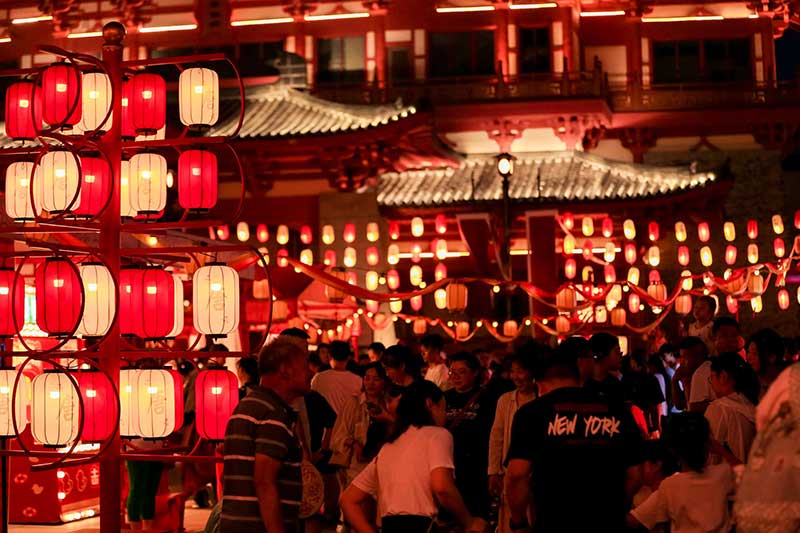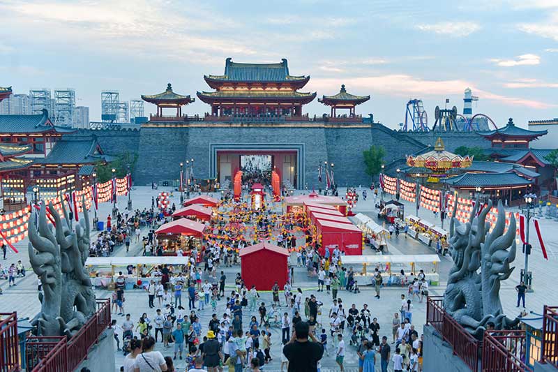 2021暑期华谊兄弟电影世界“盛唐奇幻夜”活动现场还原了大唐市集风貌,电影世界园内处处张灯结彩,古长安平康坊歌舞升平,狄仁杰电影场景再现,沉浸式潮玩大唐。200+专业演员穿梭于市集中,倾情演绎西域公主、绝美歌姬、万国使丞、曲艺杂耍,游客入园即穿越,感受一千四百年前的盛唐奇景。从开市到闭市,从金甲护卫、市井功夫,到宵禁打更、西域风情,每晚12场市集演艺及不间断互动剧情,带您体验盛唐“极乐之宴”!