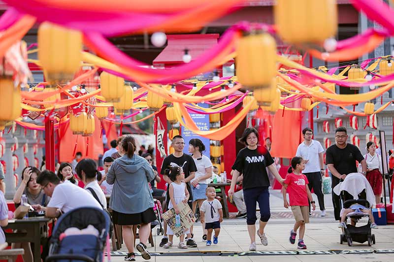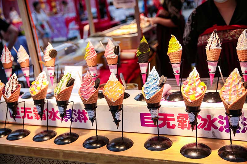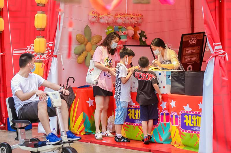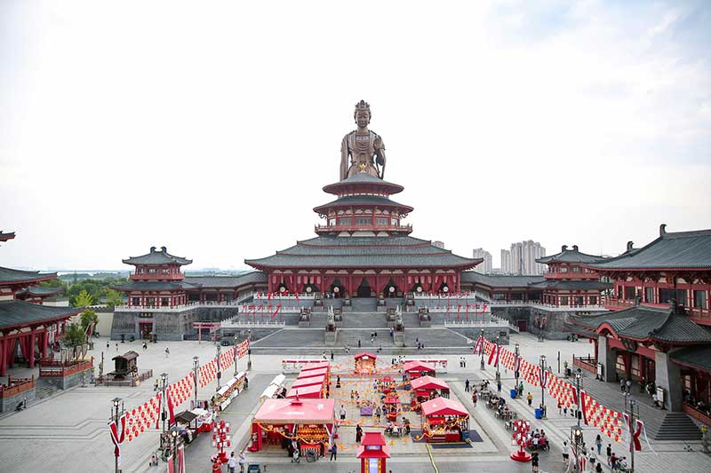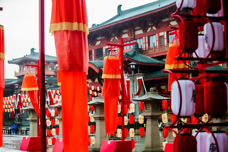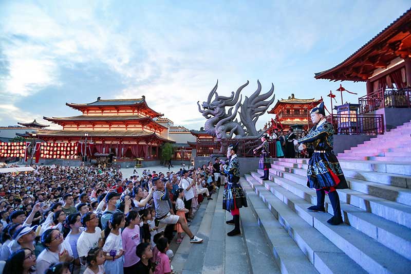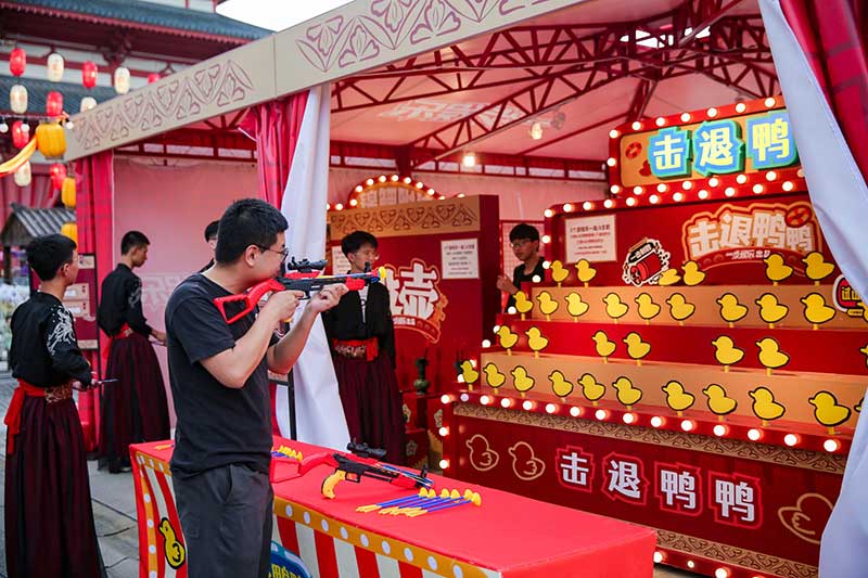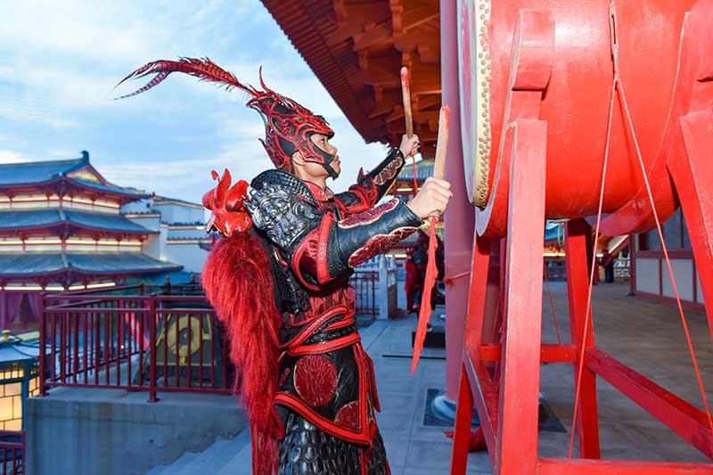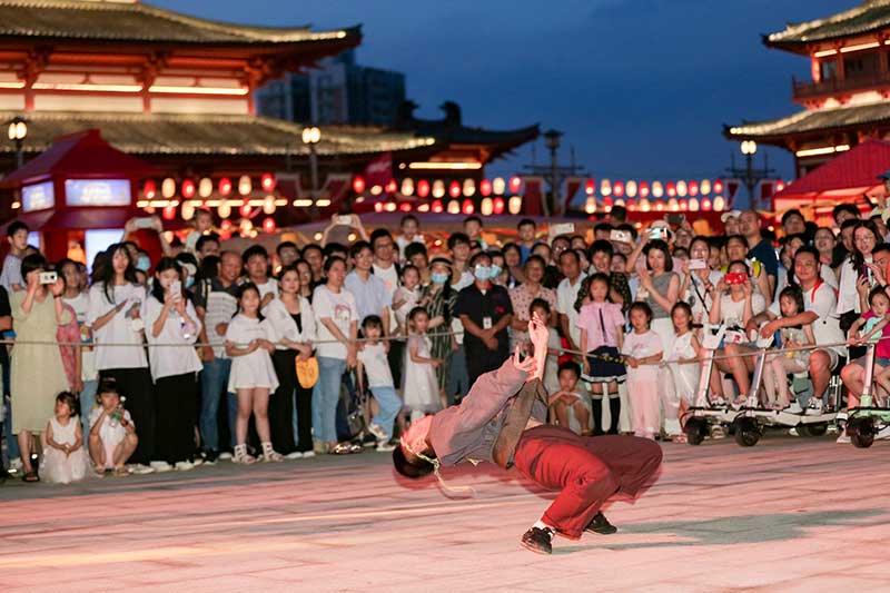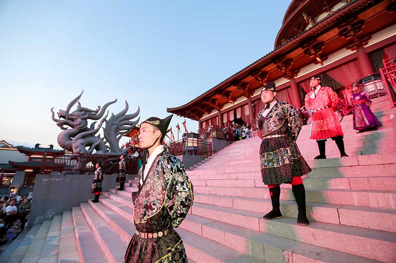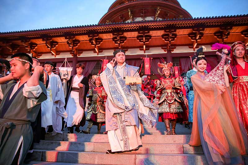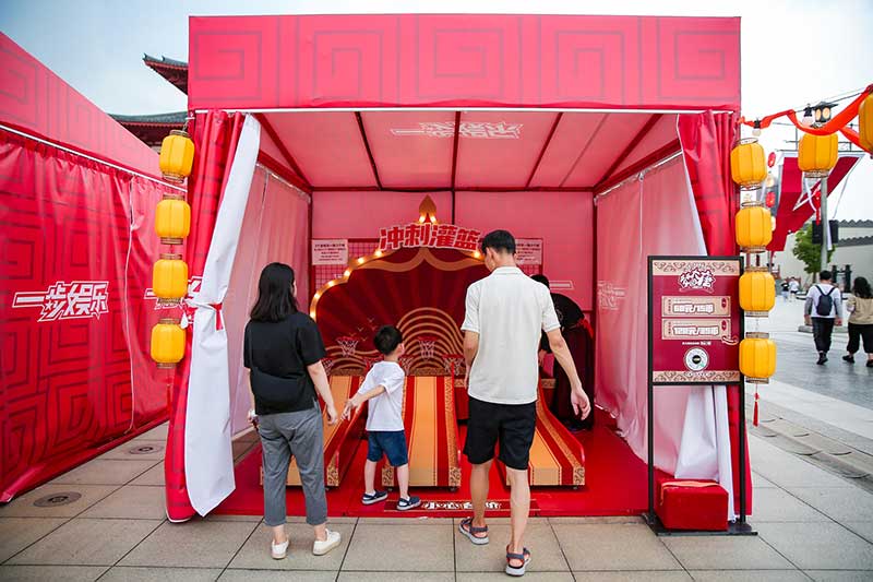 2021暑期华谊兄弟电影世界“盛唐奇幻夜”活动现场还原了大唐市集风貌,电影世界园内处处张灯结彩,古长安平康坊歌舞升平,狄仁杰电影场景再现,沉浸式潮玩大唐。200+专业演员穿梭于市集中,倾情演绎西域公主、绝美歌姬、万国使丞、曲艺杂耍,游客入园即穿越,感受一千四百年前的盛唐奇景。从开市到闭市,从金甲护卫、市井功夫,到宵禁打更、西域风情,每晚12场市集演艺及不间断互动剧情,带您体验盛唐“极乐之宴”!