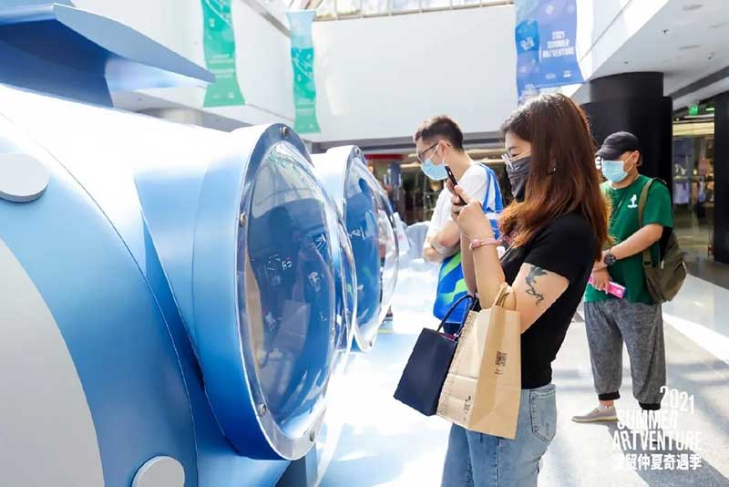 「精灵之境」装置仿佛在城市中上演真实户外生活场景,是一片有“精灵”出没的活力丛林,绿色的草地、帐篷、座椅……瞬间治愈都市人的负面情绪。搭建临时的住所,体验原生态的生活方式,留下珍贵的体验与回忆。「大渔海洋」展现的是人类与海洋共存的场景,参观者可以跟随一艘潜艇,发现深邃之处的奥妙景观。这个场景展示了人类制造的海洋垃圾对海洋生物形成的巨大威胁,具有深刻的环保教育意义。用植物搭建出一个绿色的「梦想充电站」,CHEEZ与超级植物合作打造出一个让植物施展魔法的场景,来自世界各地的超级植物携带的各种的治愈能量,构成了超级植物园的景观。