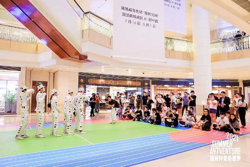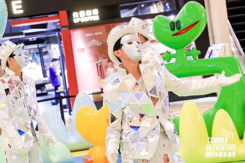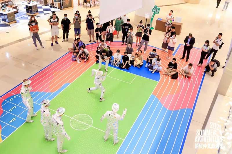 位于北区B2彩虹连廊的「逐梦之路」,是一段链接当下与梦想的通路,步入色彩斑斓隧道,速度与激情相遇,感受大自然发出的活力信号。公共空间的LED显示屏持续滚动播放由艺术家朱金乐Jinle为此次活动创作的独立动画作品,延续了「来乐大草坪」一系列可爱的动物形象,并加入了本次活动的主题元素。空间的探索只是「国贸仲夏奇遇季」的一部分,要让艺术真正在公共空间里“流动”起来,动态的演出和激情四溢的艺术展演内容是必不可少的。