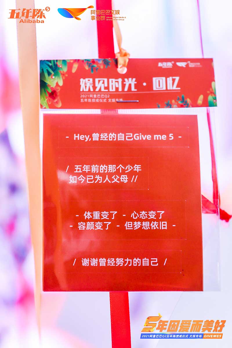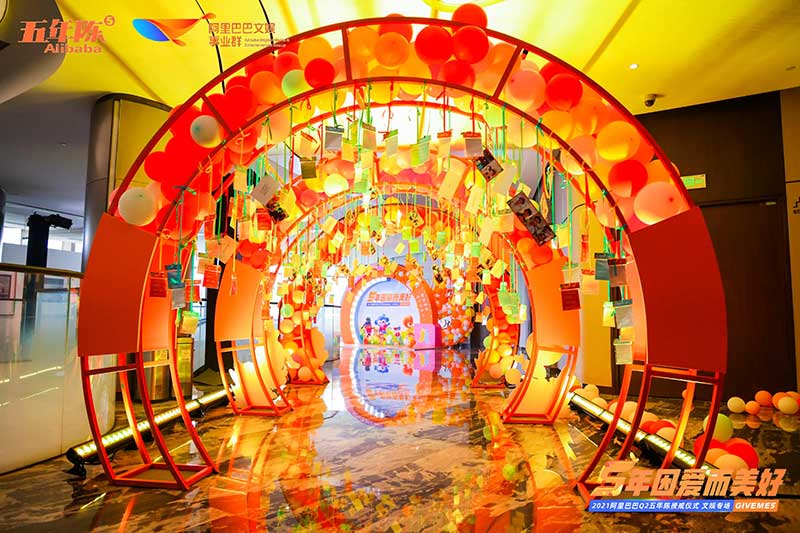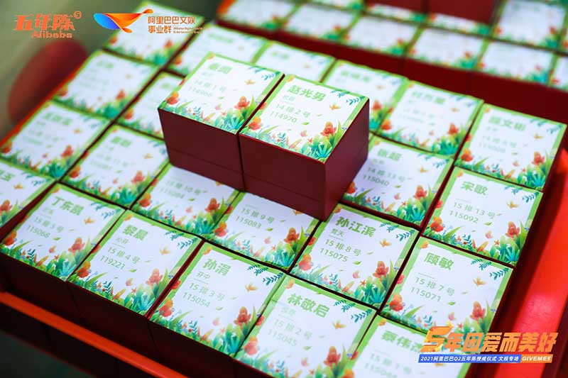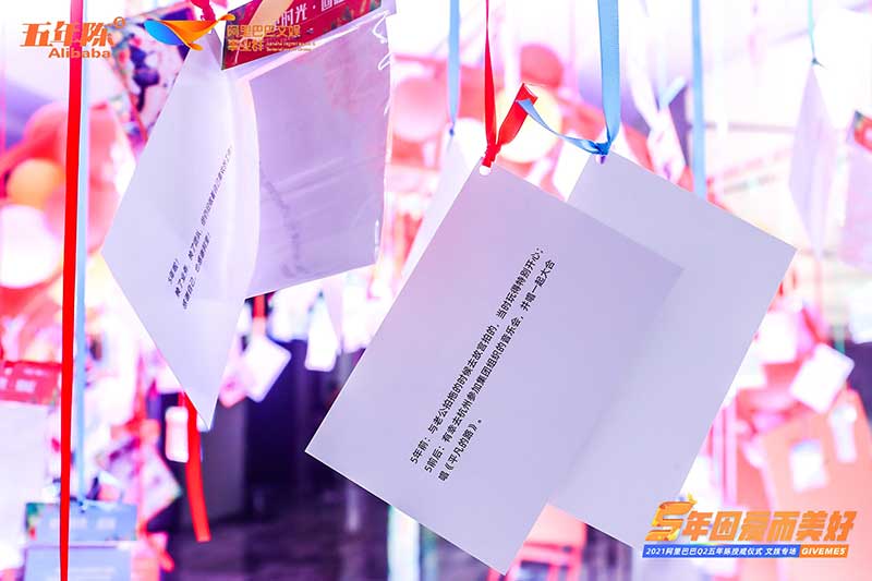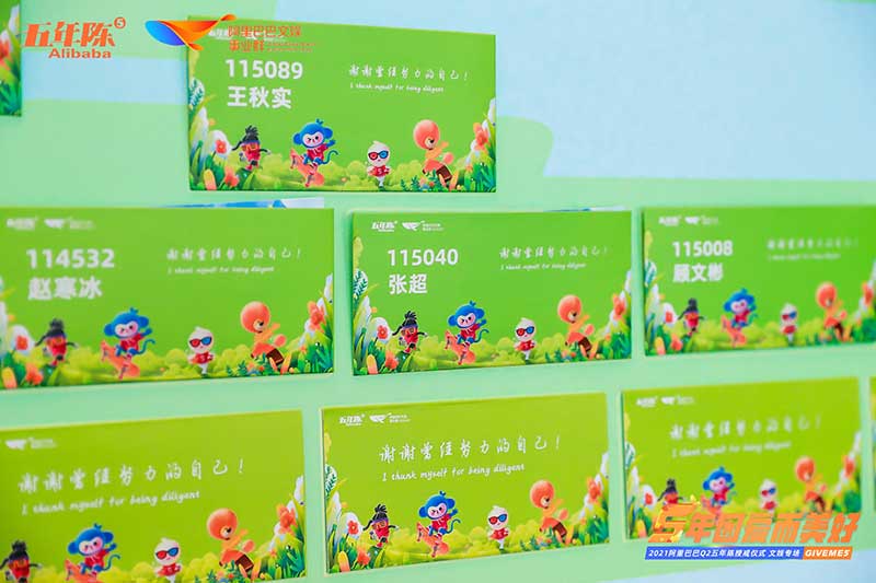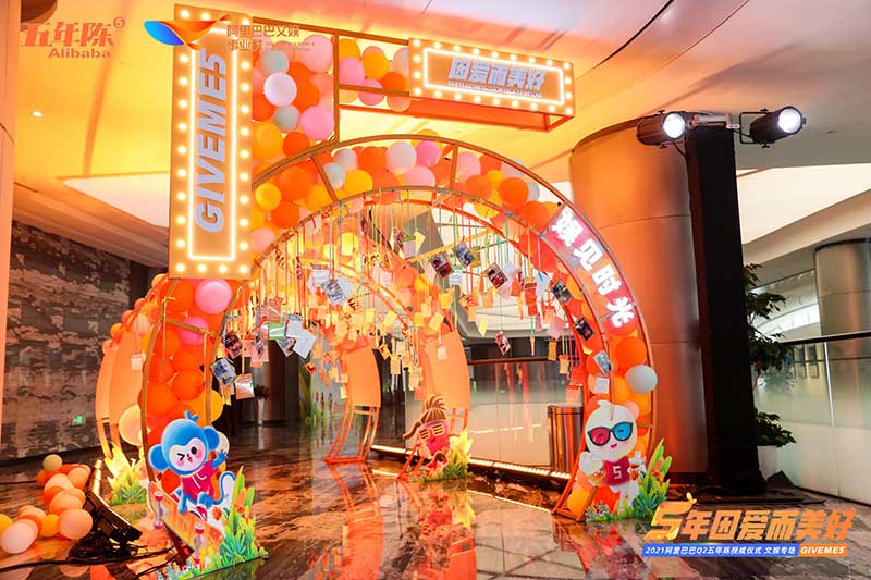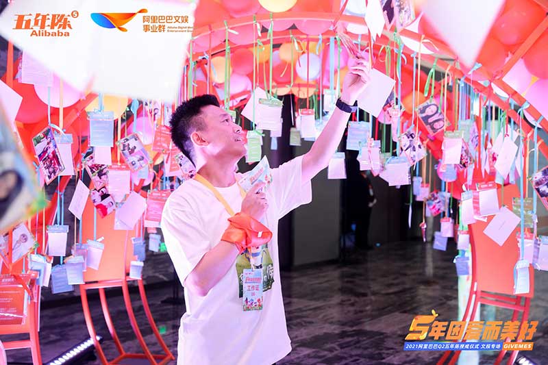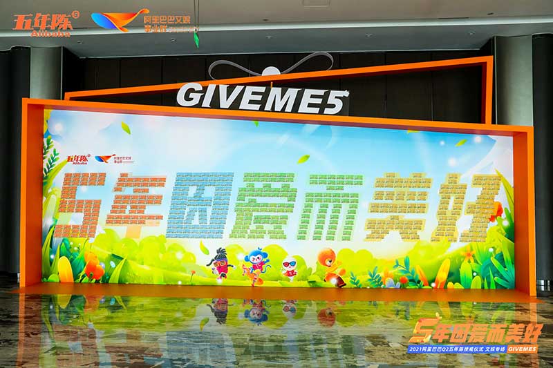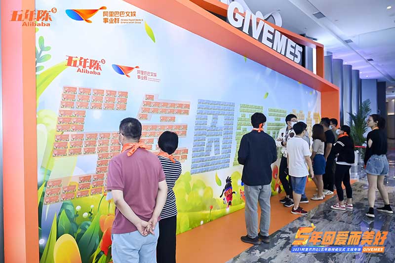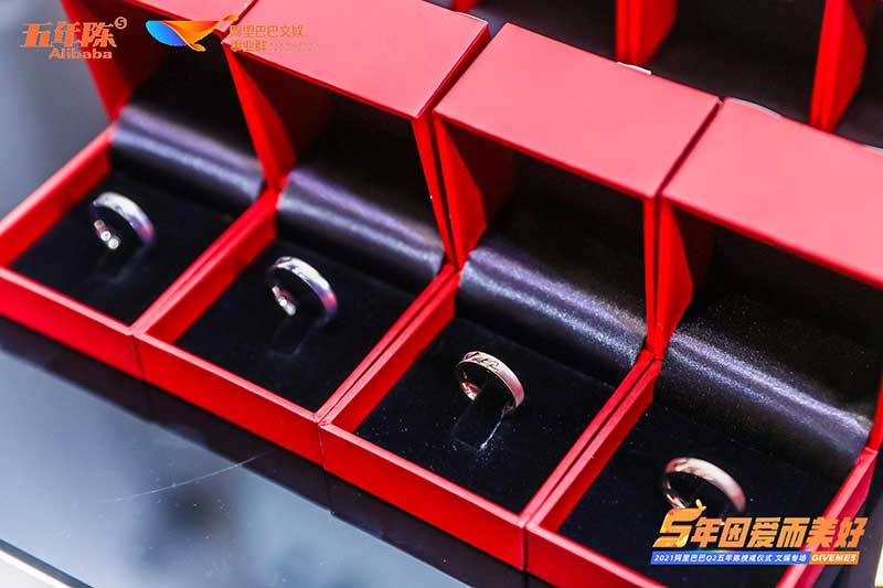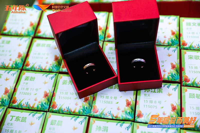 阿里人常说, “一年香,三年醇,五年陈”,我们用酒来形容阿里员工在这里的成长,这就是年陈文化。满五年的阿里人,都会拿到一枚定制的白金戒指,它代表相信,也寓意传承。除了戒指以外,其他环节也颇有仪式感,进入内场,是阿里给每一位到场员工信封拼接的活动主题墙,信封上还用心的写上了员工的名字,签到领取五年陈定制丝巾后,即到主题墙前领取属于自己的信。进入主会场的通道不仅以“5”作为造型,里面也是大有玄机,是到场员工在阿里五年的照片布置而成,员工们纷纷找到自己的照片并惊喜合影。