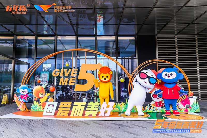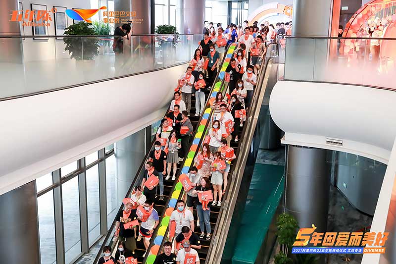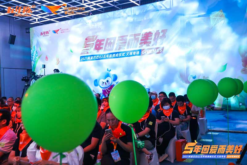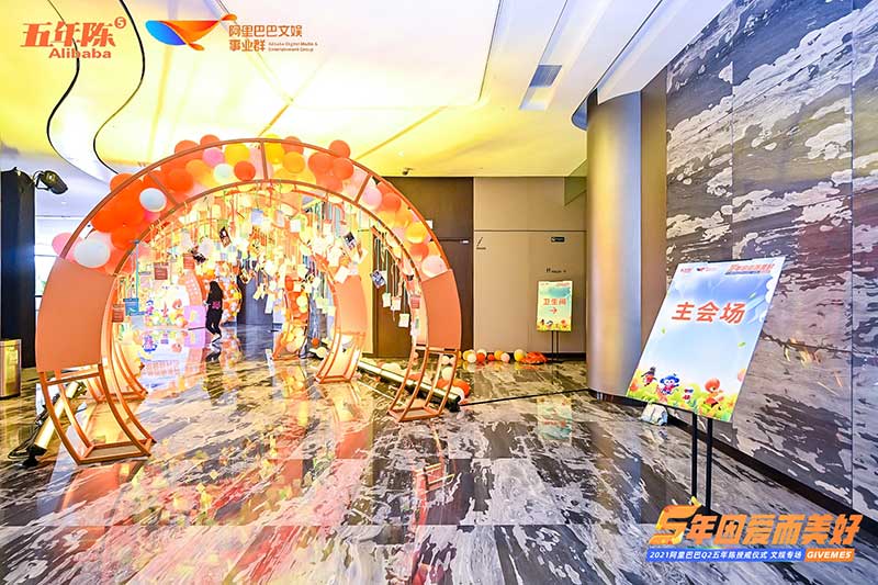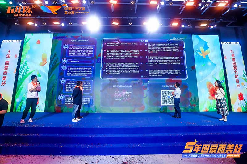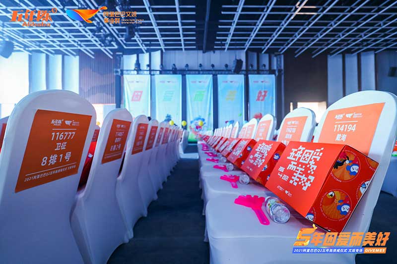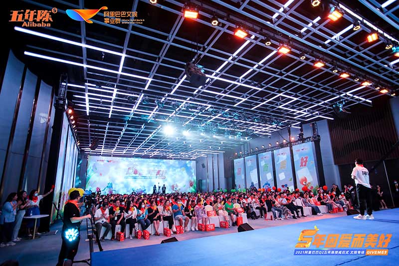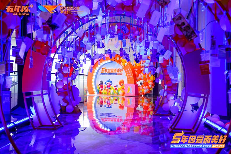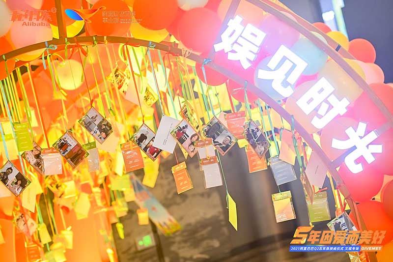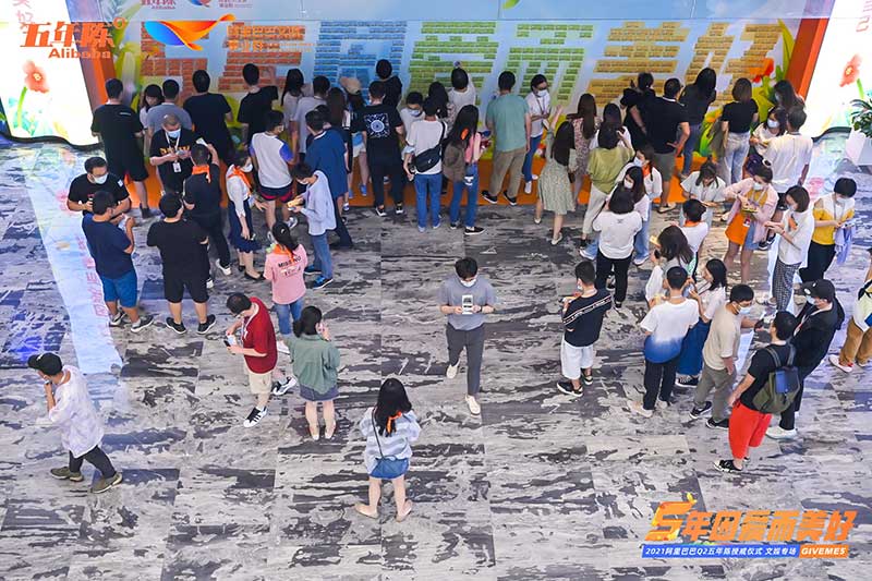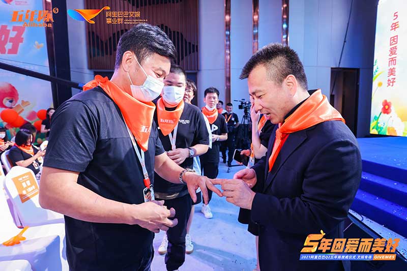 阿里人常说, “一年香,三年醇,五年陈”,我们用酒来形容阿里员工在这里的成长,这就是年陈文化。满五年的阿里人,都会拿到一枚定制的白金戒指,它代表相信,也寓意传承。除了戒指以外,其他环节也颇有仪式感,进入内场,是阿里给每一位到场员工信封拼接的活动主题墙,信封上还用心的写上了员工的名字,签到领取五年陈定制丝巾后,即到主题墙前领取属于自己的信。进入主会场的通道不仅以“5”作为造型,里面也是大有玄机,是到场员工在阿里五年的照片布置而成,员工们纷纷找到自己的照片并惊喜合影。