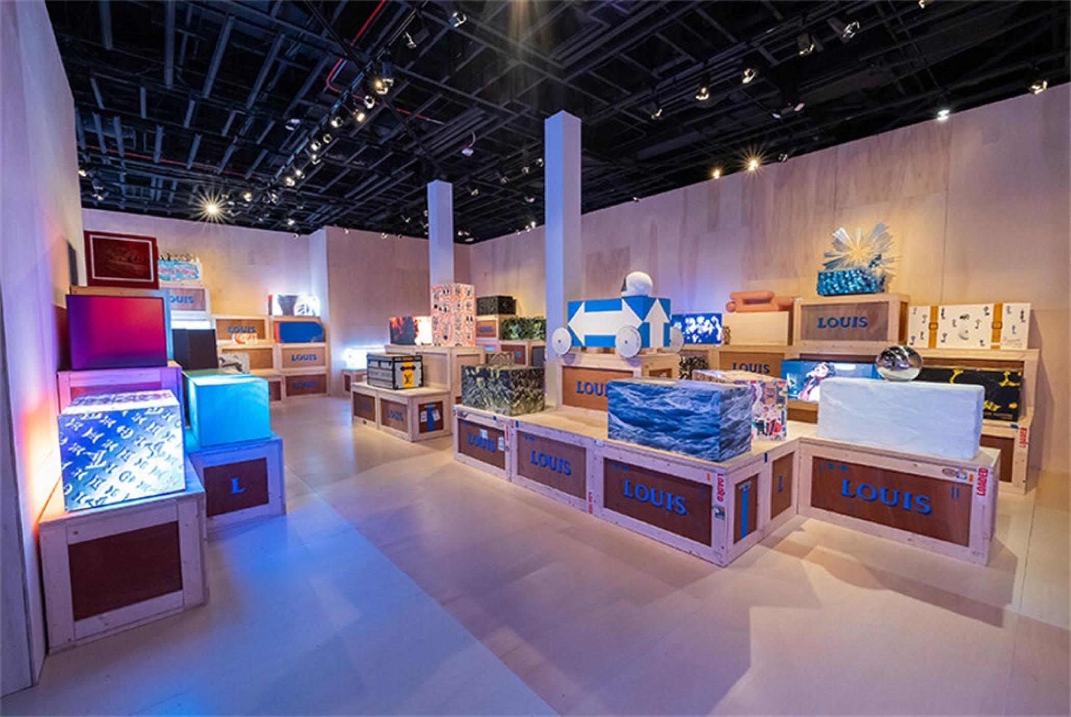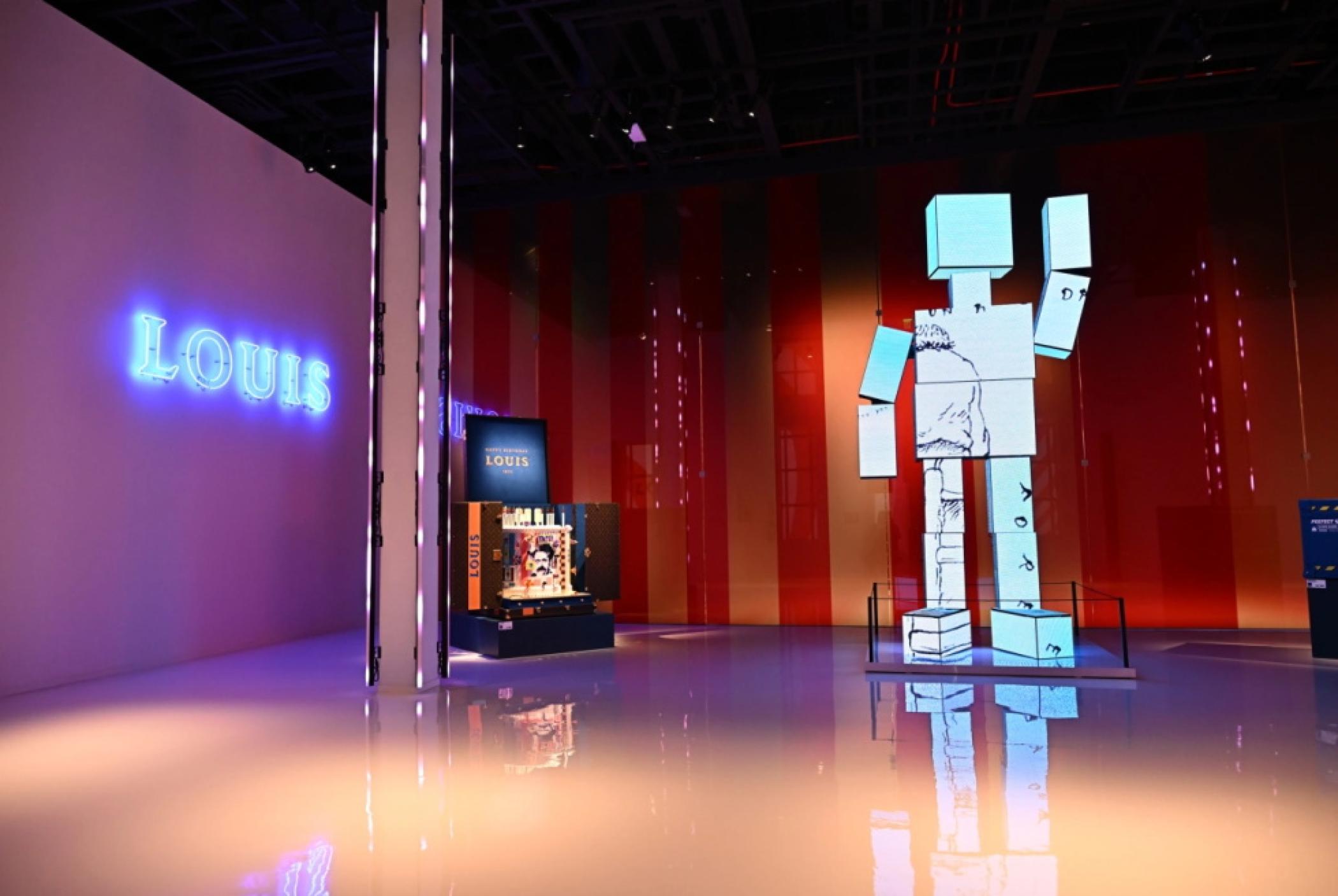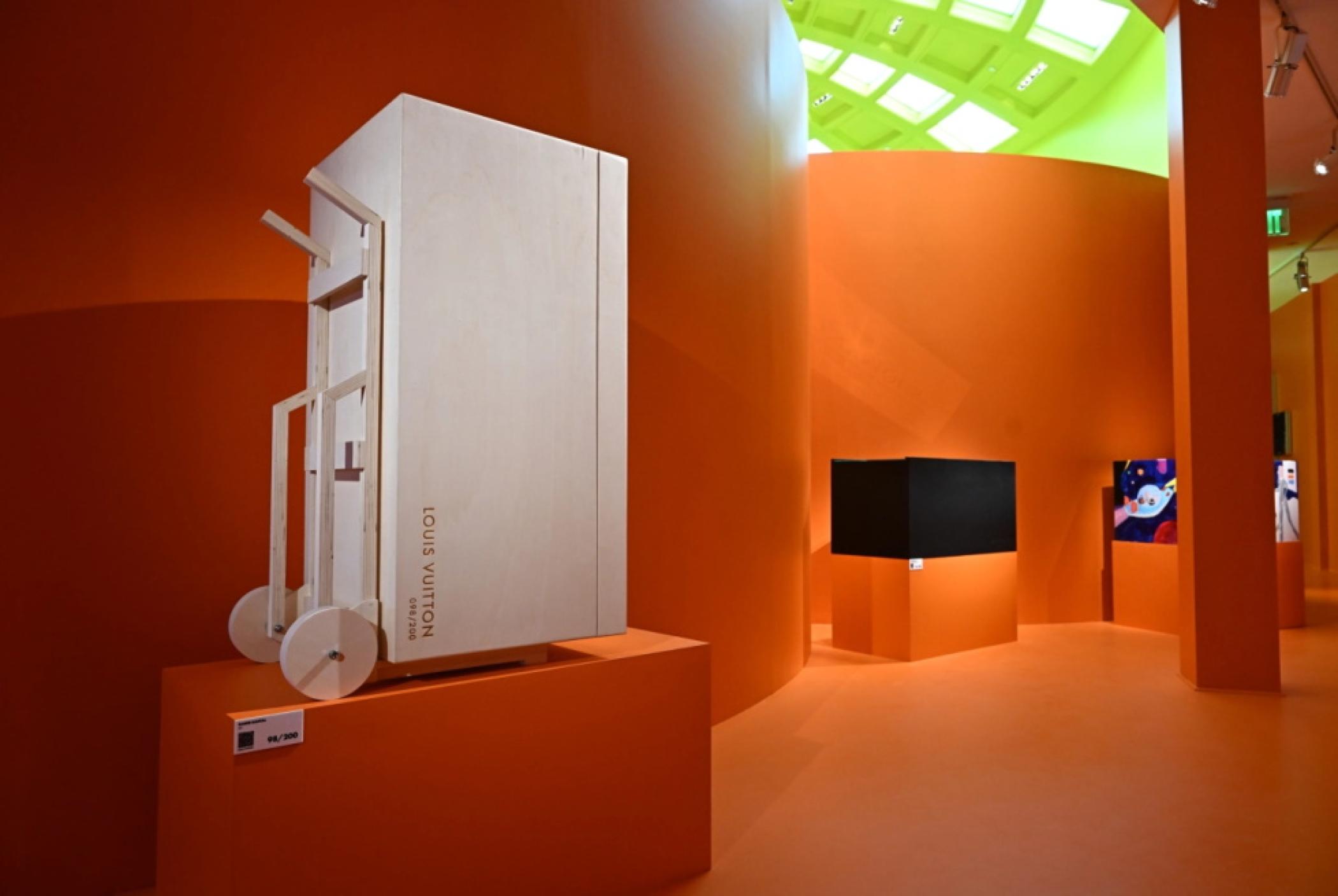 路易.威登(Louis Vuitton)的“200个行李箱200个梦想家”展览占据了一整座建筑,其大窗户被充满活力的条纹包裹着。一旦进入室内,游客将会遇到一个“机器人”造型的行李箱,在那里,一个个镶嵌着数字屏幕的行李箱——“魔盒”——连接着近200年历史的过去和未来。