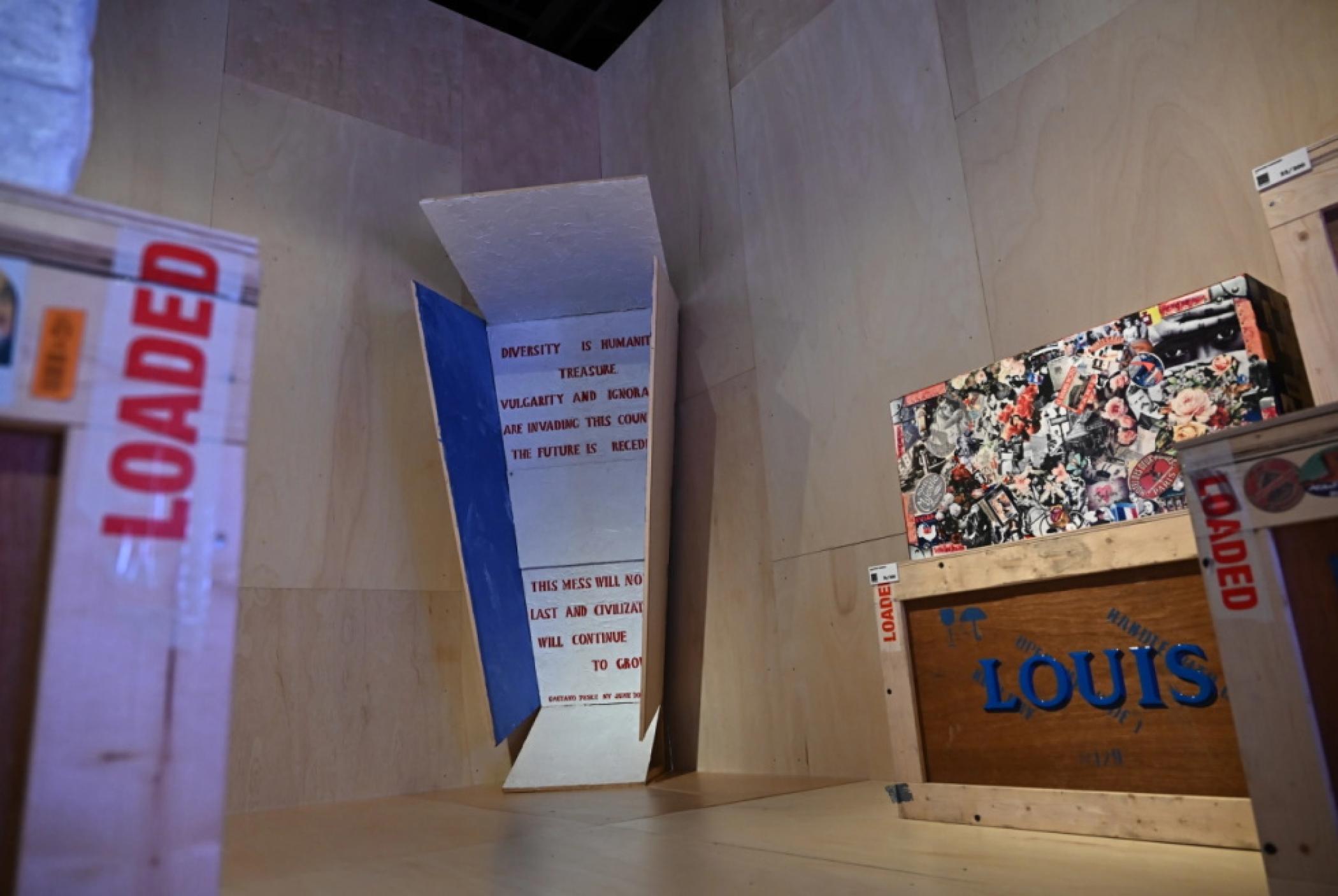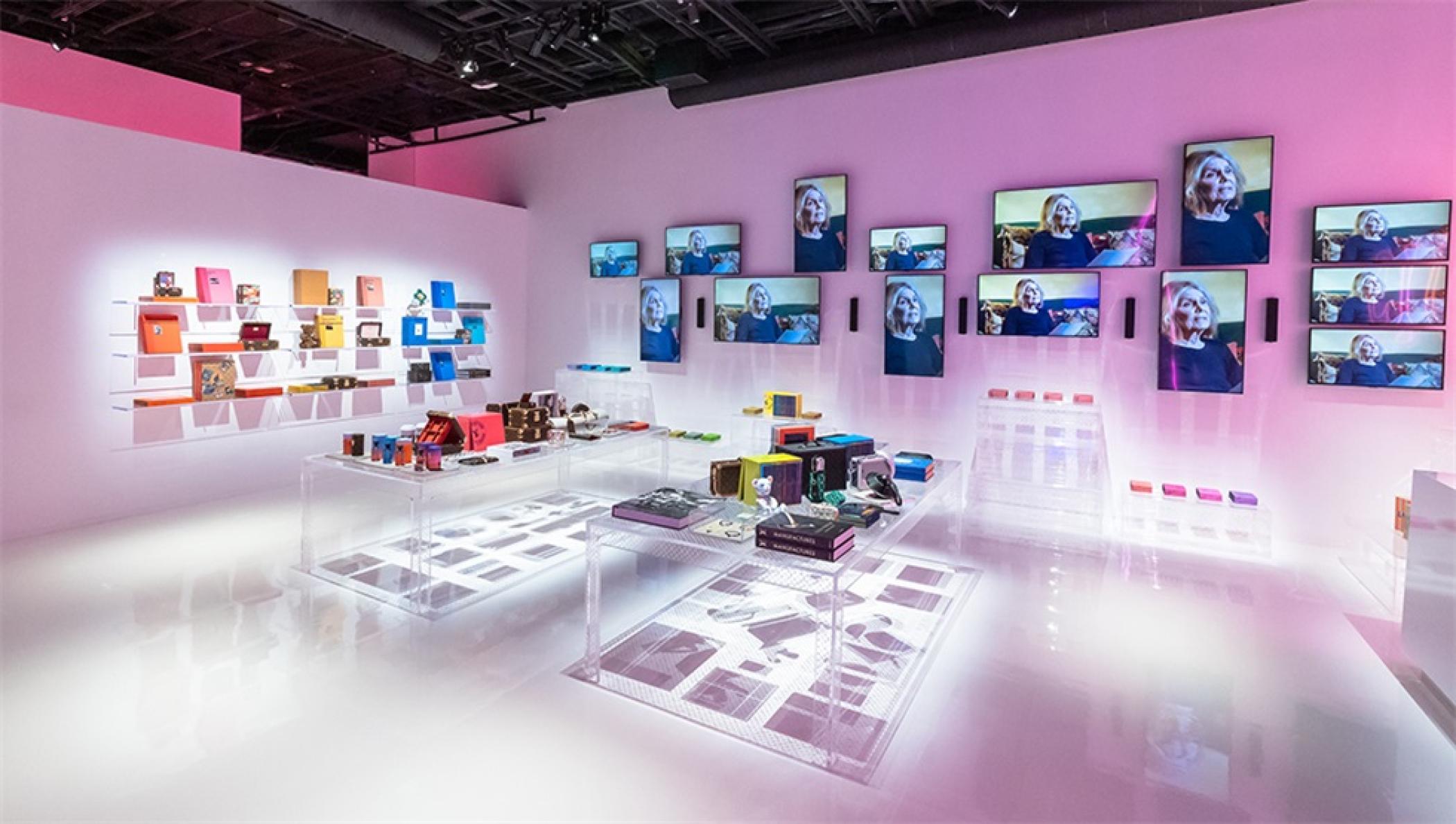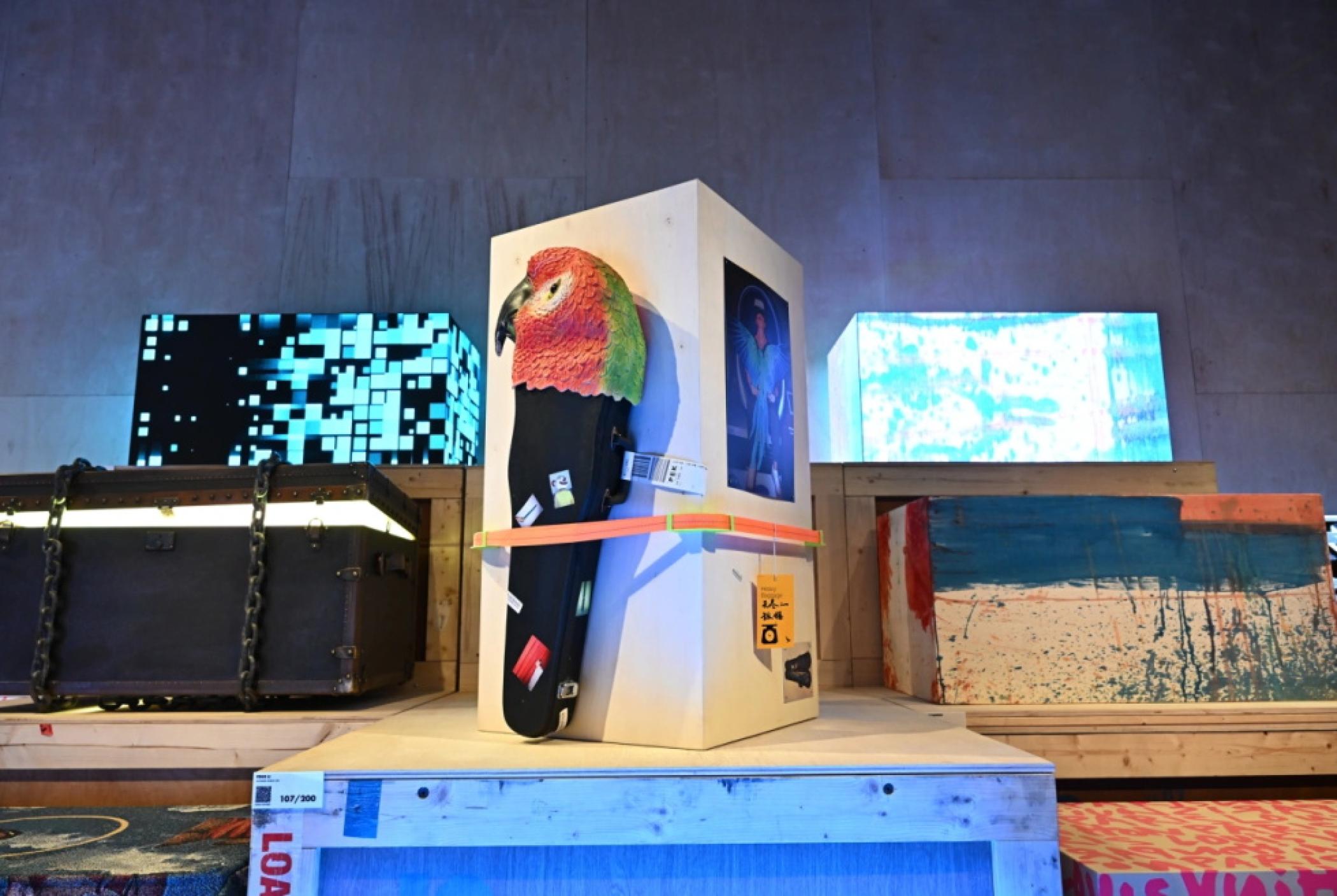 两个主要空间中的第一个的设计思路看起来像是来自仓库的灵感。箱子以一种交错但隐约带有雕塑感的排列方式,与带有屏幕的“魔法箱”并列在一起,每个箱子都堆放在从法国运来时的板条箱上,这些板条箱上还有各种原始的运输标签。