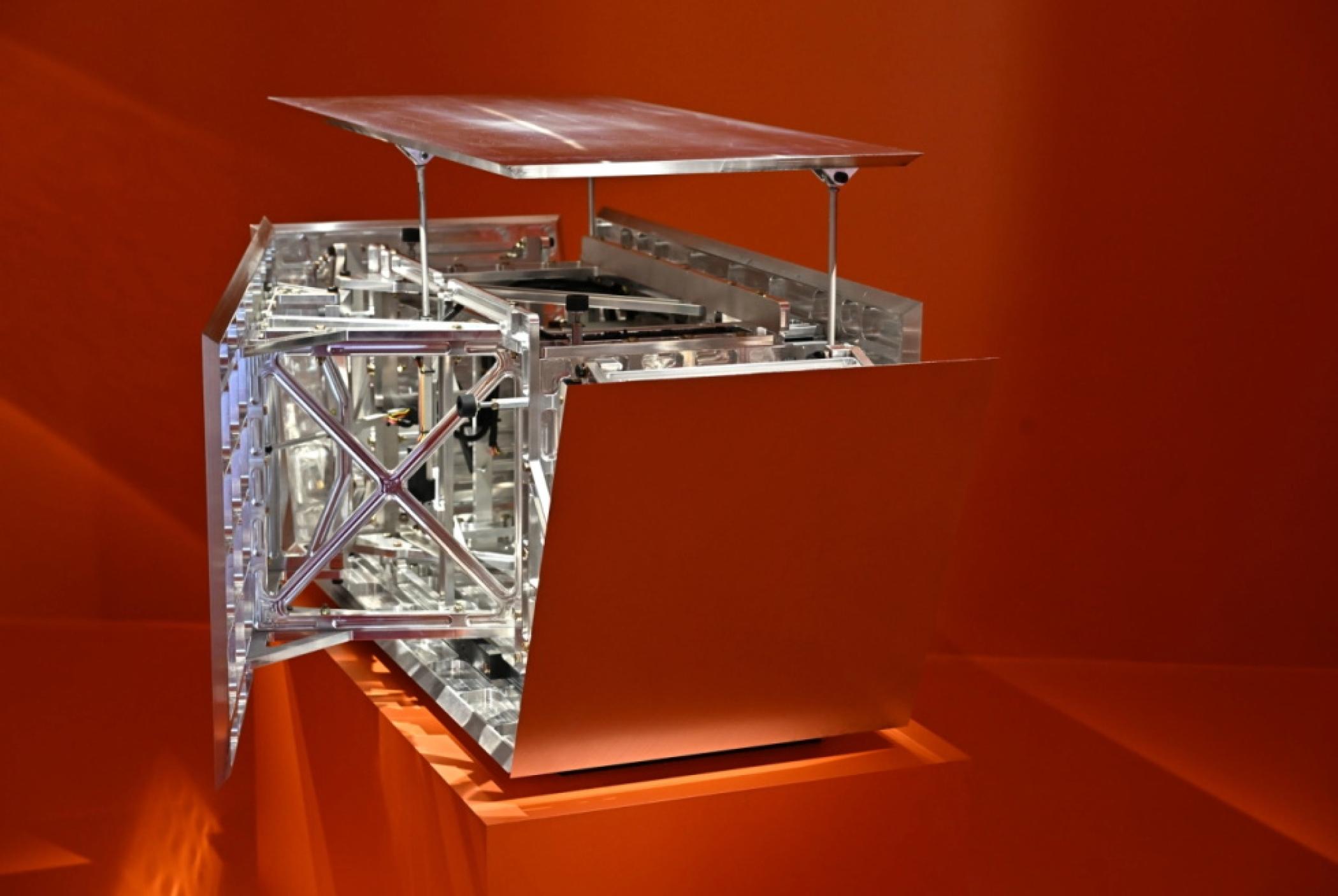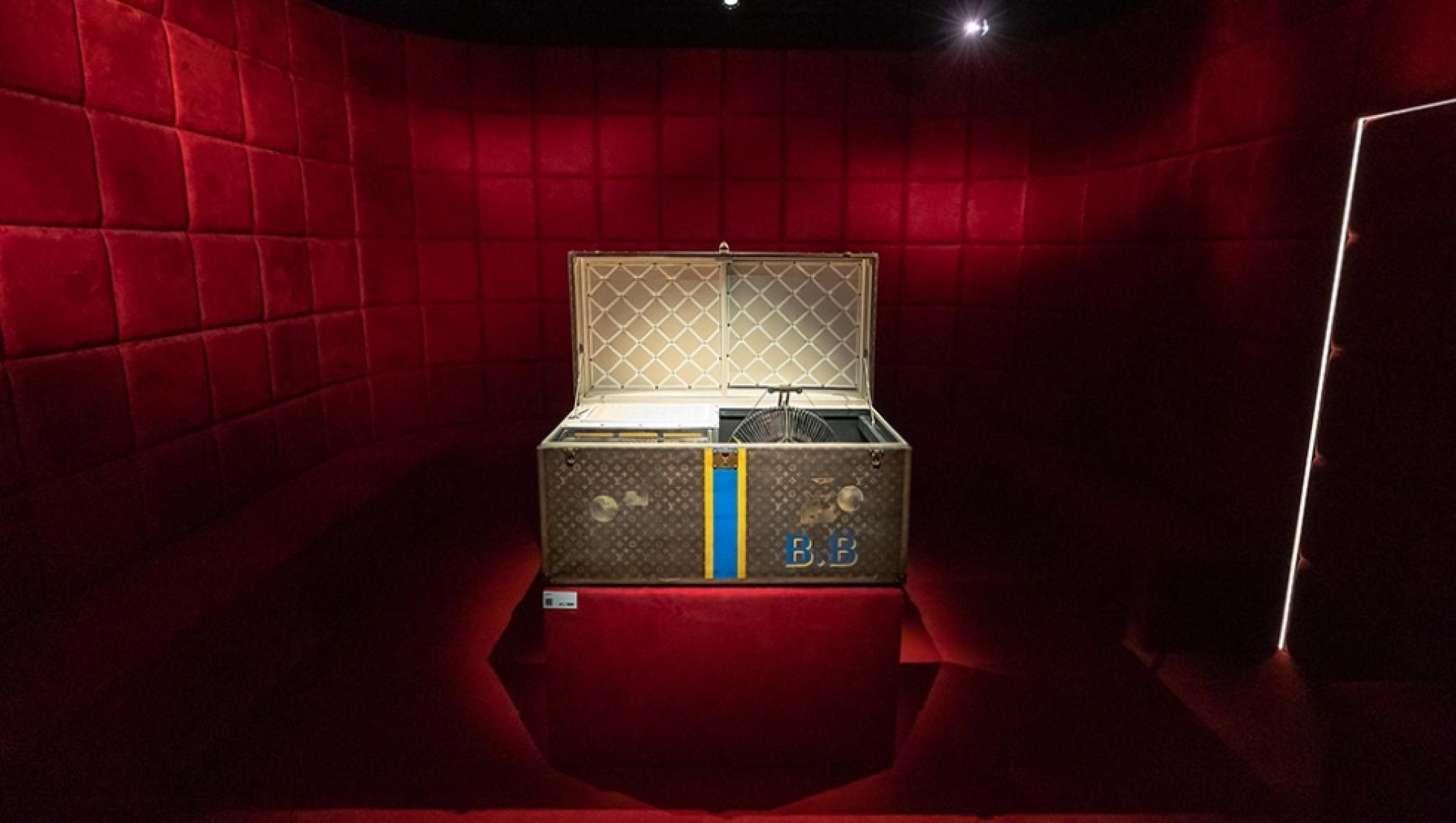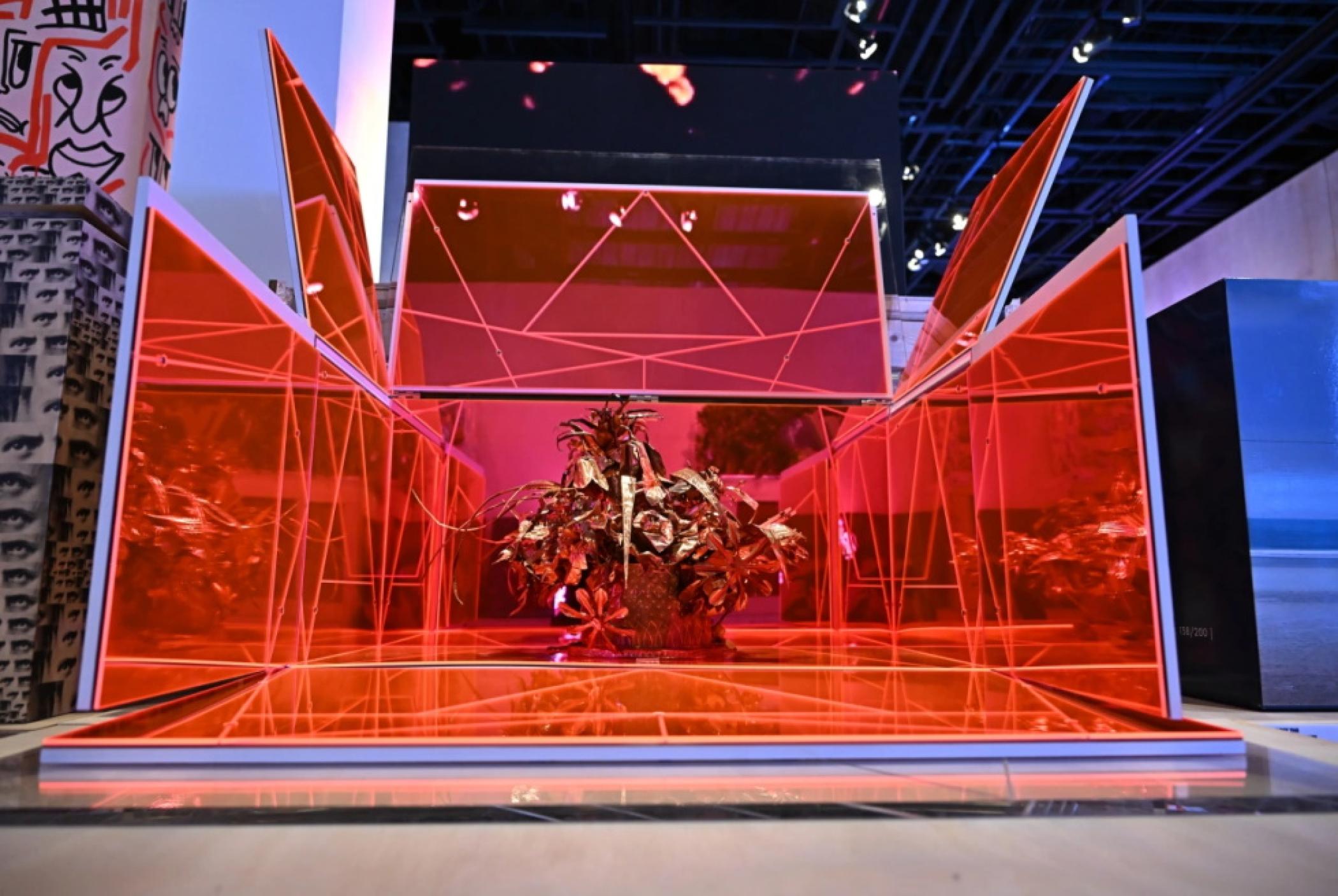 两个主要空间中的第一个的设计思路看起来像是来自仓库的灵感。箱子以一种交错但隐约带有雕塑感的排列方式,与带有屏幕的“魔法箱”并列在一起,每个箱子都堆放在从法国运来时的板条箱上,这些板条箱上还有各种原始的运输标签。