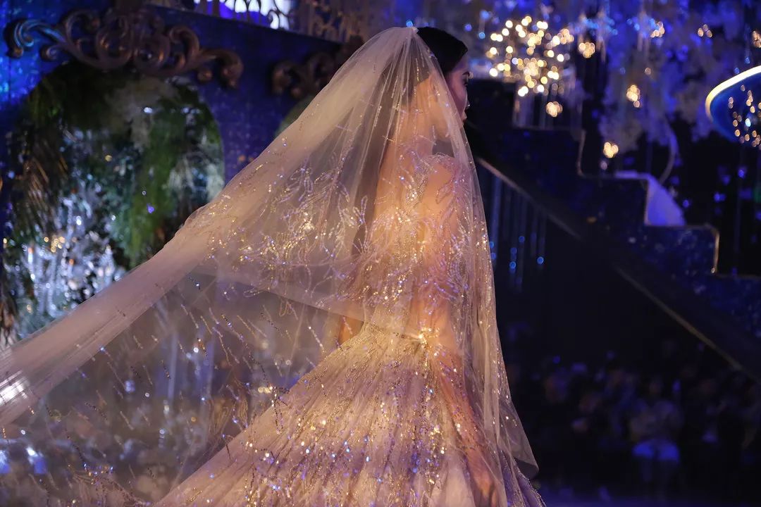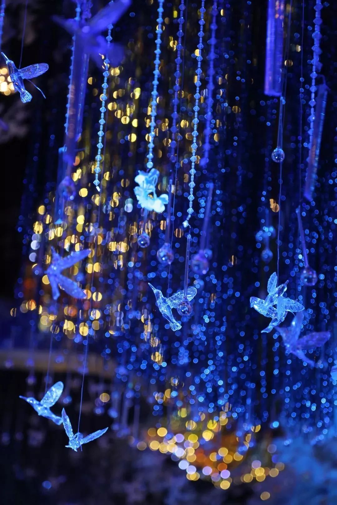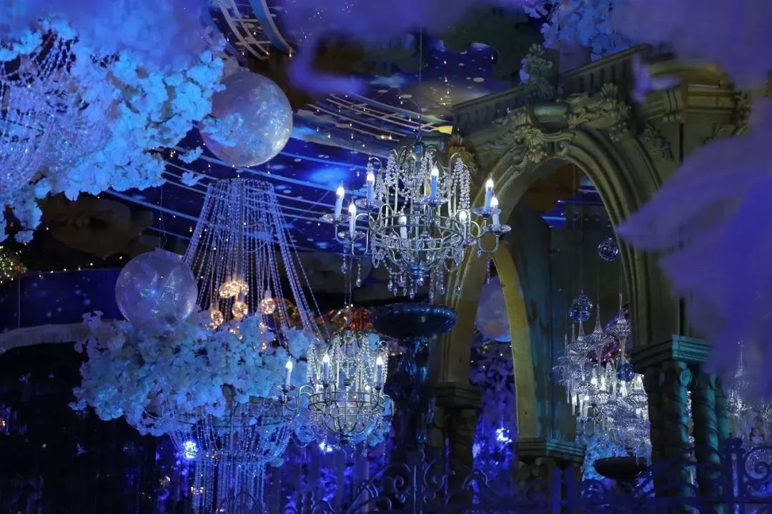 围绕着这场潮盛的婚礼,以光影为主色调,白色的裙摆染上蓝色灯光,呈现出优雅复古的味道。