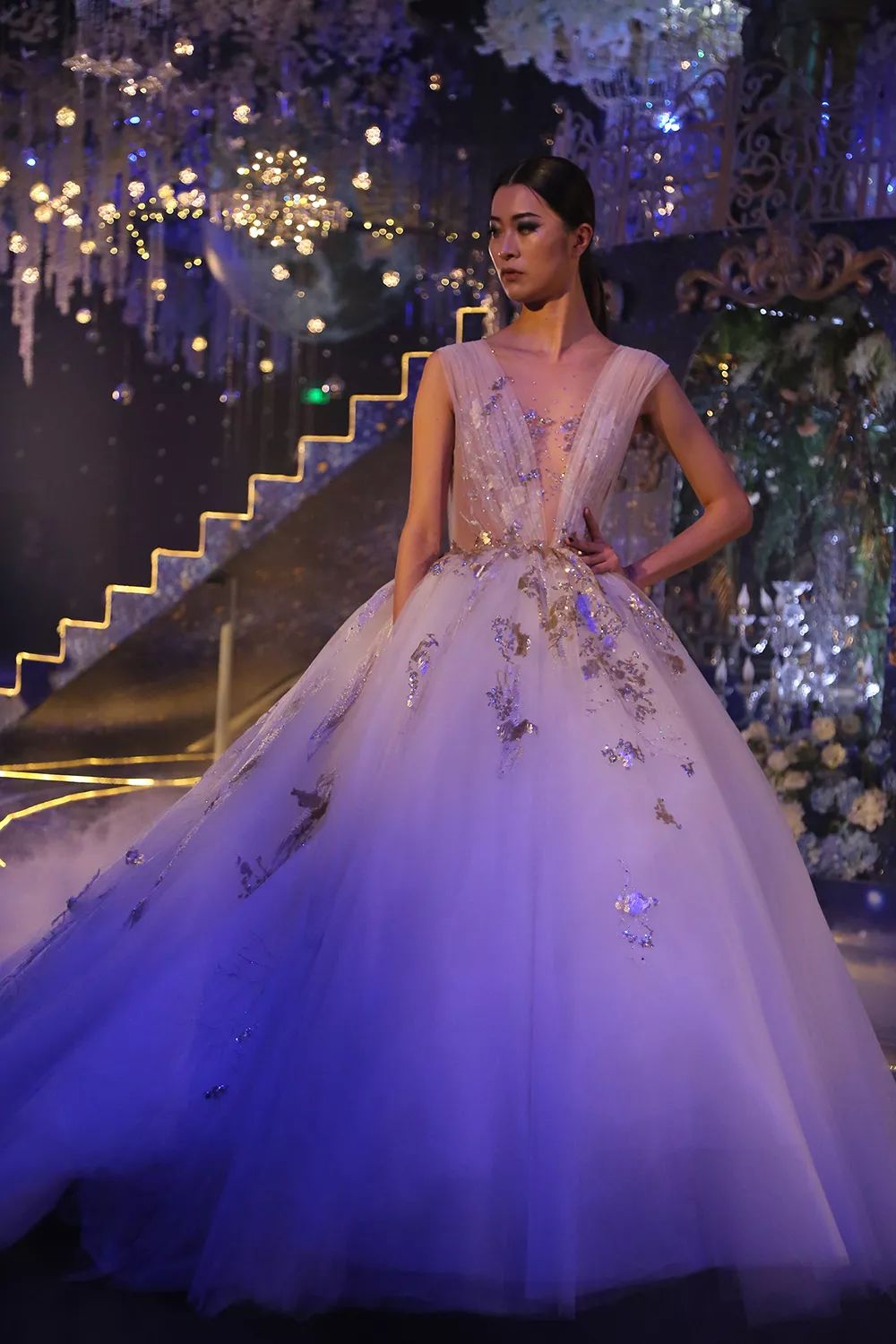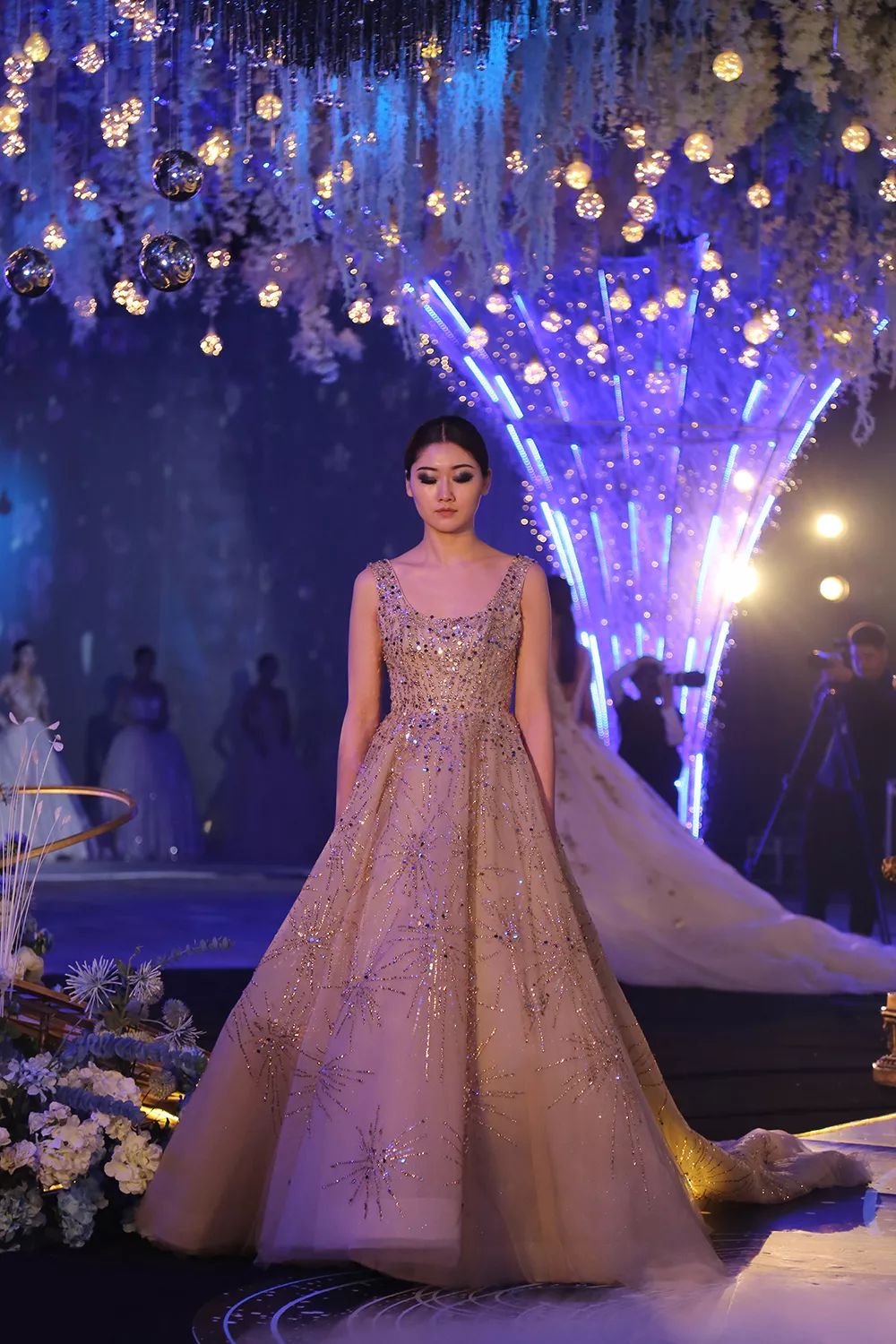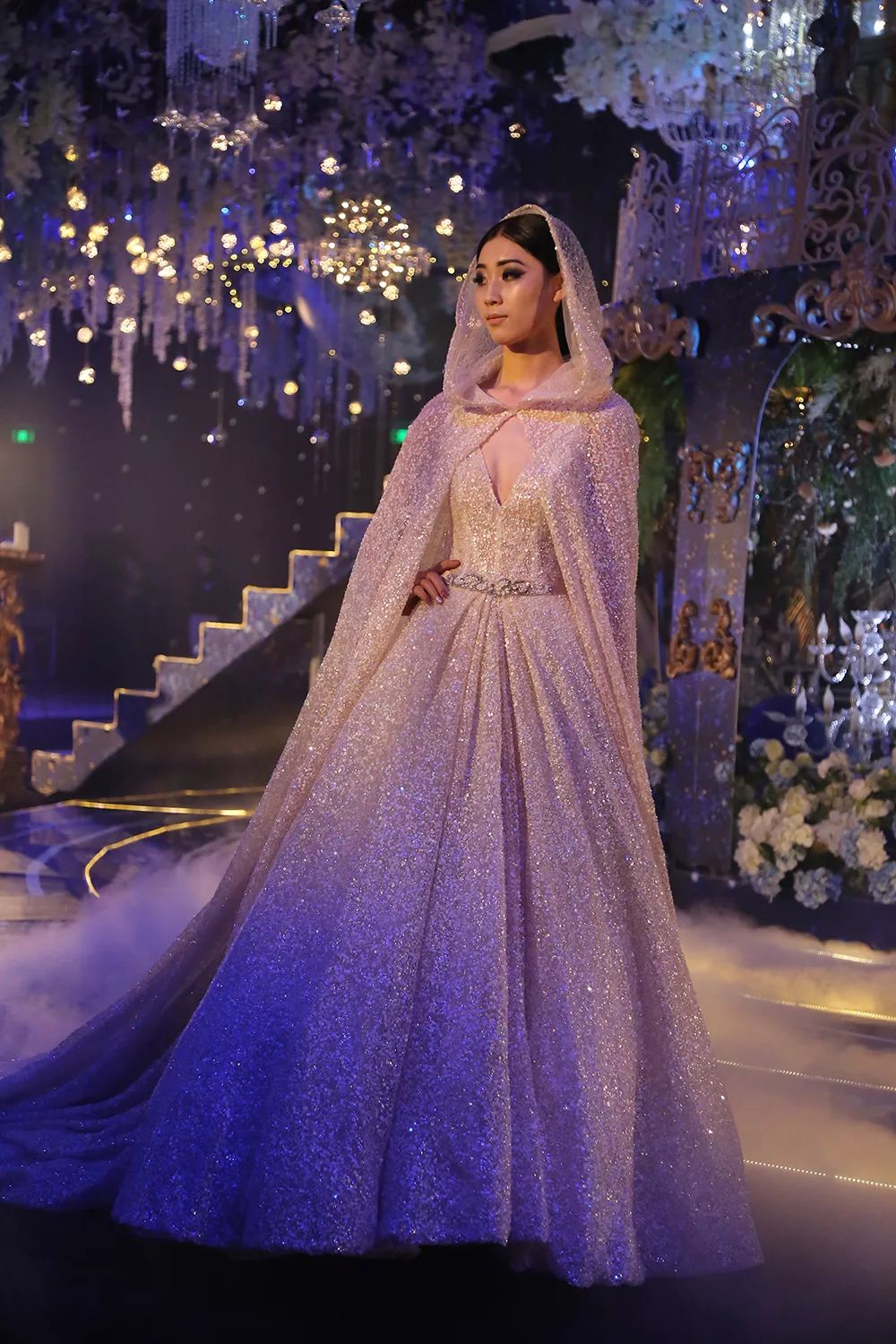 围绕着这场潮盛的婚礼,以光影为主色调,白色的裙摆染上蓝色灯光,呈现出优雅复古的味道。