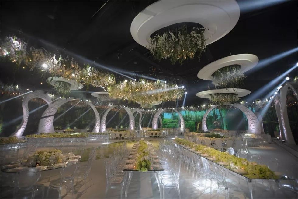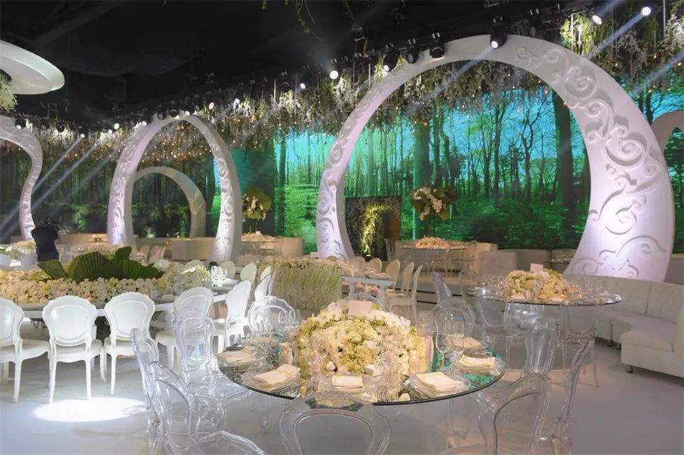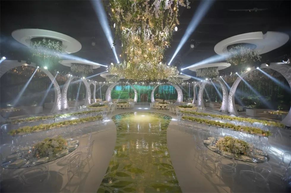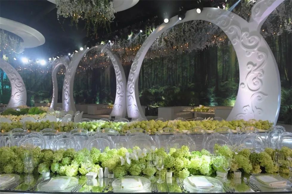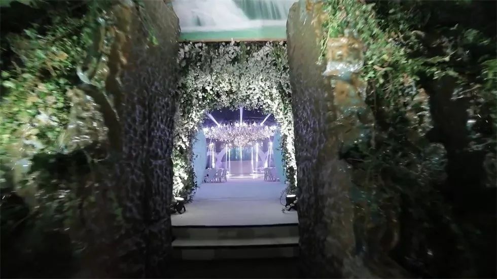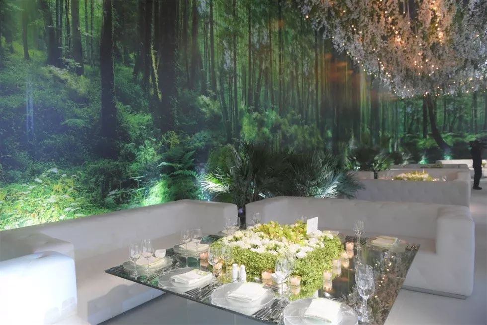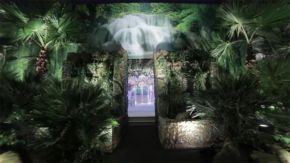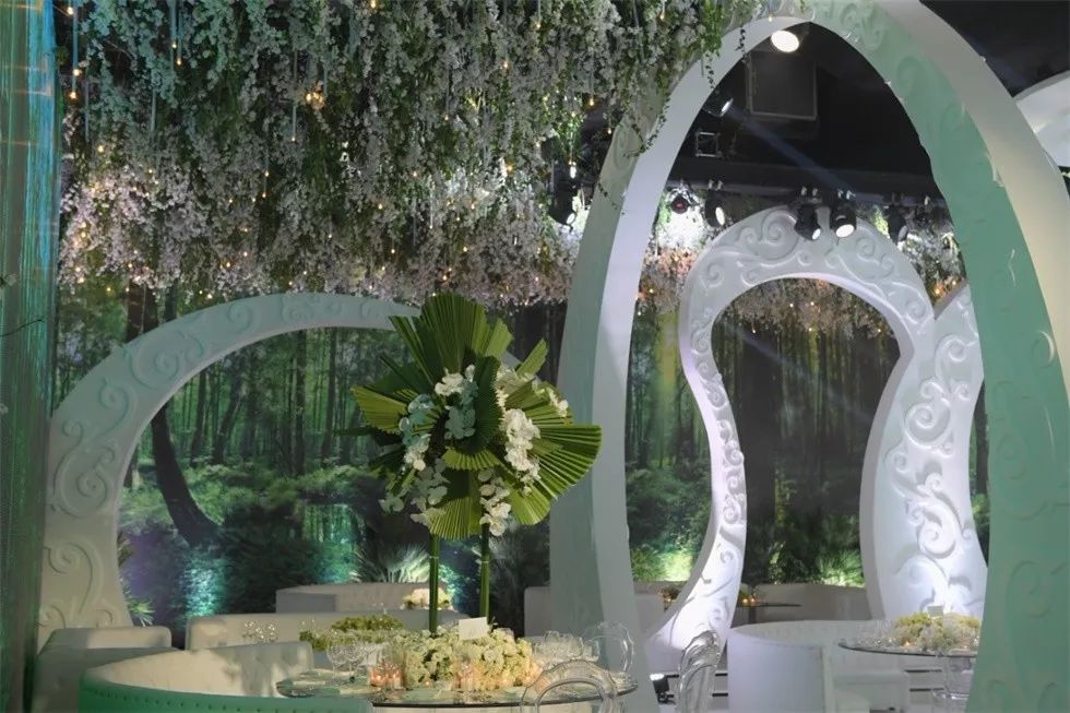 森林系的舞美设计你见过几个呢?这次的舞美设计不是某个公关活动,而是一场主题婚礼。现场的来宾等候休息区的设计反映了在森林中的感觉,这里完全被各种不同的树木和丰富的花卉包围。颜色范围从奶油色调到以平静心情的绿色。休息区散布着热带风格树木,客人们就身处在这样的绿色环境中闲谈聊天。婚礼正式开始前,石墙打开,客人们进入到主宴会厅。