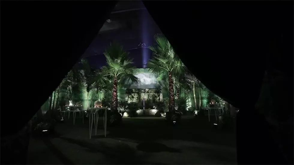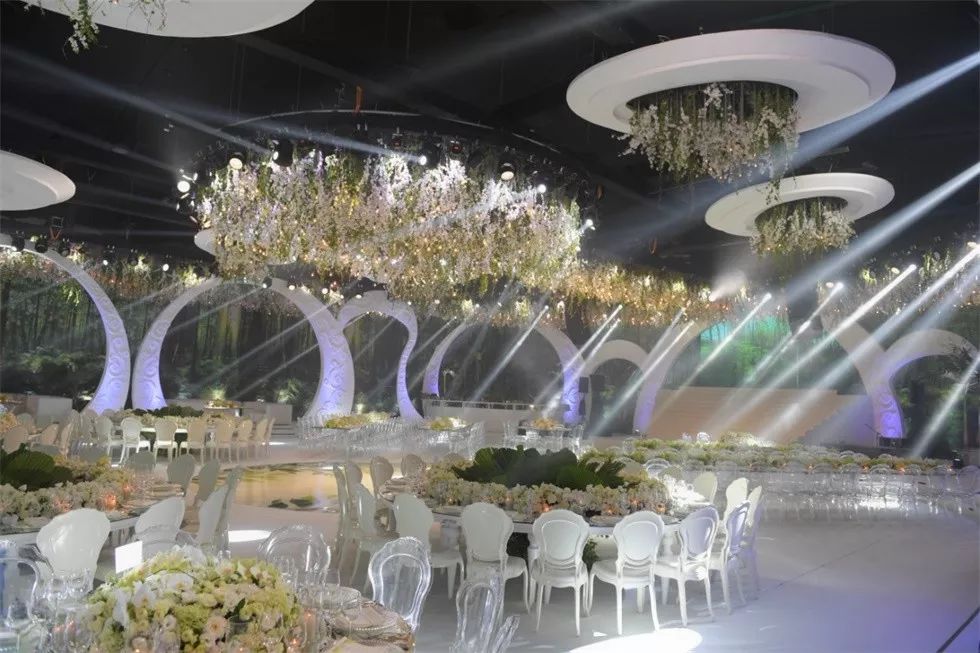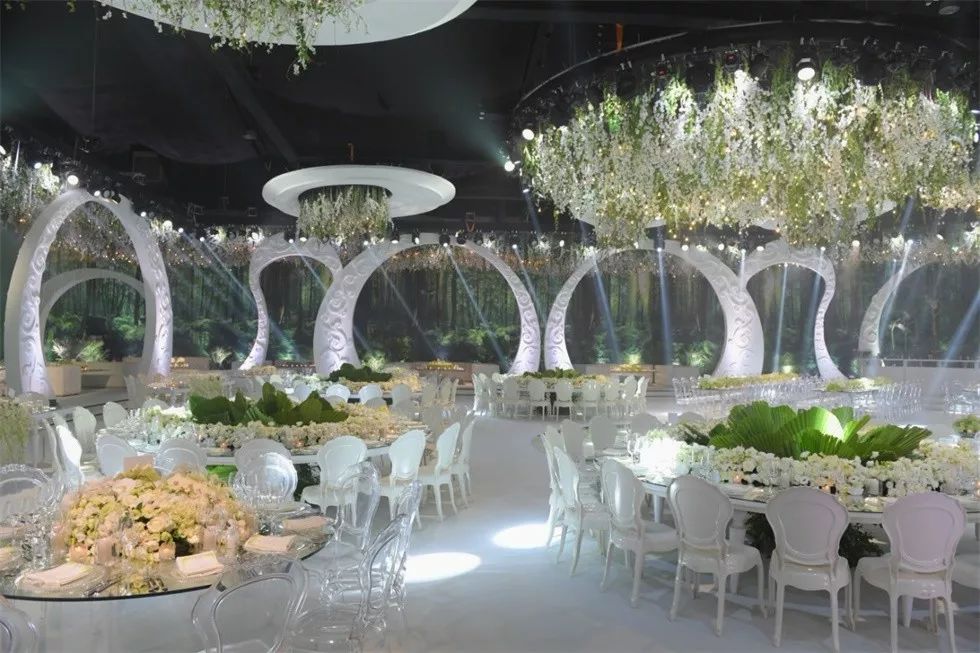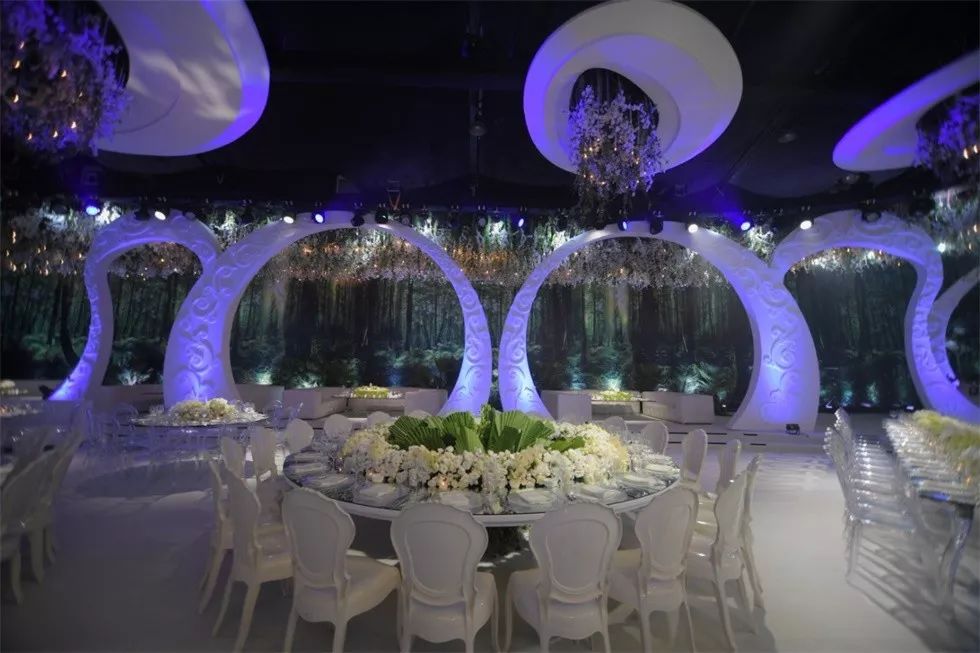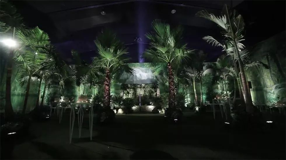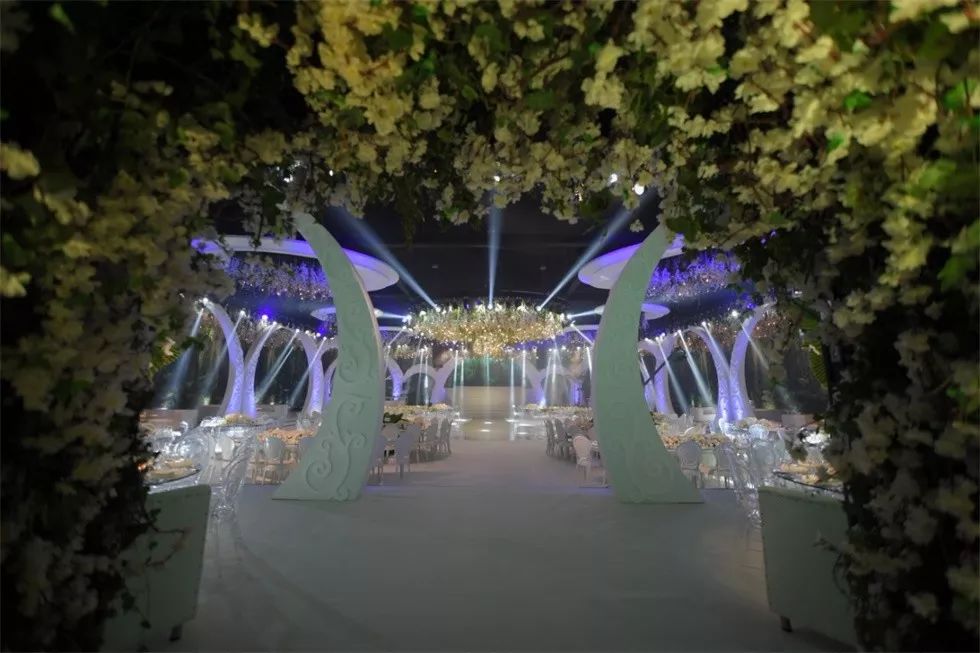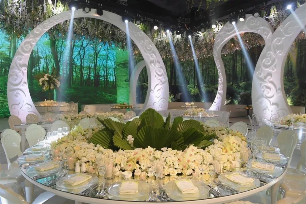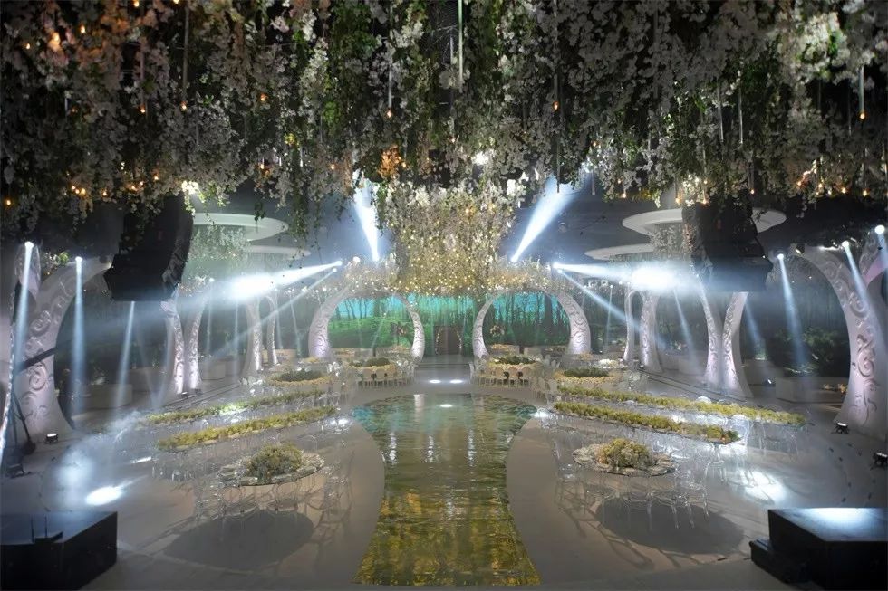 森林系的舞美设计你见过几个呢?这次的舞美设计不是某个公关活动,而是一场主题婚礼。现场的来宾等候休息区的设计反映了在森林中的感觉,这里完全被各种不同的树木和丰富的花卉包围。颜色范围从奶油色调到以平静心情的绿色。休息区散布着热带风格树木,客人们就身处在这样的绿色环境中闲谈聊天。婚礼正式开始前,石墙打开,客人们进入到主宴会厅。
