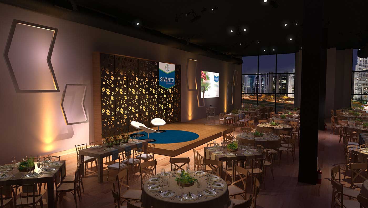 Sivanto在这次的宴会厅设计上选用了围桌的形式,且在围桌的设计上也做了精心的布局,有长条桌、圆桌、方桌几种不同的形态呈现。前台和舞台部分的设计金属感更重点,增加了整个场地的格调和层次感,使得整个会场看着像是餐厅而又像是舞厅的感觉,打破了常规的商务化或者是娱乐轻浮风。
