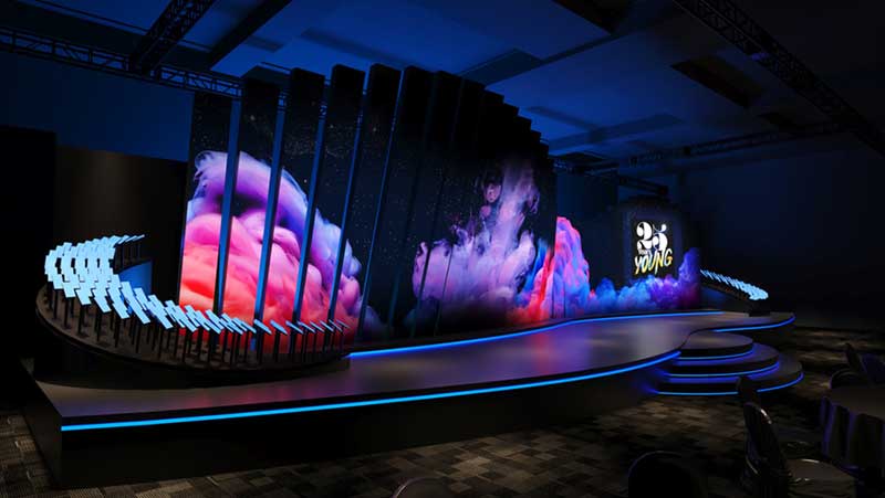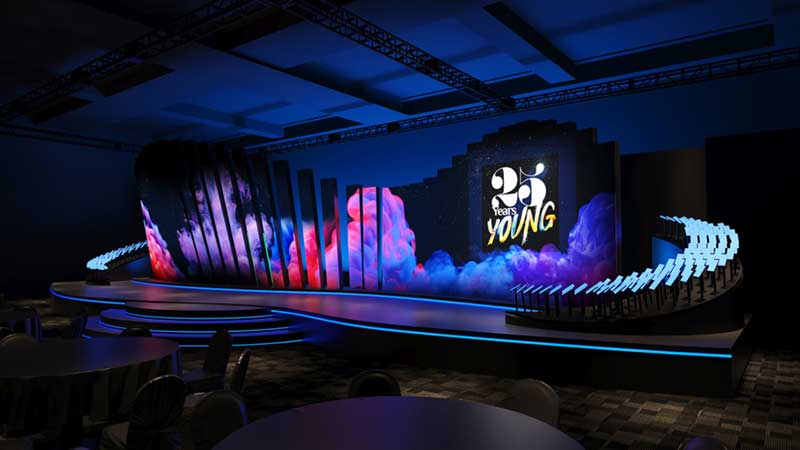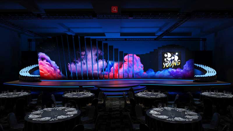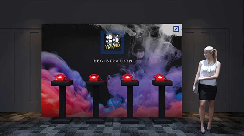 德意志银行印度孟买分行25周年庆典在整体的视觉设计上以深色系为主,舞美设计方面也有种腾云驾雾的感觉,而整场周年庆典活动上比较有趣的是其签到处,摆放的一个个电话是什么意思?估计是让参会者体验银行的电话银行服务吧,而且每个电话都能通话,接线员也会为活动专门提供一套专用的活动电话用语。