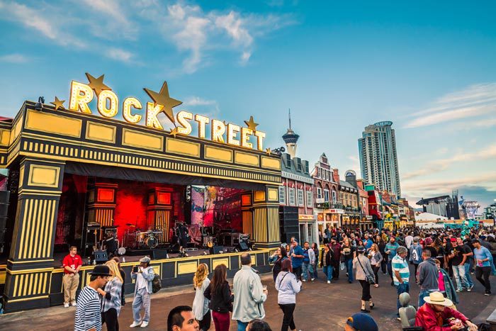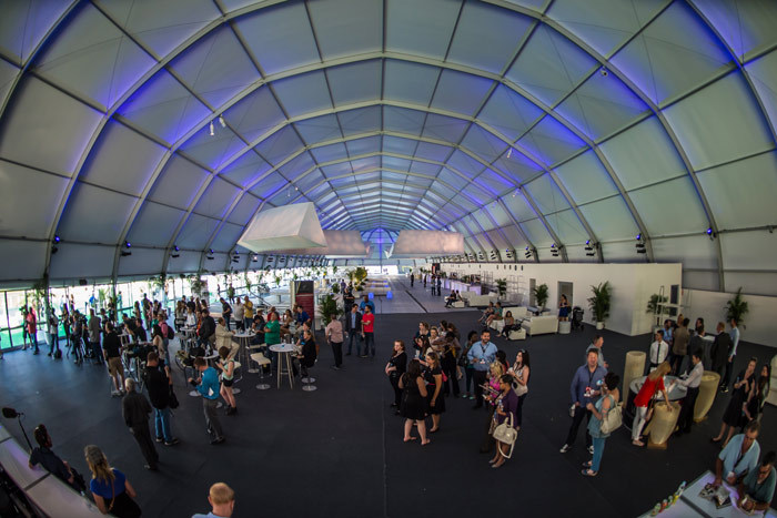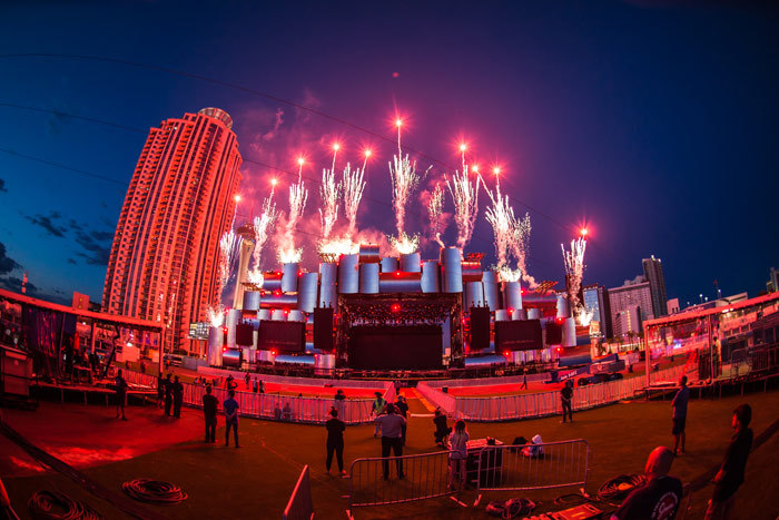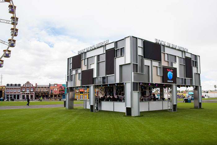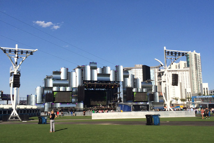 该音乐节第一次把举办地点搬到了美国行。音乐节期间的第一天,烟火就从主舞台后方燃放。舞台背景是由多块装配了灯光的发亮面板构成,现场中央售卖区的设计风格则迎合了最近流行的活动现场设计风格:色块拼接。