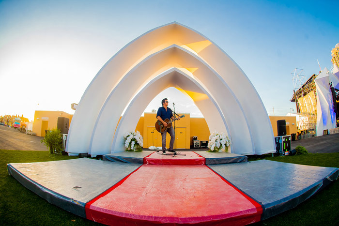 同时,音乐节现场还搭建了一个小舞台背景是三个白色的尖顶拱门,参加音乐节的游客可以在这里举行正式的婚礼。预计在周末两天的节日期间大约会有20场婚礼在这里举行。