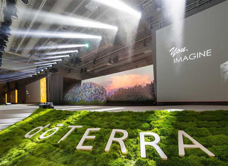 舞台上用结构泡沫熟练地雕刻出了引人注目的山景,真花与假花结合的舞台也吸睛无数。花艺装饰覆盖的面积达到了550多平方米。舞台上的山对参会者来说是一个视觉上的提醒,暗示多特瑞的一切产品都开始于自然世界,同时也为视频转播和现场观众提供了一个令人惊叹的舞美效果。舞台上山与山之间交叉的隐蔽的缝隙不仅创造了视觉的深度和平衡,也提供了一个舞台中央的上下口。山后巨大的投影屏幕中的云朵始终在随意地飘动,这样的设计让舞台顿时生动了起来。