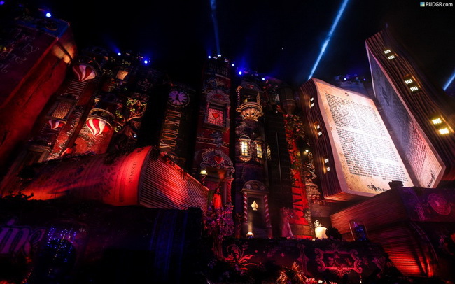 2012年“明日世界”主舞台的设计概念是“智慧之书”。舞台装饰由一组以水平和垂直方向安装的美丽巨书构成,背景中心那本巨大的书是“智慧之书”,它能够被打开,内页镶嵌安装了LED屏幕。