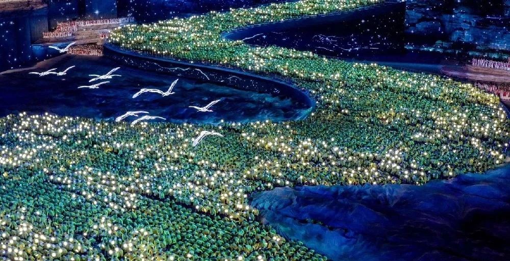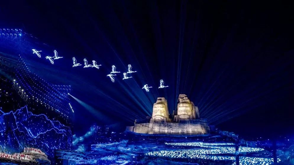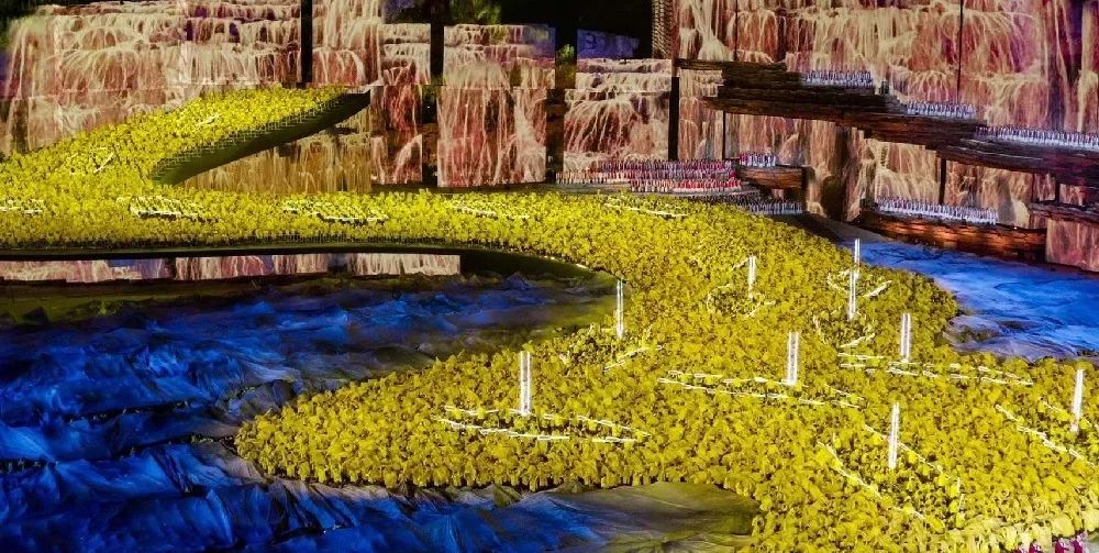 “S”曲线从天而降,与两边的天梯遥相呼应,可容纳2万名演员同时起舞。到目前为止,黄河是参加演出人数最多的地方。