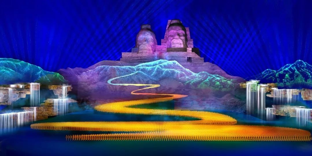 整个舞台跨度150米,占地面积近2万平方米,深度130米。最高的舞台风景是50米。设计师本着“助而不乱”的设计原则,以“黄河水天一色”为主旨。利用广场的情况,将炎黄两幅图像中的山石进行延伸和重建,在舞台两侧形成一个大台阶,或“梯”,或“云”,或“滩”。
