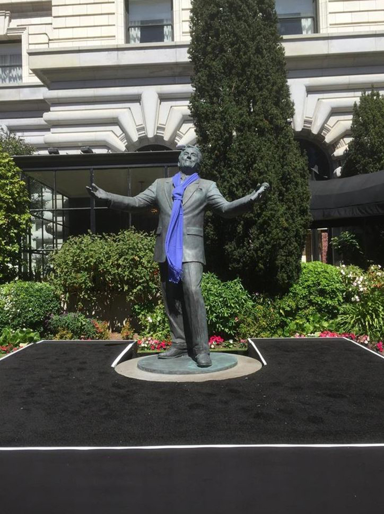 此次铜像揭幕仪式从主舞台背景设计与搭建,到定制帷幔布料和街道标志道具,以及为客人们准备的与托尼·贝内特雕像拍照的无障碍坡道,都进行了精心策划设计。而铜像优雅而经典的造型,显示了这位91岁的歌手深受这座城市的喜爱。