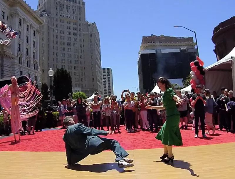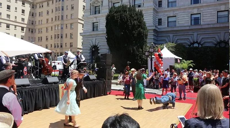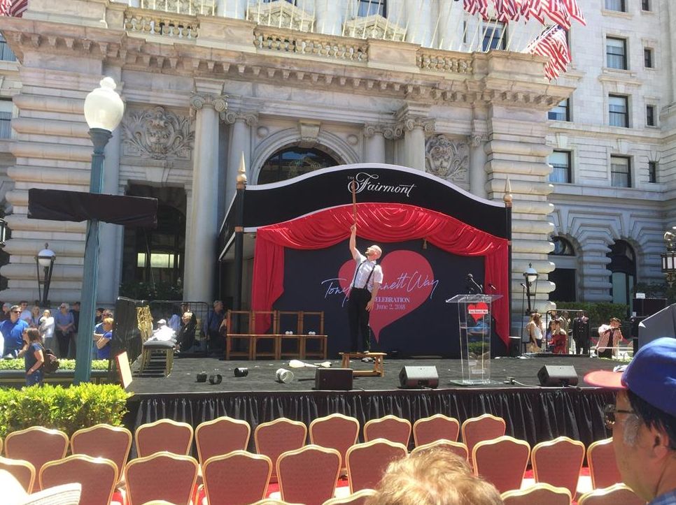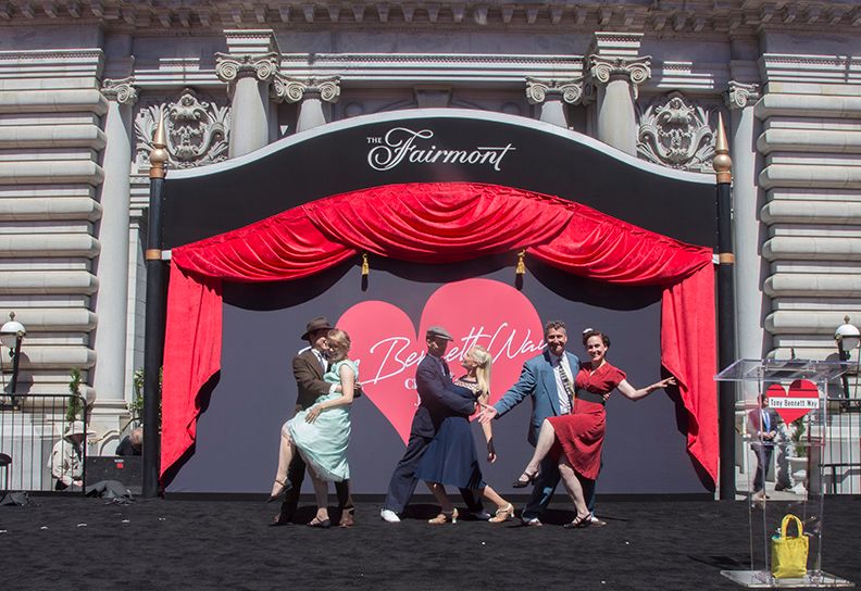此外,该活动中还加入了丰富的演出表演和娱乐活动,包括一个托尼•班尼特的模仿演员从酒店外立面索降拉开了仪式的序幕。最后这位91岁的老人自己揭开了一个以他的名字命名的官方城市路牌,并且,合唱团还演唱了《我把心留在了旧金山》。庆祝活动以一场免费的开放式派对结束,包括食物,音乐和大乐队舞蹈。