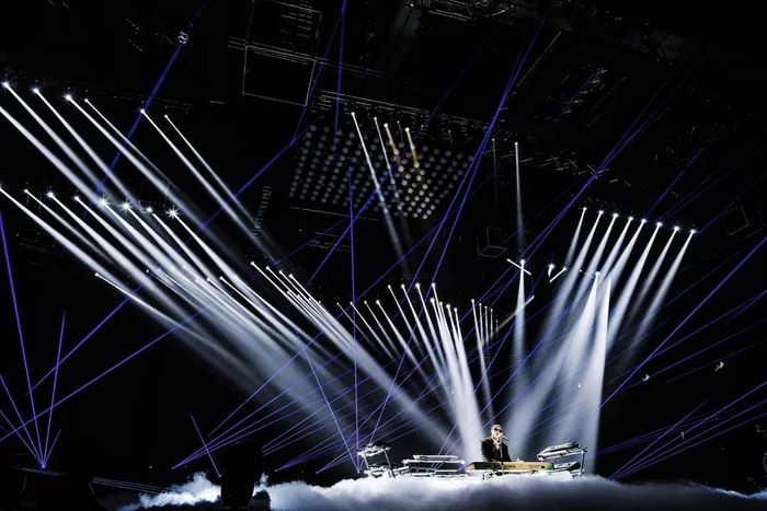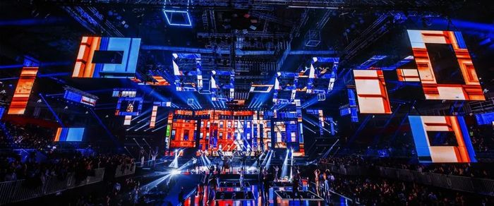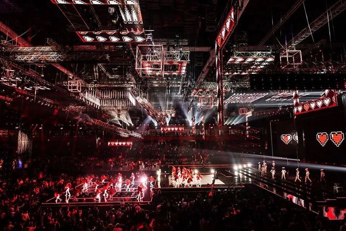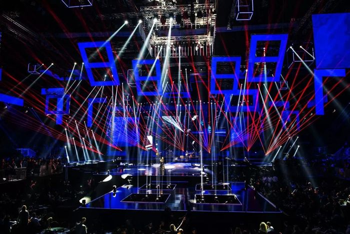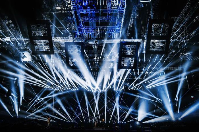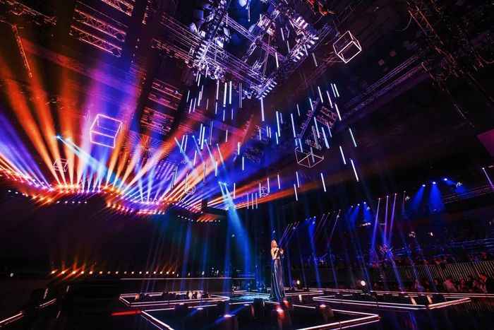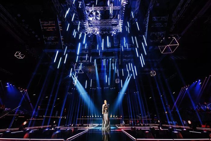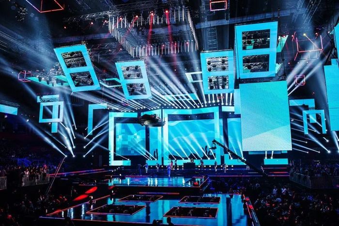 主背景屏幕被设计为三个折叠页结构,如同折页的三个框架分别朝向不同方向,折页背后是与其尺寸相对应的LED屏幕,除此之外,舞台区域和观众区域也设计有碎片式的屏幕来丰富舞台整体造型。舞台上最为特殊的是田字形区域舞台,舞台四个区域为镂空设计,里面安装有灯具,在镂空区域顶部相对应的安装数控升降灯条,上至下的灯光设计,给人一种穿透感。