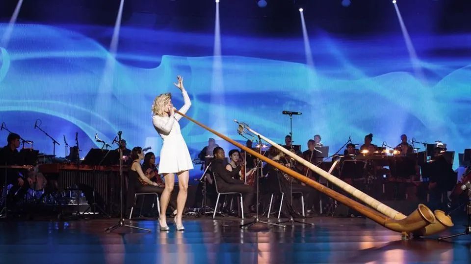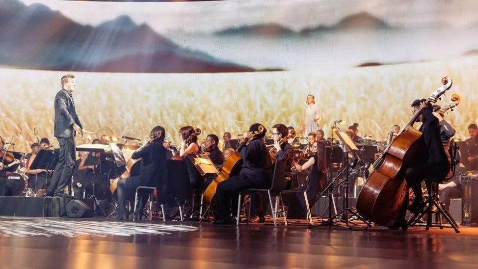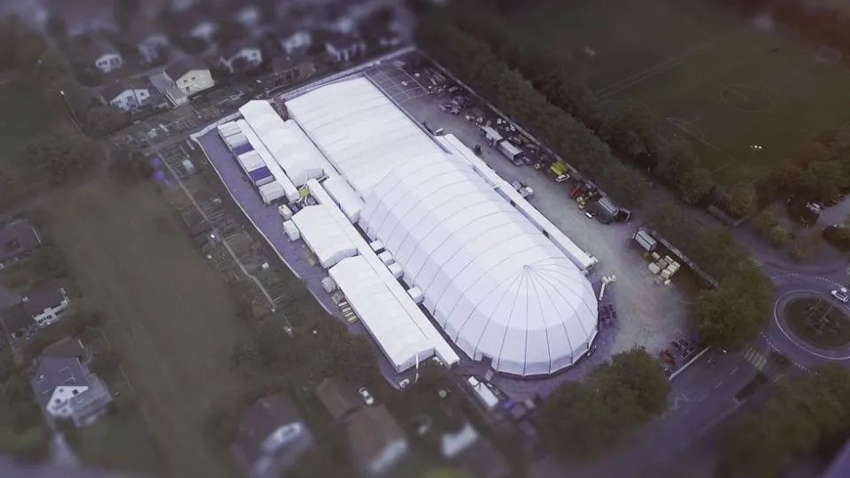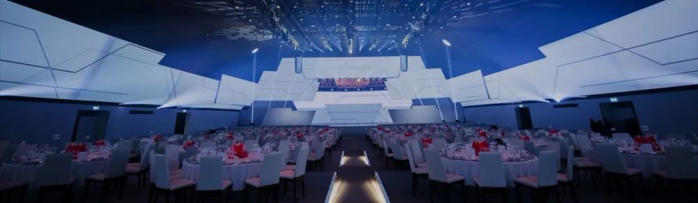 活动现场搭建了两个帐篷,一个是招待酒会区,一个主活动区。帐篷最高处达到16米,两个帐篷总长135米。在第一个欢迎区帐篷中,在墙面搭建一个面积为120米x 2.7米的U形投影屏幕,投影面积达到了180°。在主舞台区帐篷,搭建了180米长x2米高的环型360°的投影幕布。主舞台上的LED墙对两个动态投影屏幕进行了补充。