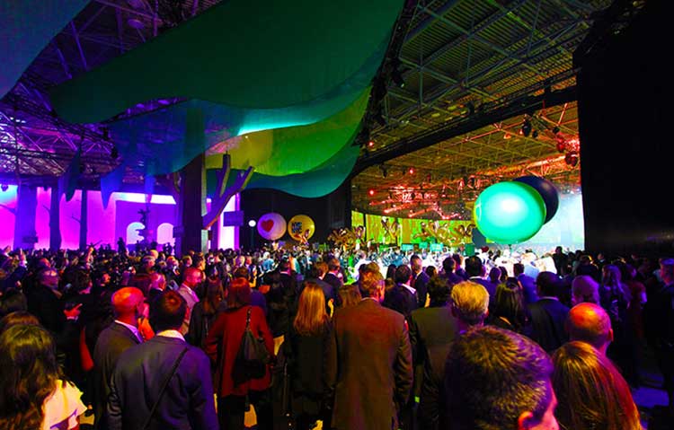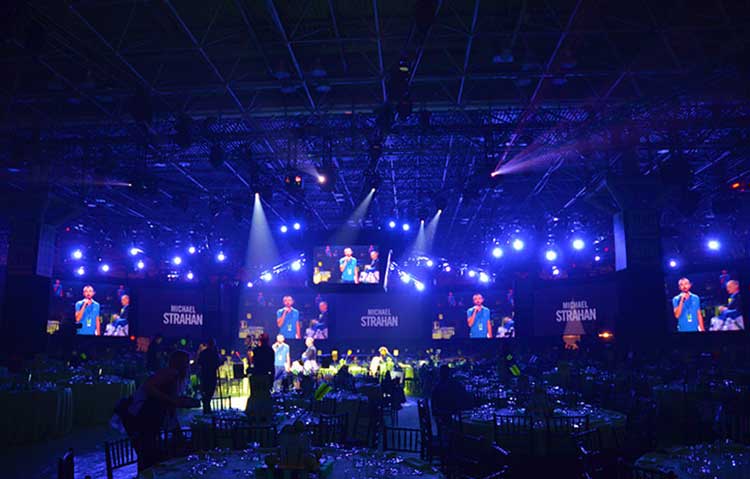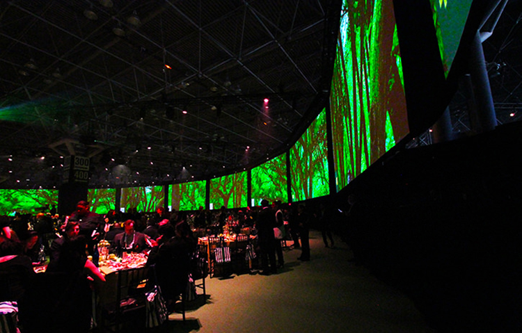 100人的游行乐队演奏着音乐,挥舞着各种道具和气球,引领客人们来到位于现场的宴会区。接下来是纽约州州长安德鲁·库莫的发言,州长发言结束后,播放了关于罗宾汉基金会使命的视频。这一环节充分利用了环绕现场四周的大型屏幕。有时所有的屏幕播放相同的图像,有时不同的图像出现在单独的屏幕上。当客人们返回到鸡尾酒区域,酷玩乐队在那里进行了现场演出。
