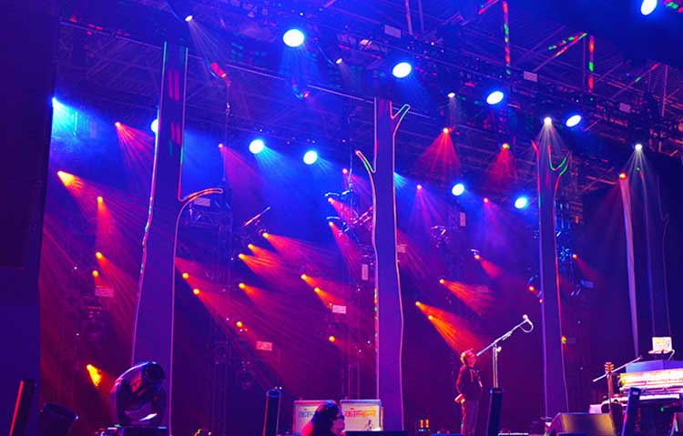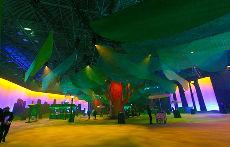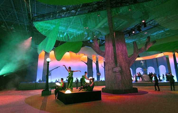 现场设计的树的造型有两个作用,将现场的灯光架隐藏起来以及体现公园主题的装饰,悬挂在树顶的织物的树冠让人感觉是树木的叶子。