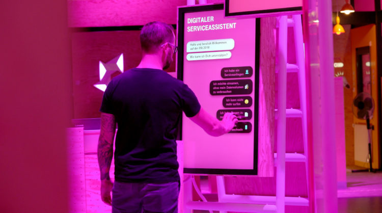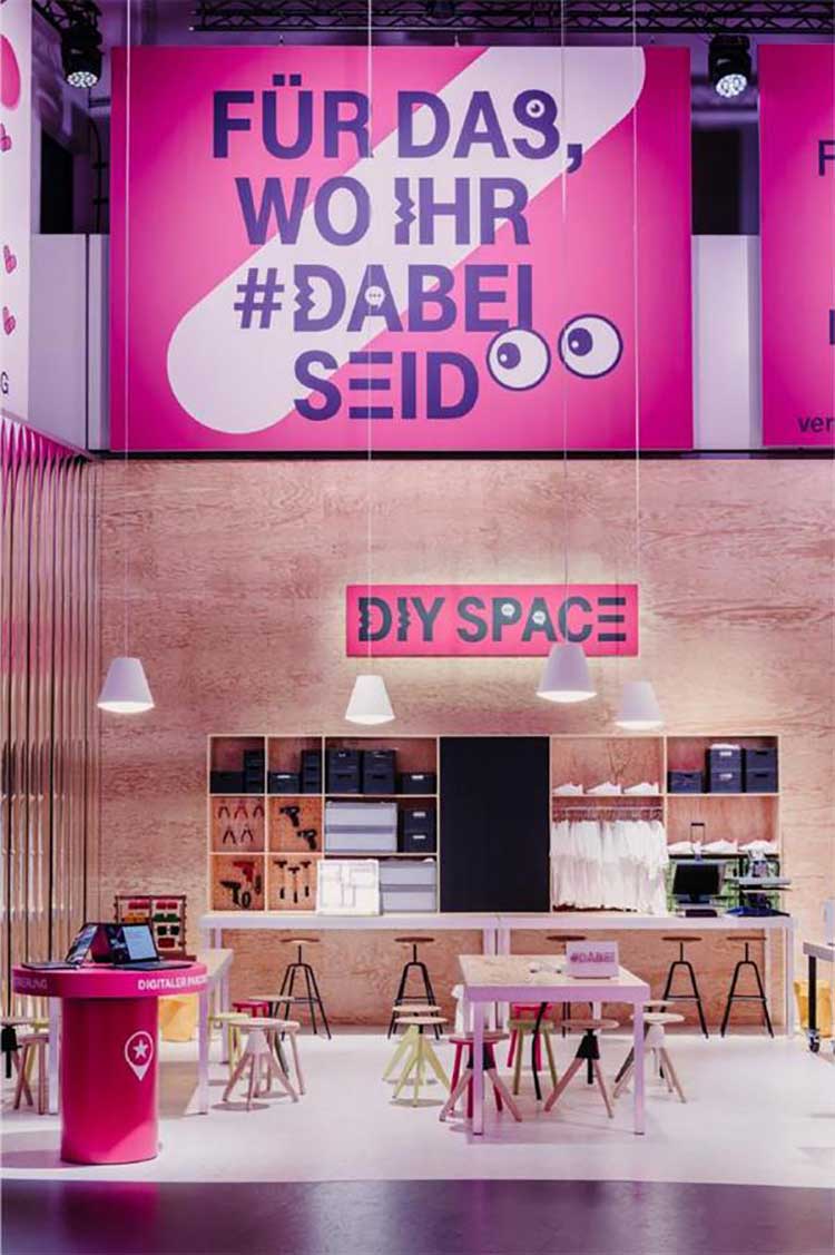 在“思想”体验区,我们使用了物理的按钮和蜂鸣器,游客可以用它们来实时配置他们喜欢的虚拟服务动画人物。而在“数字服务助理”项目中,我们设计了一系列对话屏幕,其中包含一个具有个性的未来派聊天机器人,对于“Mein Magenta App”(德国电信的服务APP),我们制作了一个增强现实门户,用户可以进入一个自我维持的虚拟生态系统。