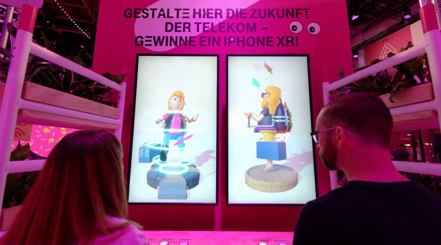 我们搭建了一个通向德国电信服务世界的虚拟门户,让访问者身临其境地了解重要的业务主题。第一部分的体验是主题的3D动画形象在五个相互作用的屏幕之间的相互作用,这些屏幕分布在整个大厅。第二阶段是通过一个便携式平板电脑进行的,它展示了一个相互连接的机器世界,在这个世界里,可以在空间中自由移动的同时触发令人愉快的动画和讲故事。