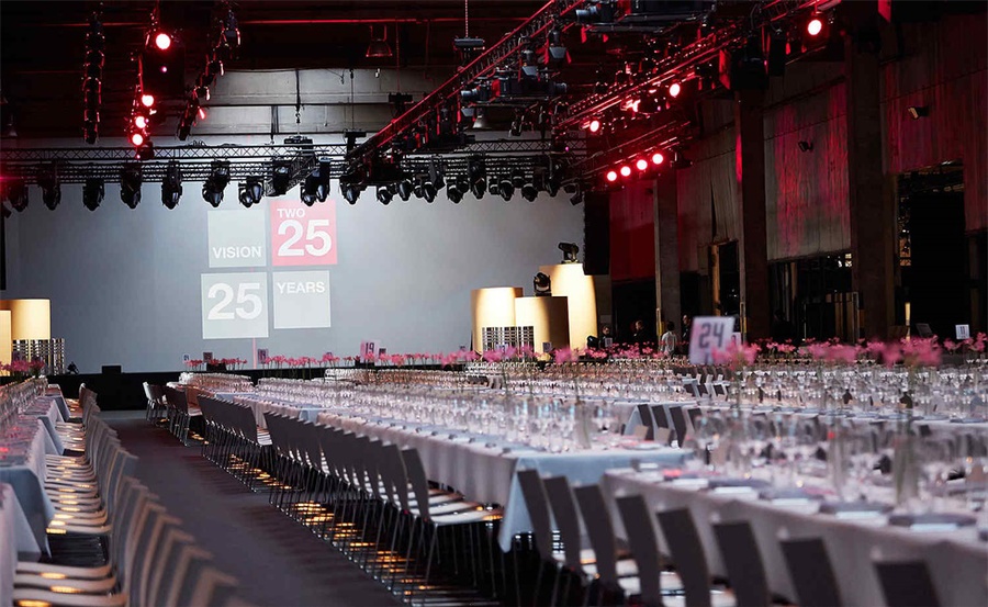 Progroup AG是欧洲瓦楞工业环保政策的先行者,全球著名的包装材料供应商。在短短25年的时间里,Progroup AG通过创新的解决方案颠覆了瓦楞纸板包装市场。为了庆祝公司诞辰25周年,主办方把旧的厂房被改造成了活动现场,为700名左右的客人创造了一场令人印象深刻的感官体验。首先迎接来宾的是通过单独设计的现场展示装置和多媒体体验来引导客人们了解,品牌在过去25年中所逐步形成的创新文化,以及在欧洲范围内的快速扩张以及成功背后的切实可见的实证。在改建的宴会区,向来宾和政界名流展示了公司成功的故事,宴会中为来宾们提供了各种丰富的明星美食。