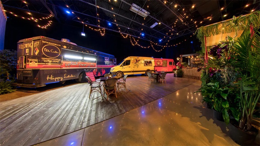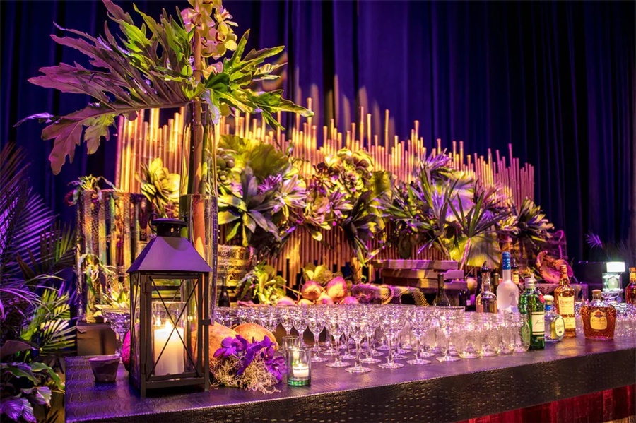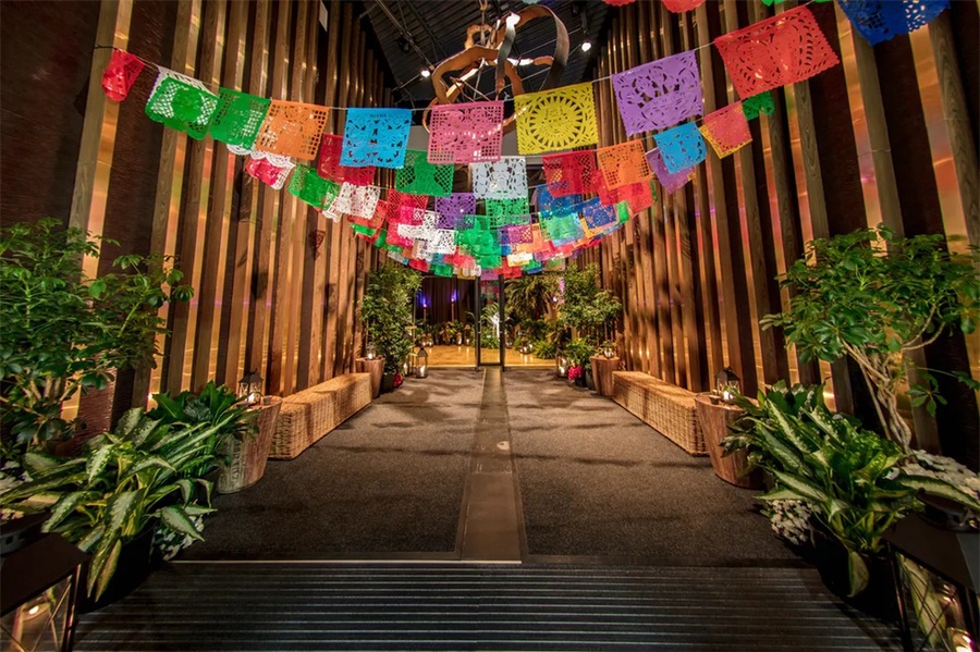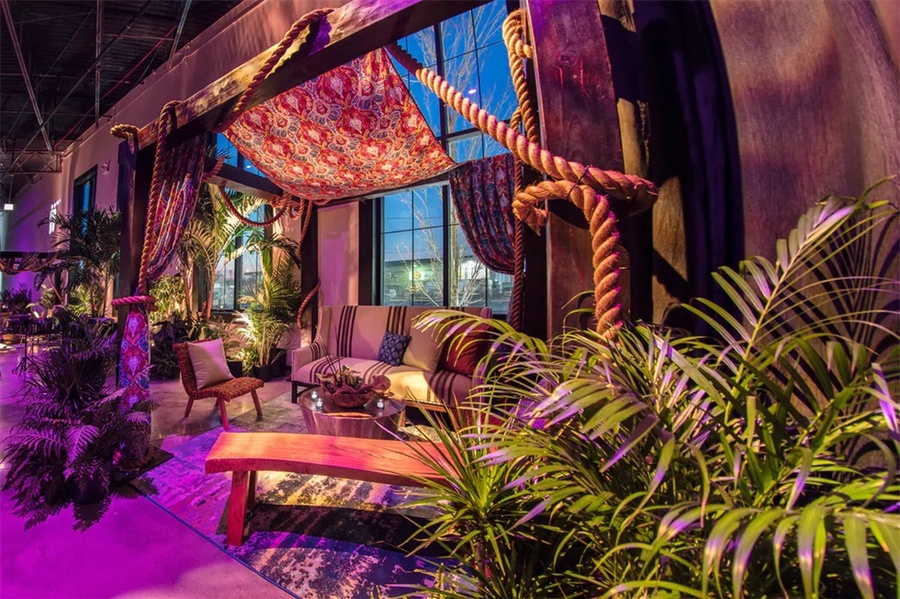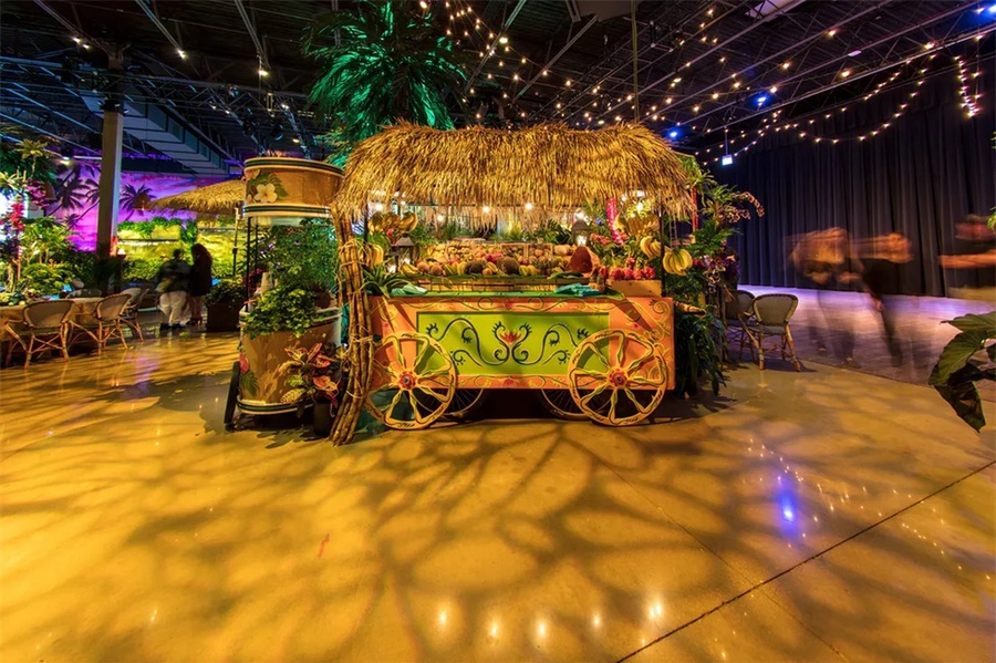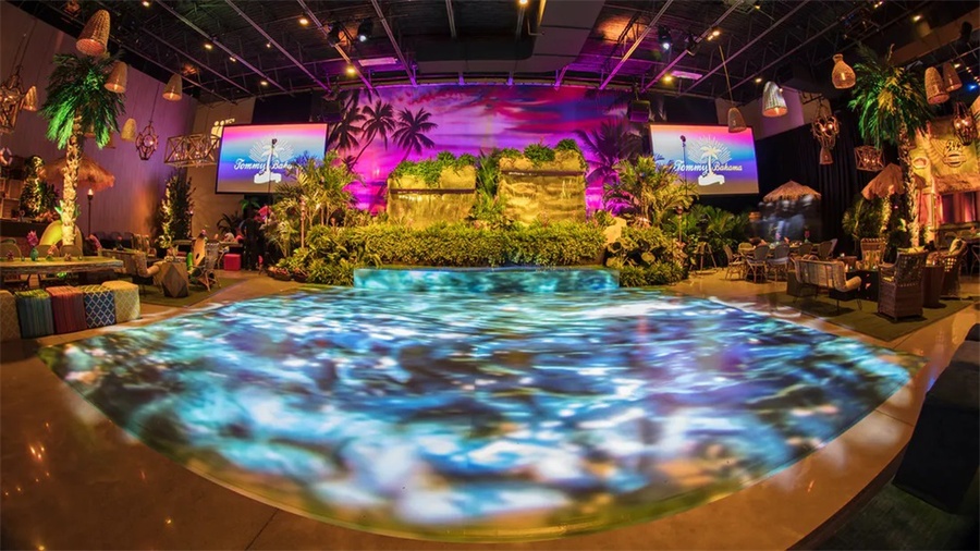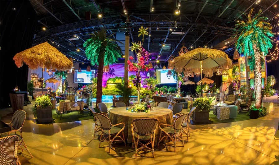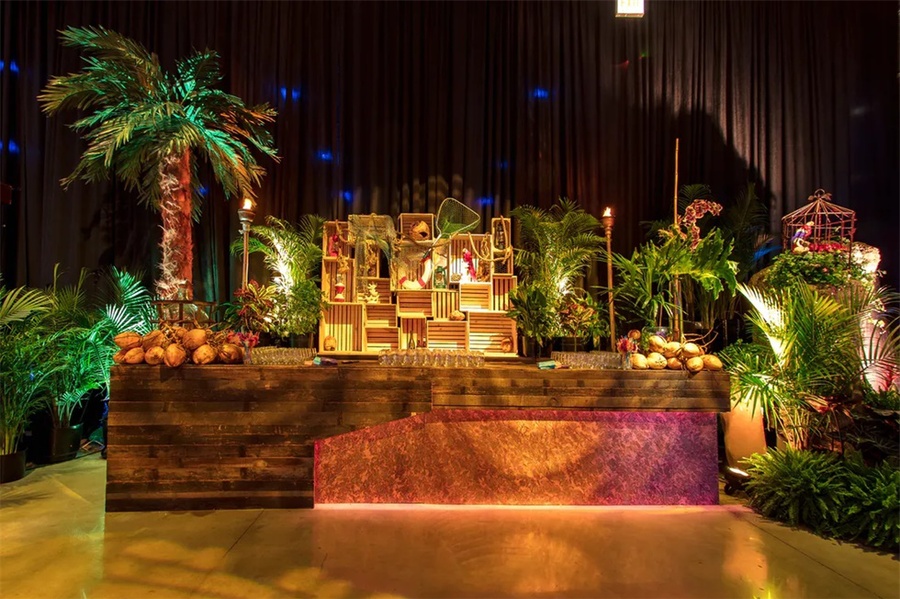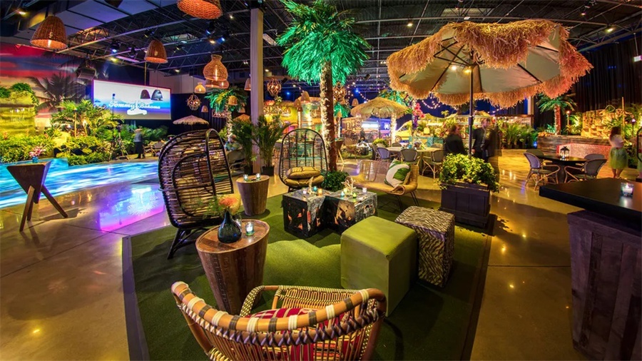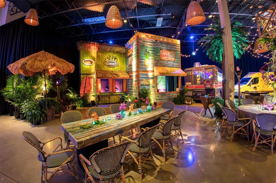 活动策划现场都会有一个风格定位,而这个海岛风格的活动吸睛率超高,感觉像到了一个度假村度假。活动现场最引人注目的设计当属定制的沙滩排球场,还有三辆全尺寸的食品卡车,以及一个20英尺高的瀑布,沙滩、绿植、瀑布,到场的宾客都以为到了热带的海岛绿洲,神清气爽,心旷神怡。