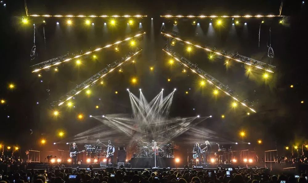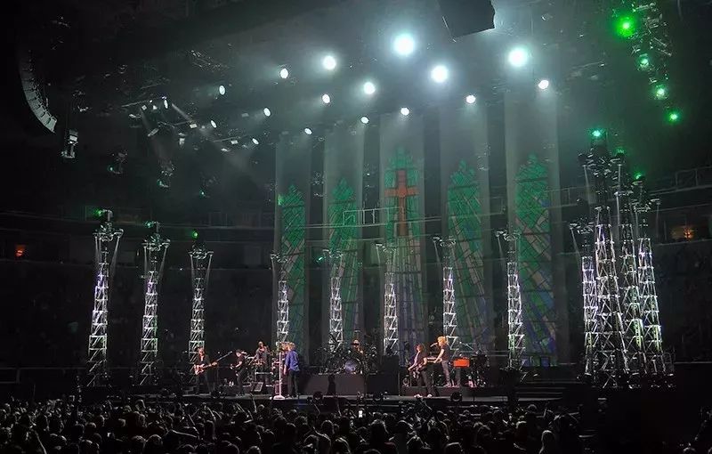 在巡演中,grandMA2充当了演出控制员,一个grandMA2与三个活跃的神经网络处理单元驱动节目的自动化,照明和视频。照明设备的移动部件包括舞台周围的12个六角形塔架,可以在空中伸缩30英尺,“同时还可以承载照明,为钢板提供生锈的外观。”Bay说。十五个溜溜球绞车接近灯具的舞台,头顶上有六个自动桁架。五个滚降投影屏幕显示视频内容,同时几个LED墙壁为后排座位提供IMAG。