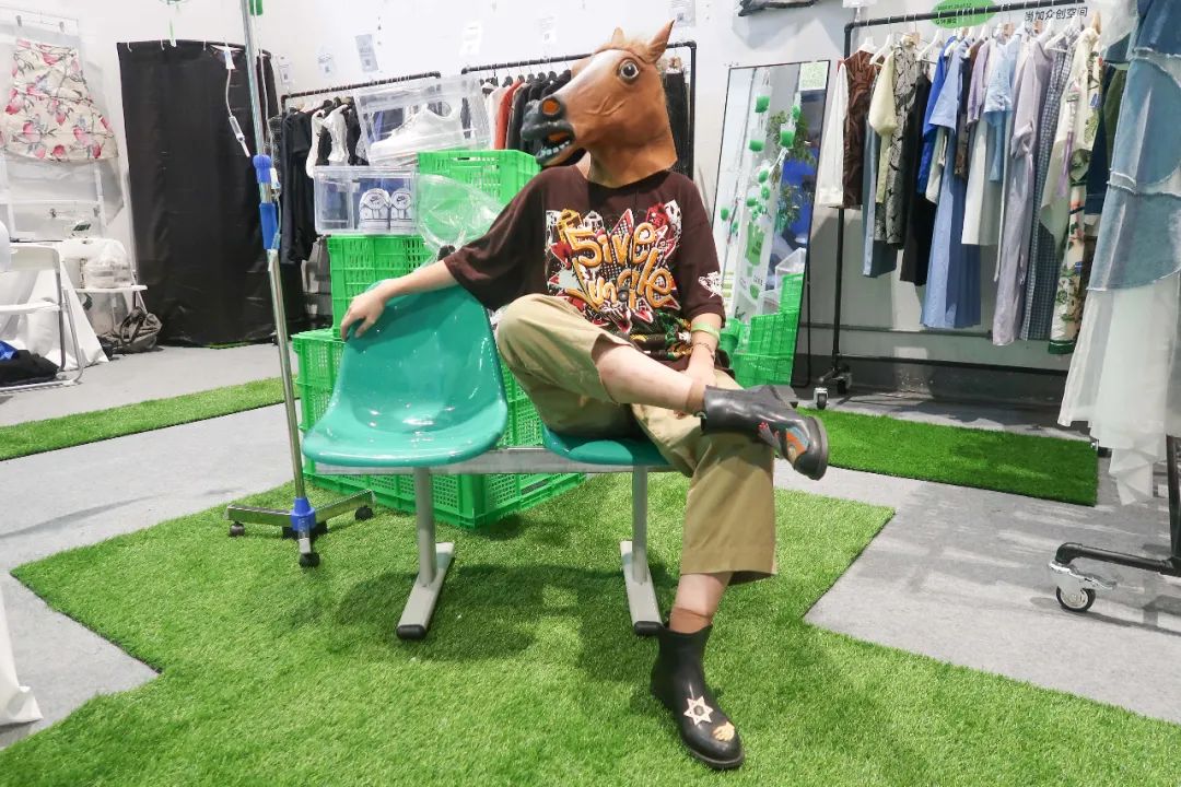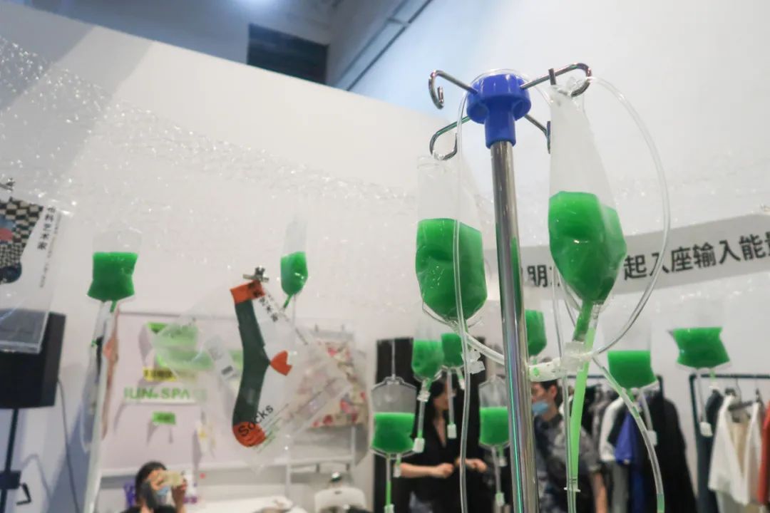内在多处设置了布景互动,满足了多数游览者“打卡”的心态。场内最里头的“输液室”,一定是吸引眼球的。绿色的编织篮,绿色的输液袋,还有中心位的路人座。