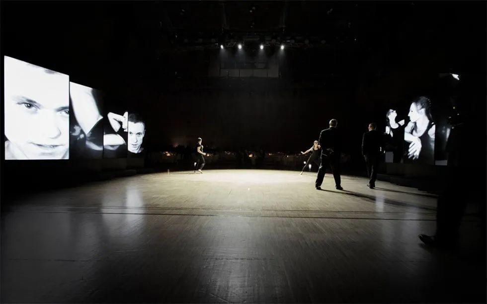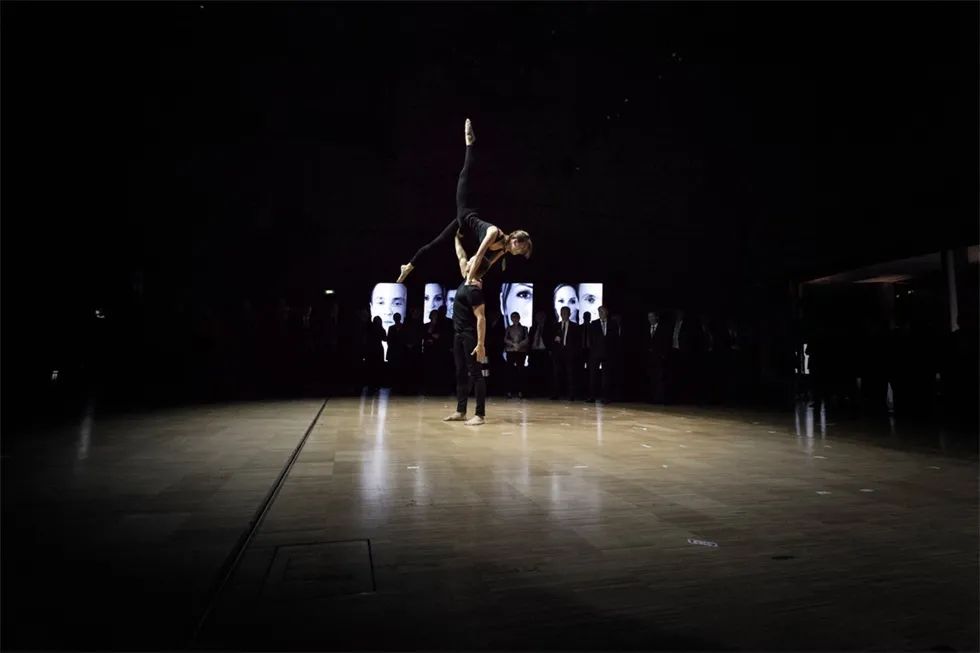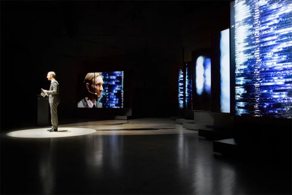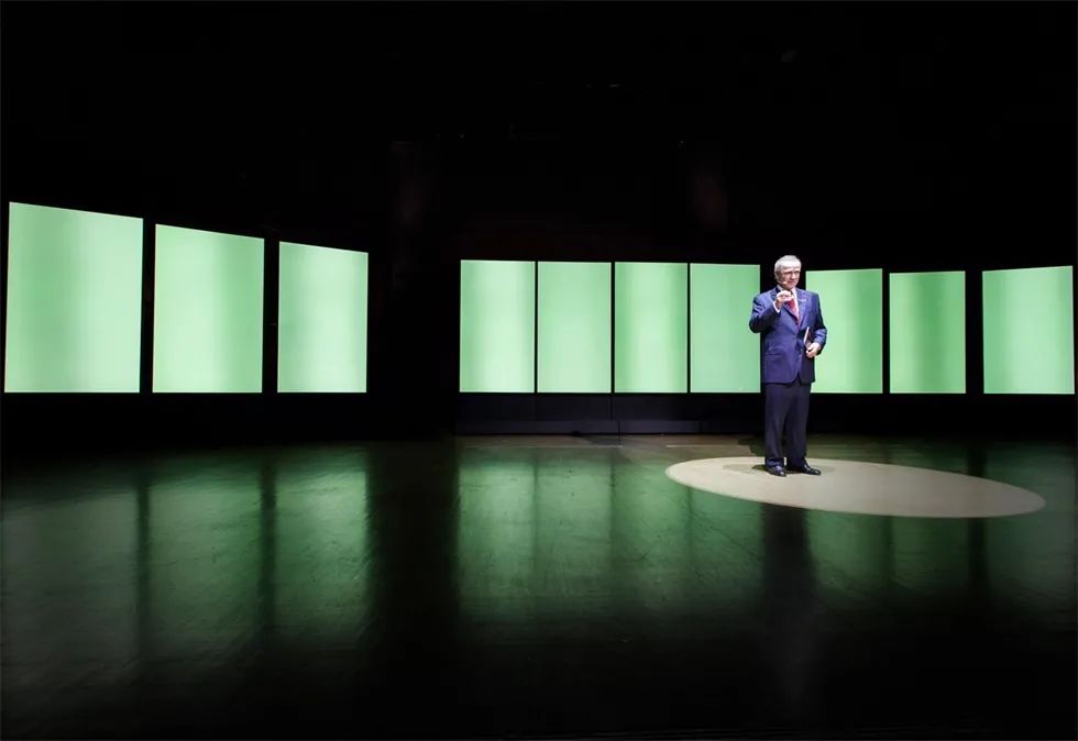 舞台制作的核心是在一个黑暗的场地,由十几个可移动的LED显示器和它们背后的工作人员共同完成,添加了人工因素的不断变化的舞台背景,用精准的互相配合不断创造新的舞台背景结构组合与图像,人类配合完成的移动的舞台布景就像激情的芭蕾,思维的流动,共同意愿的结合。这种变化的舞台设计,强烈而又不张扬地反映了研究与商业的相互作用。
