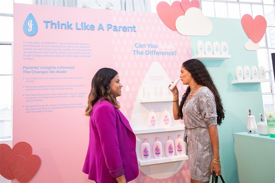 “像父母一样思考”展示场景,展示了强生公司对父母的承诺,新产品是如何反映了26000名父母的观点。变化包括更符合人体工程学的瓶子,单手就能挤出产品,快速吸收乳液,和更自然的香味。