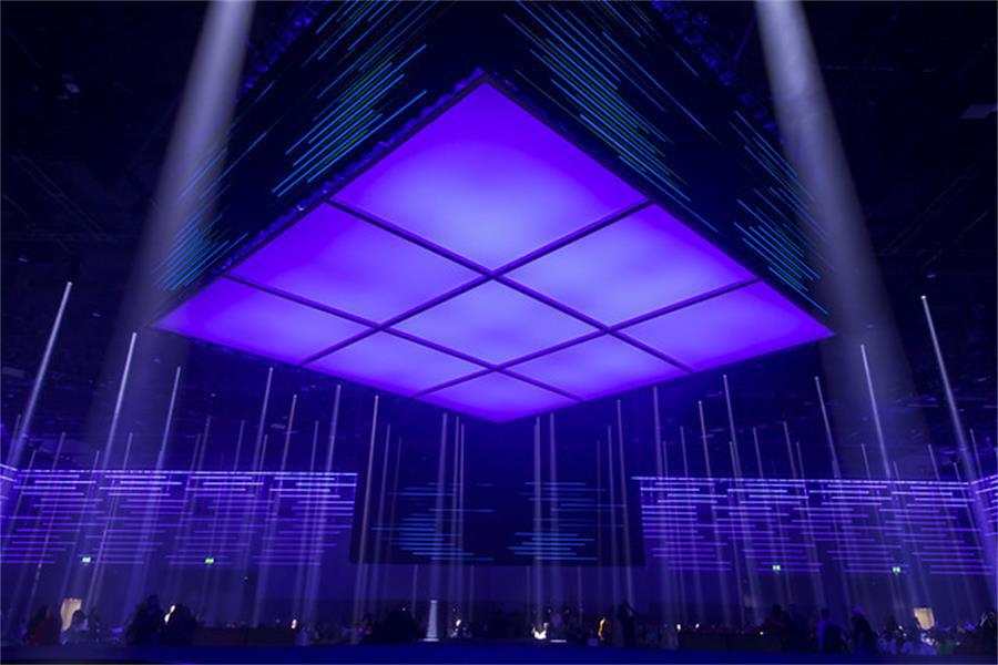 这个主题通过一些场景元素变得生动起来,比如一个巨大的立方体漂浮在观众上方,在喷火战机(Foo Fighters)和凯蒂·佩里(Katy Perry)等超级明星表演时与灯光秀同步进行灯光表演。在立方体上有四块双面LED屏幕,无论观众坐在哪里,都能获得最佳的观看效果。一个较小的中央LED立方体,柔和的光线照亮下面的舞台,提供了另一层戏剧效果。另一个突出的舞台效果元素是一个由发光管组成的网格,它能对视频和音频信号做出反应。