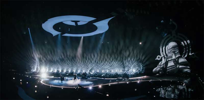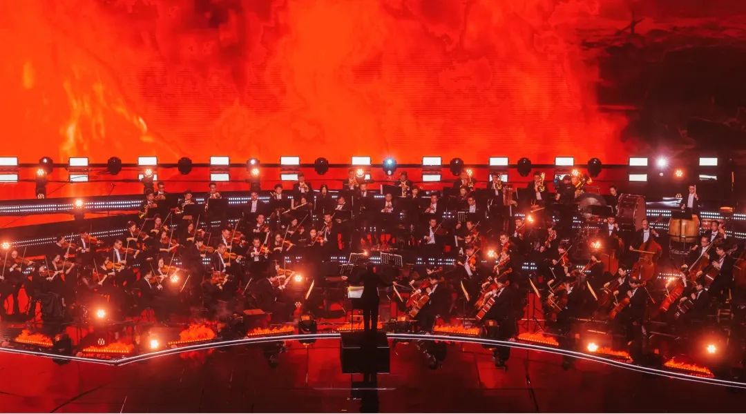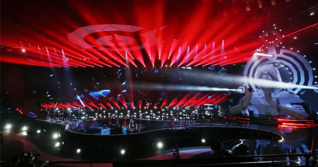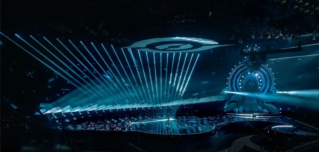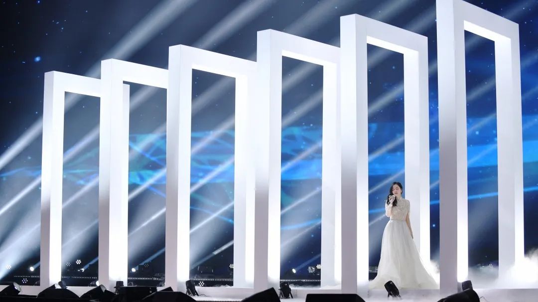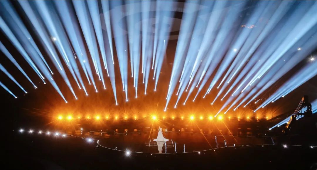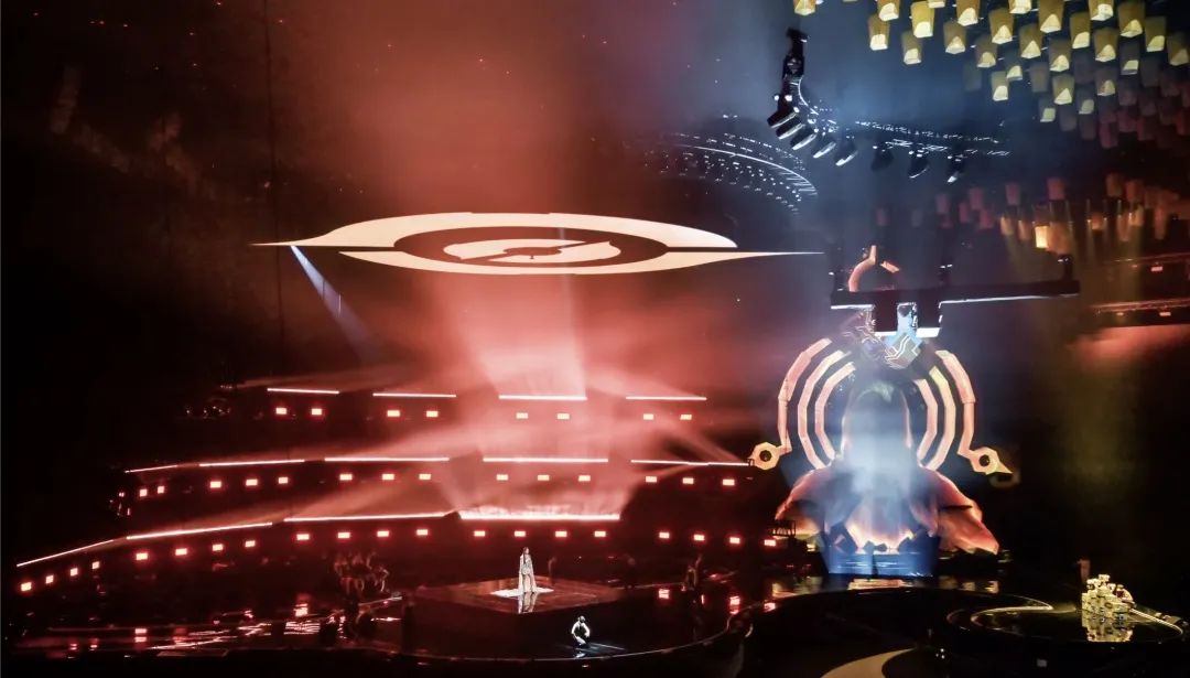 盛典的舞美设计了270度环绕屏以及瀑布屏,庞大的屏幕结构给灯光设计带来了压力和挑战。设计团队在环绕屏上方跟随屏幕弧度结构设计了三层圆角矩形灯架(灯架由三合一灯具、LED蜂眼灯、光束灯和洗墙灯构成),在舞美的结构基础上将整体的视觉高度再次拔高。