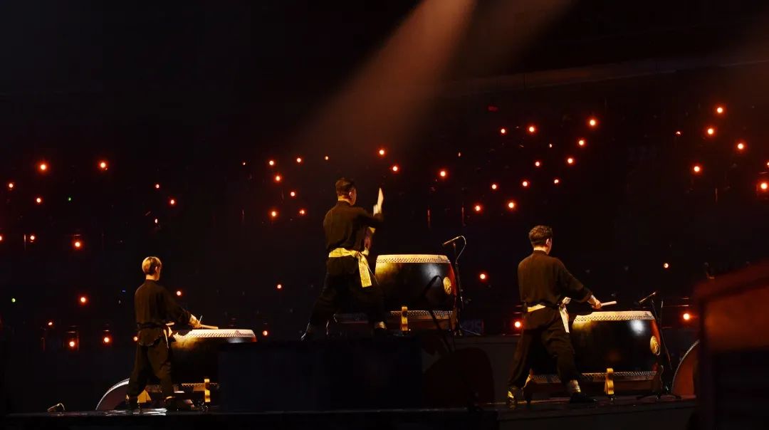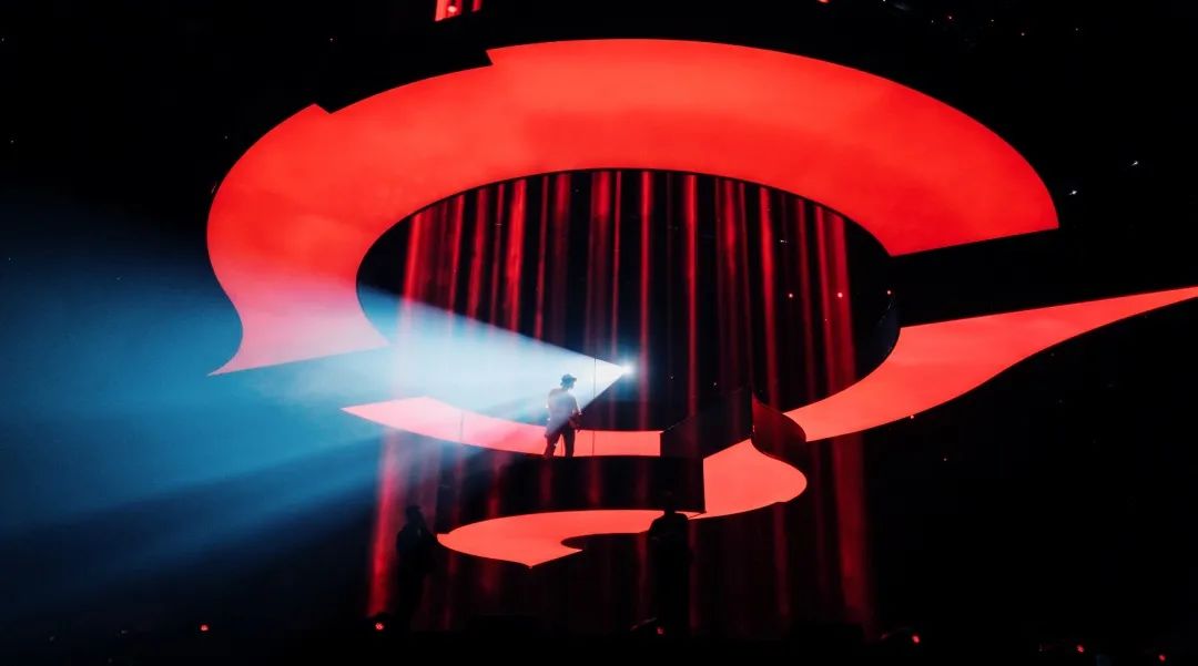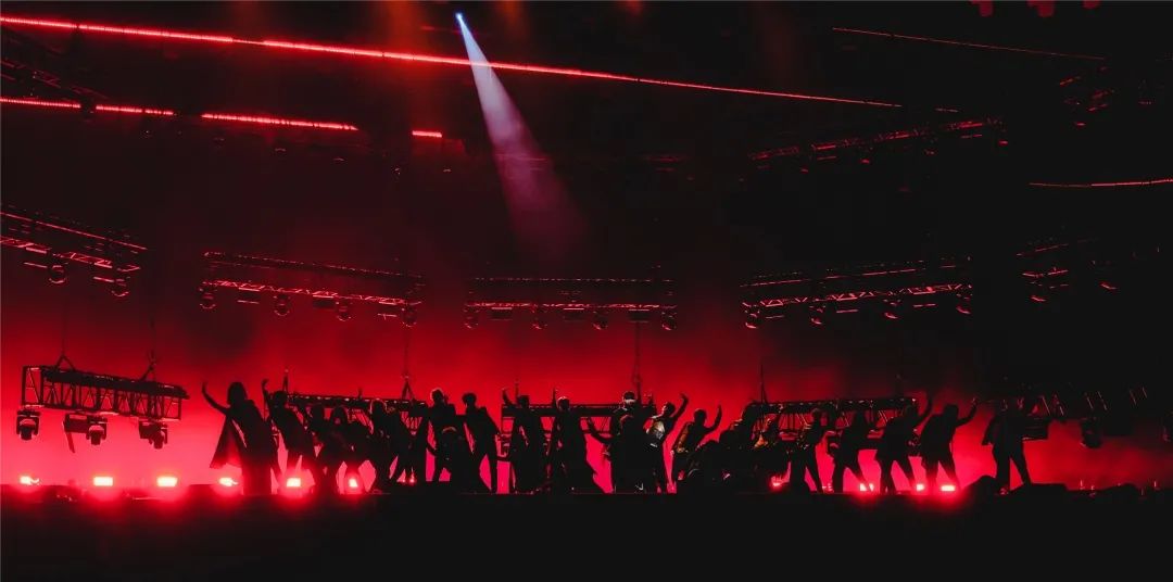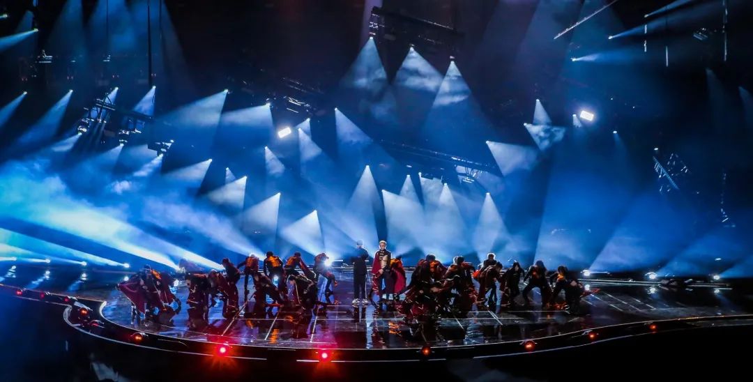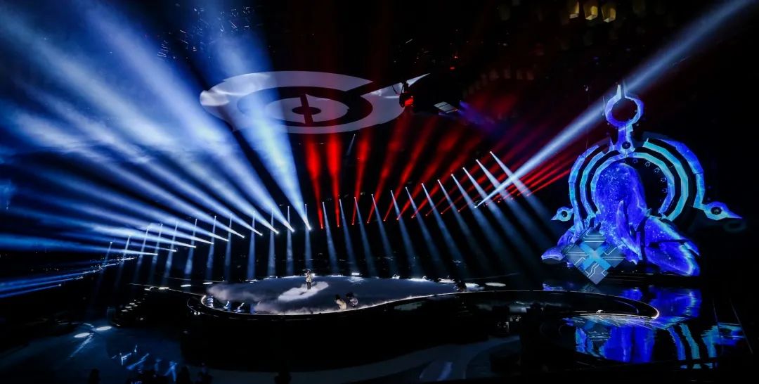 为了弥补屏幕全包舞台给灯光效果带来的部分限制,此次盛典还使用3层共18个数控灯架,隐藏在空中logo之后。数控灯架下降,可以与表演者发生更近更强的互动。数控灯架的多重造型变化,打破舞台的常规结构,配合表演氛围呈现丰富的舞台层次。