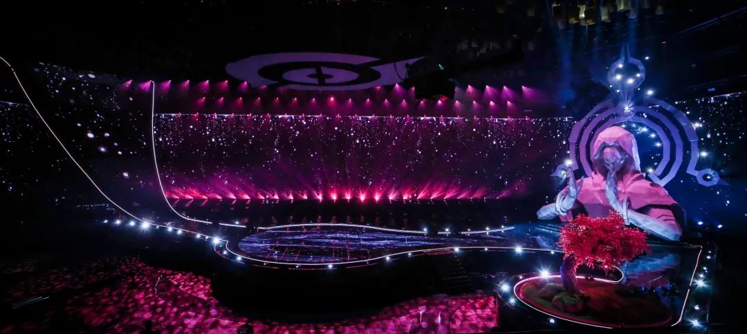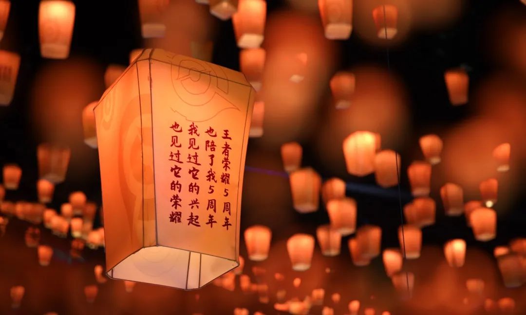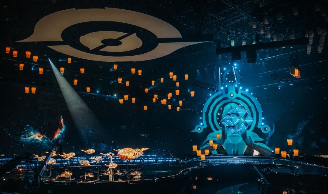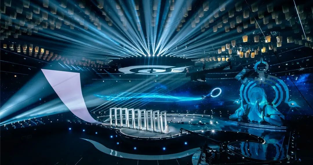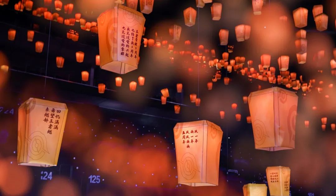舞台上空悬挂了1200个数控灯球,并以纸灯笼作为造型包裹,每只纸灯笼上都写满了召唤师们对王者荣耀的祝福。这一设计,让舞台具有浓浓的中国风特色,一眼望去,仿佛进入到盛世长安的千灯夜景之中,极其浪漫。