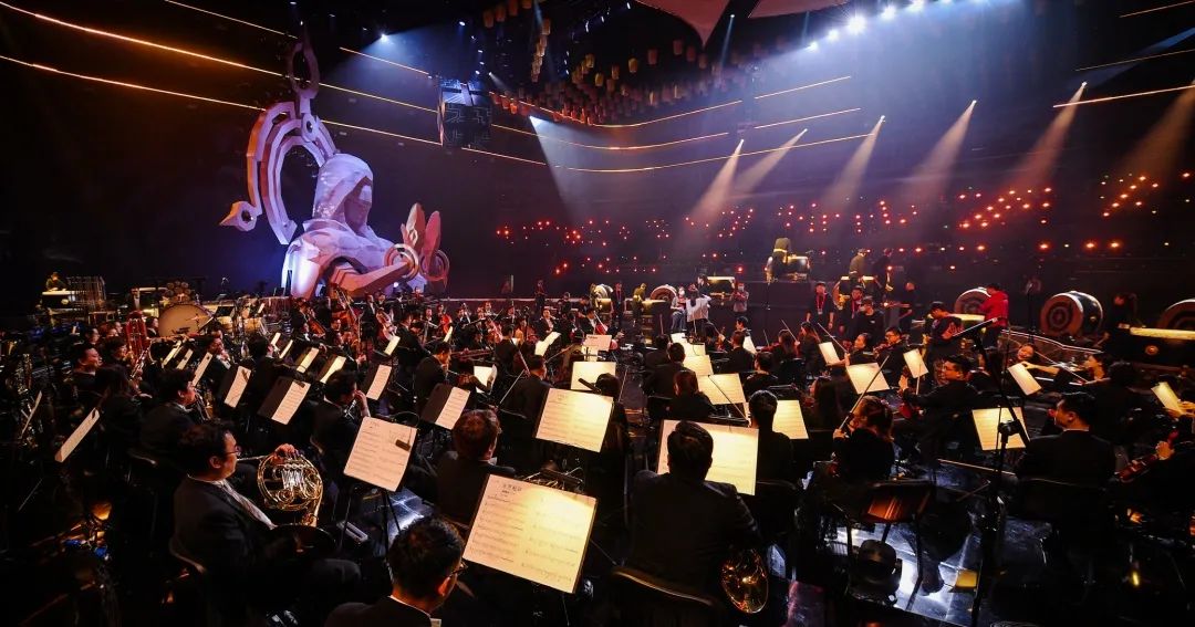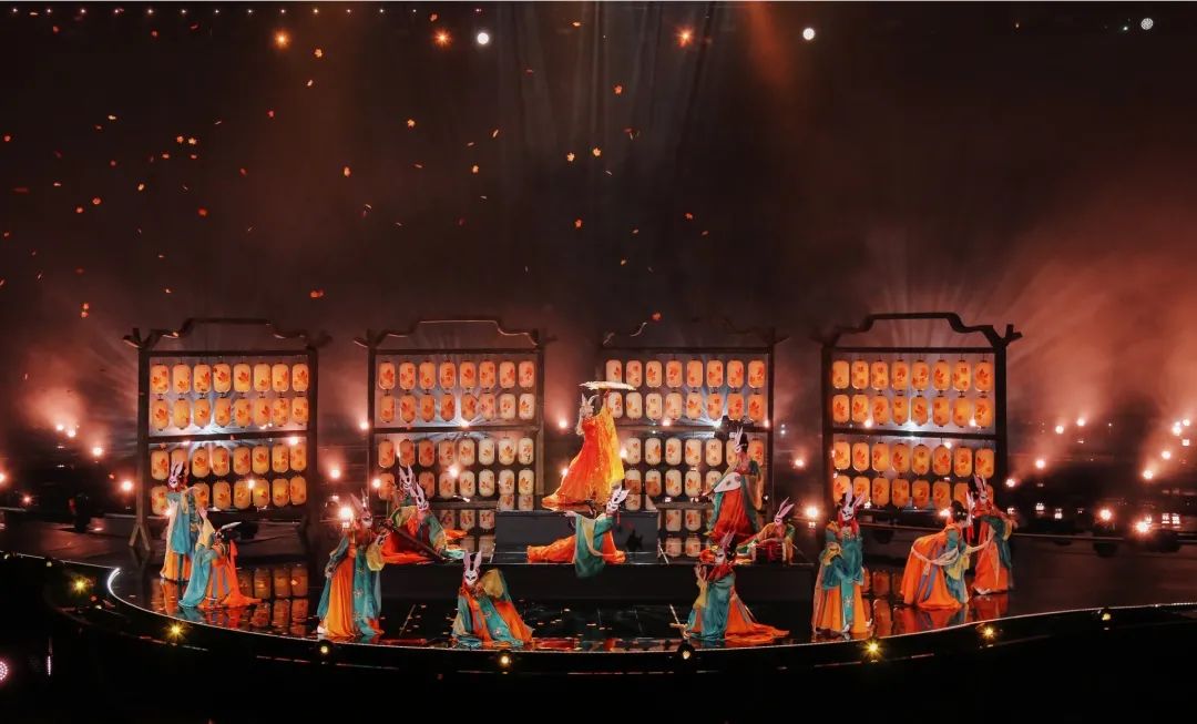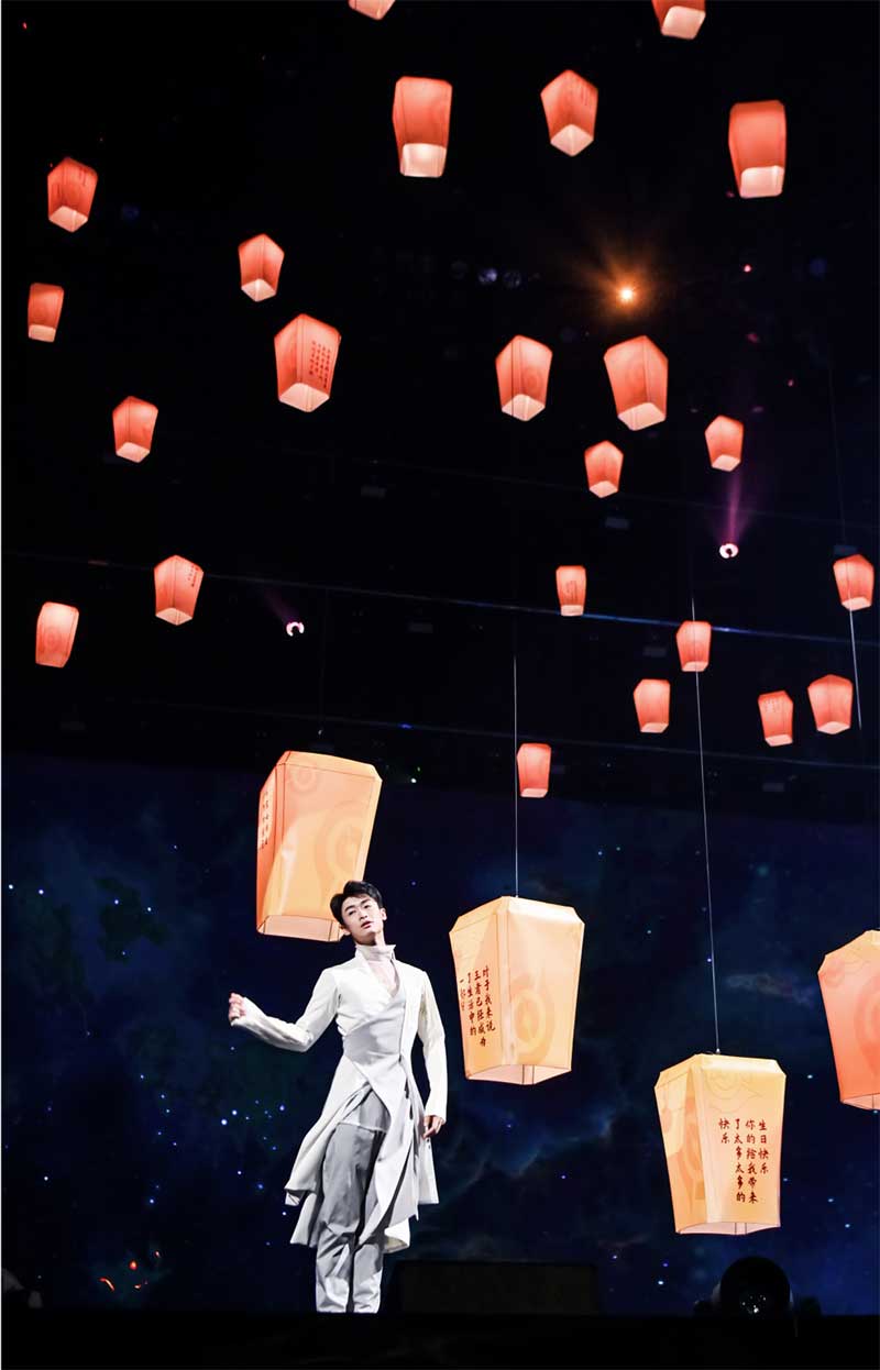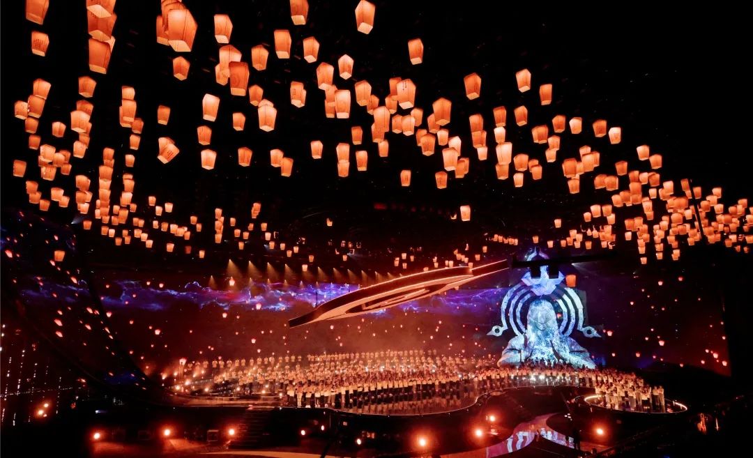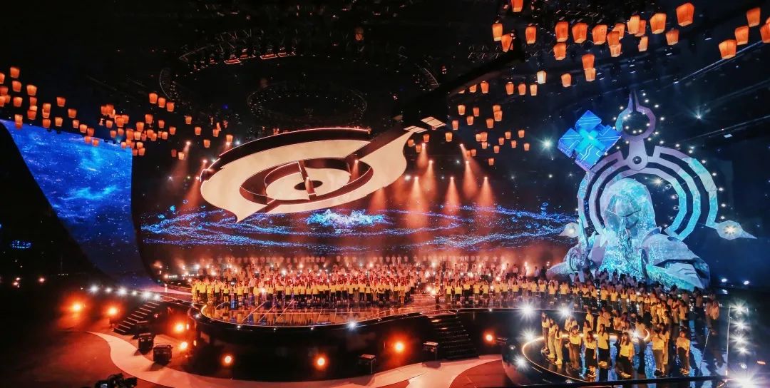 舞台上空悬挂了1200个数控灯球,并以纸灯笼作为造型包裹,每只纸灯笼上都写满了召唤师们对王者荣耀的祝福。这一设计,让舞台具有浓浓的中国风特色,一眼望去,仿佛进入到盛世长安的千灯夜景之中,极其浪漫。