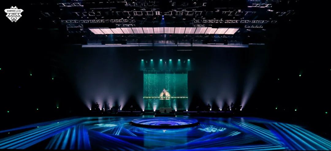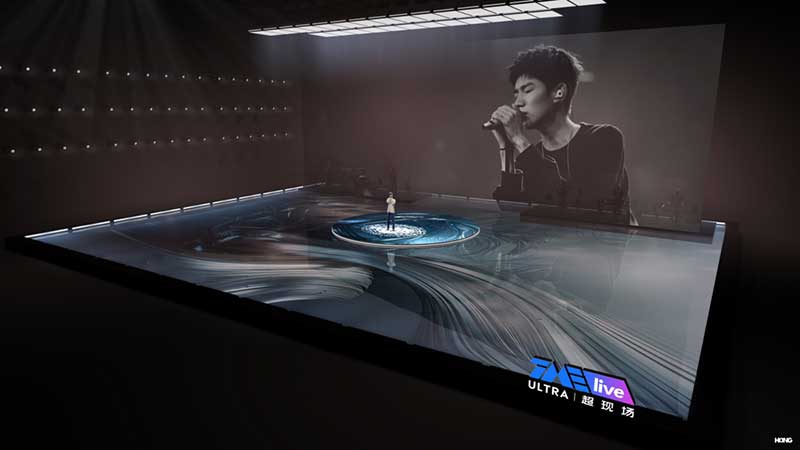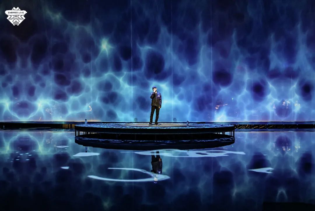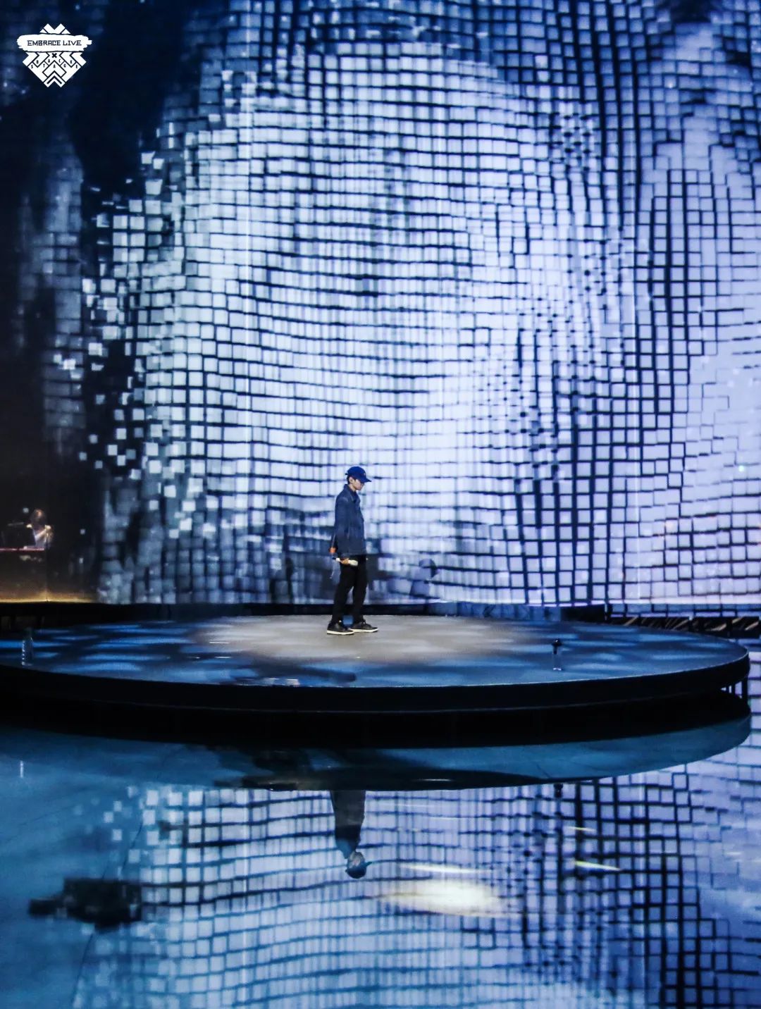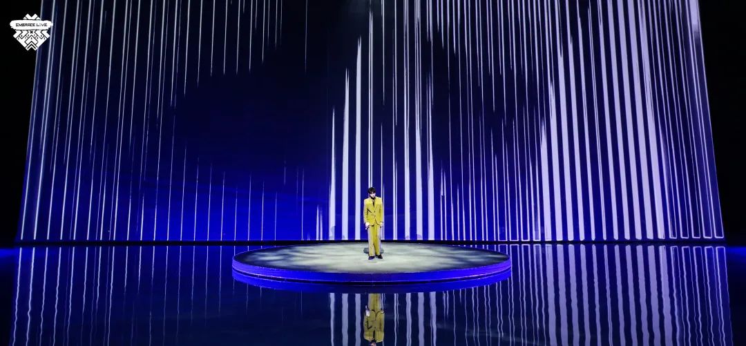 这次水舞台概念是大胆且创新的,将线下无法实现的水舞台搬到线上。发挥了线上直播的优势,以新的概念和创意玩法,将舞台设计成一个以圆为中心的水面舞台,用大视觉营造出沉浸感,同时通过线上弹幕来增加与粉丝之间的互动感。