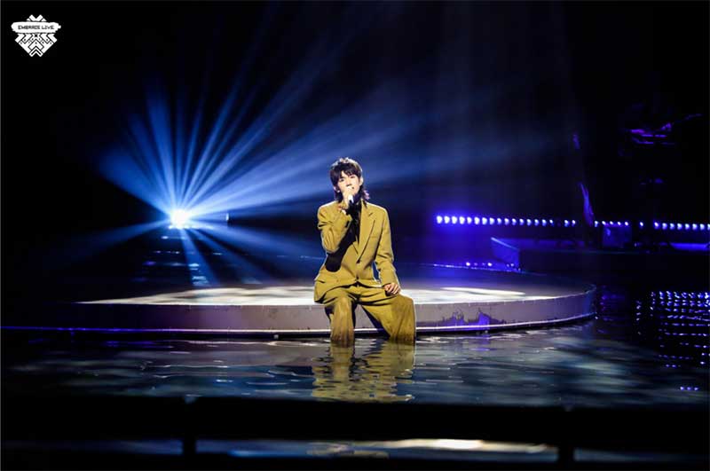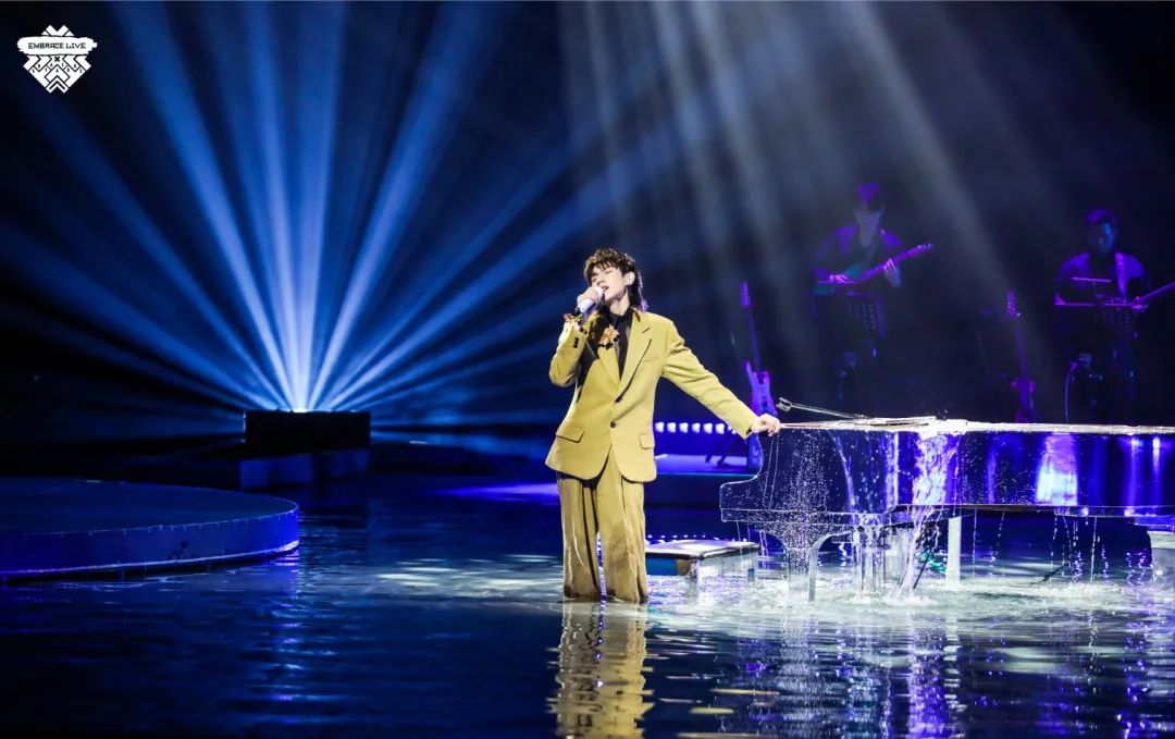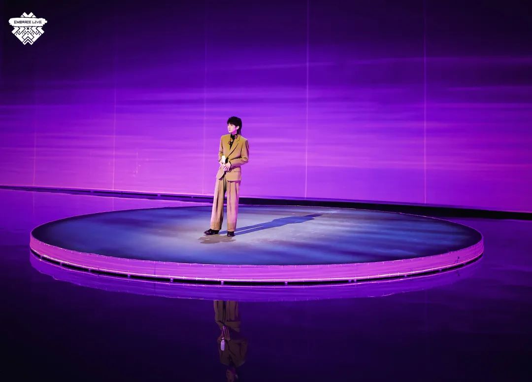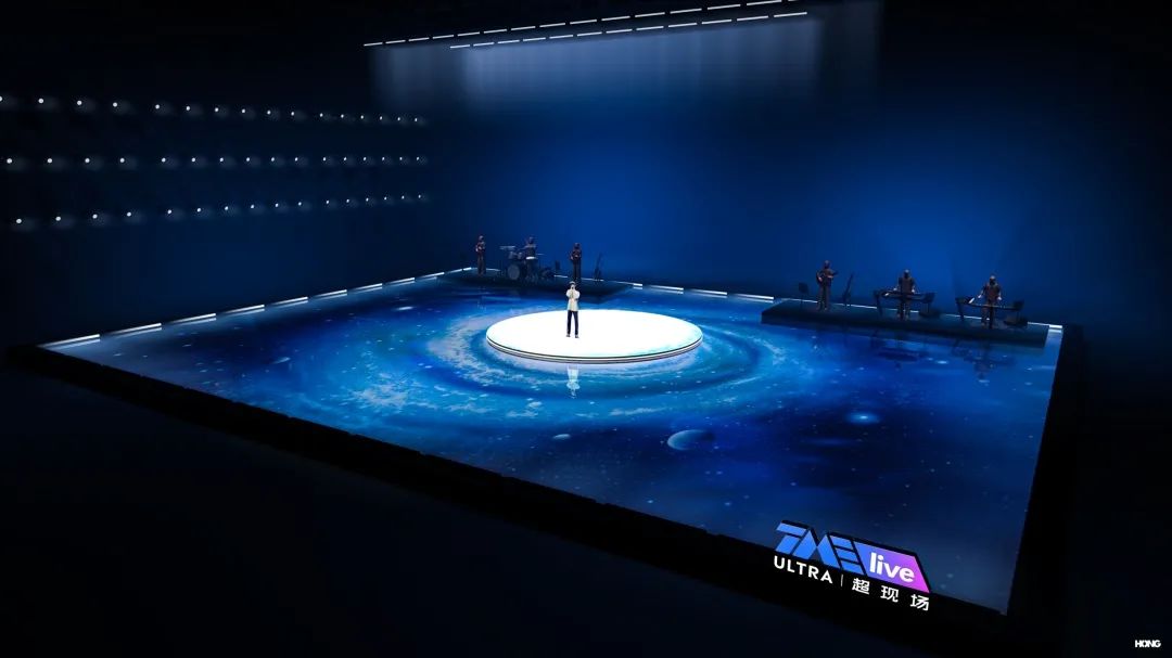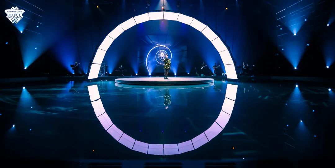 这次水舞台概念是大胆且创新的,将线下无法实现的水舞台搬到线上。发挥了线上直播的优势,以新的概念和创意玩法,将舞台设计成一个以圆为中心的水面舞台,用大视觉营造出沉浸感,同时通过线上弹幕来增加与粉丝之间的互动感。