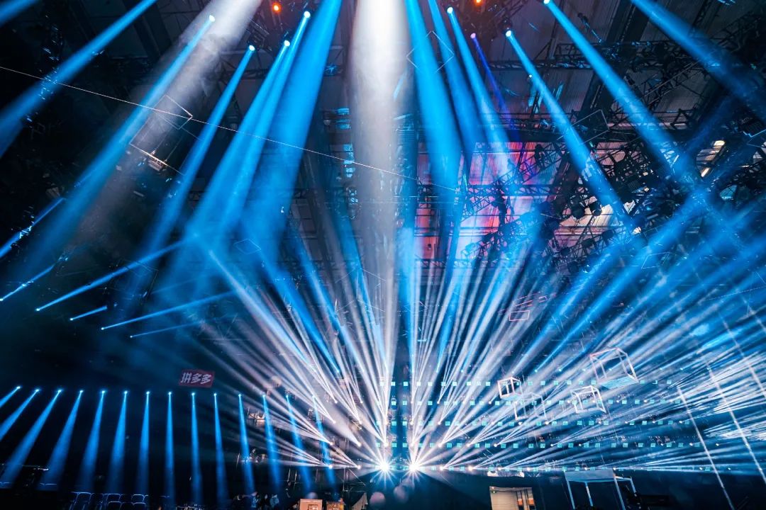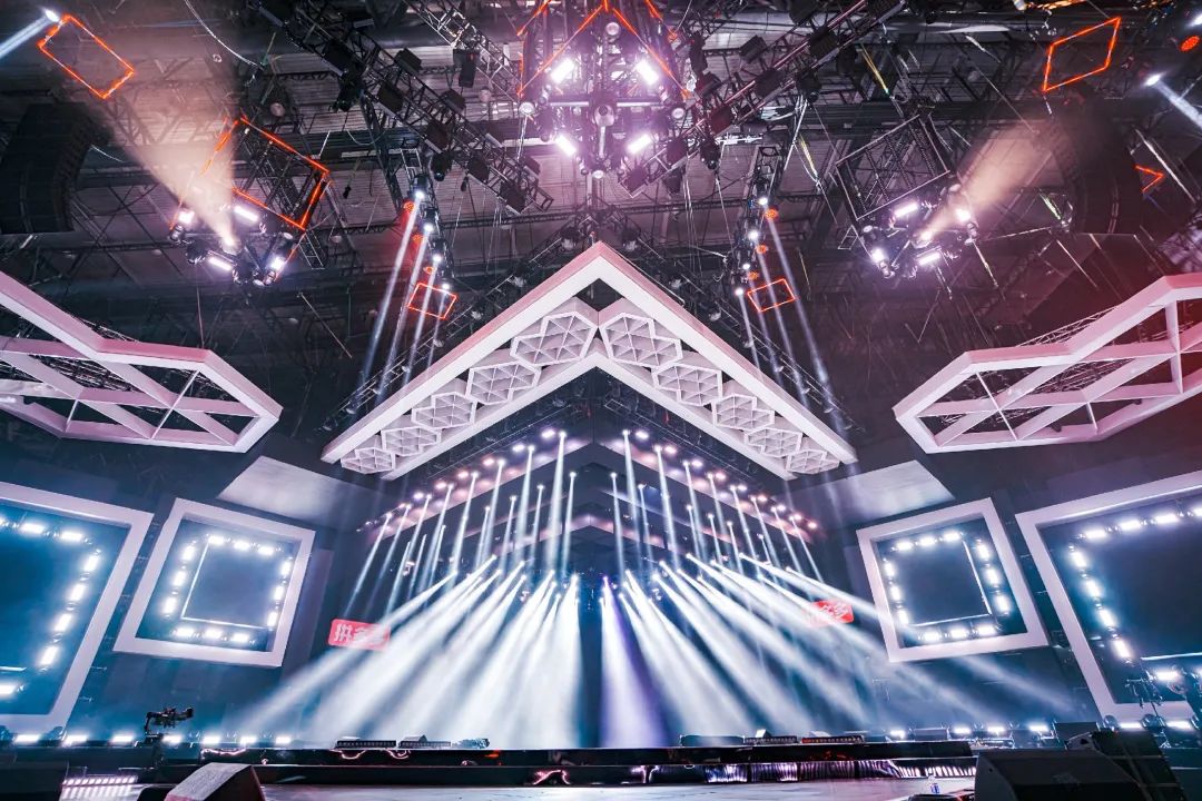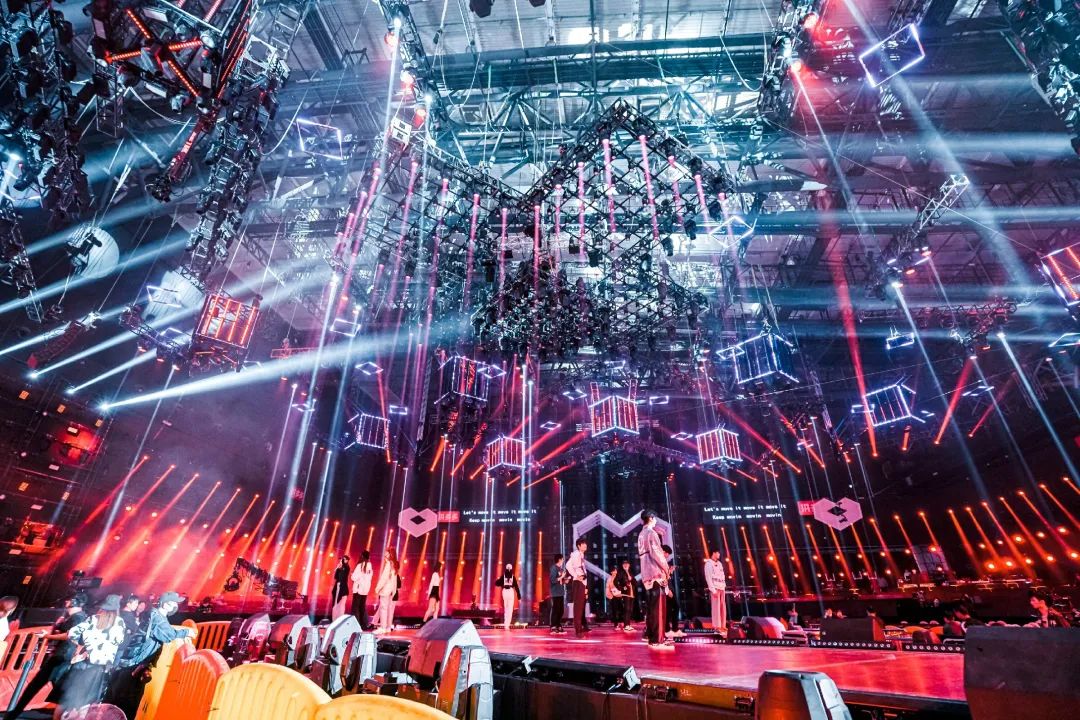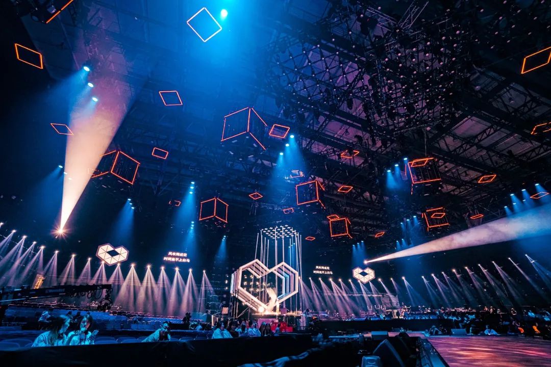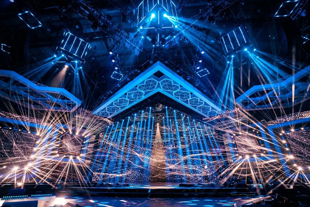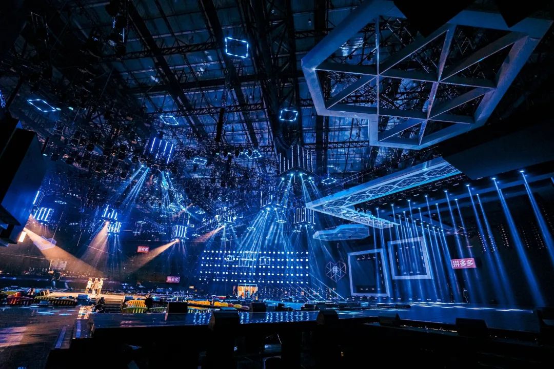 因为整个舞美设计都是方方正正的,灯光设计从舞台造型入手,在顶部做了14组立方体灯阵,在立方体四周都安装了像素灯条和50组四方形像素灯,悬空吊挂在上方,来配合整个舞美设计的视觉效果,把舞美设计语言概念连贯起来。