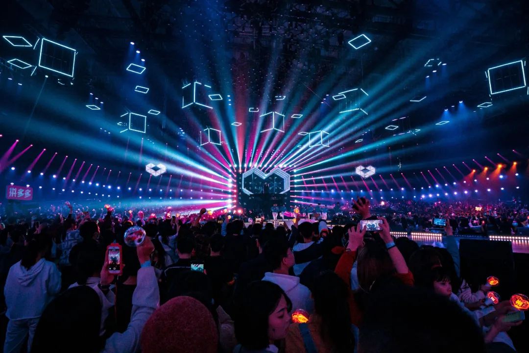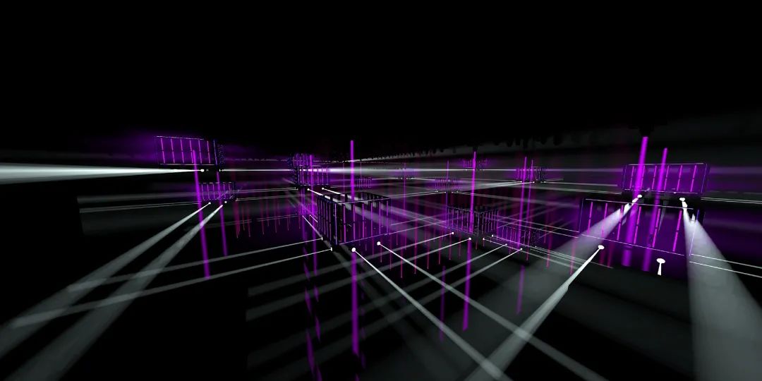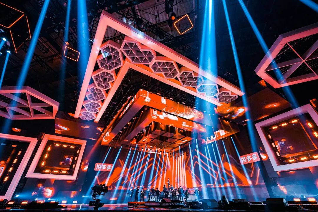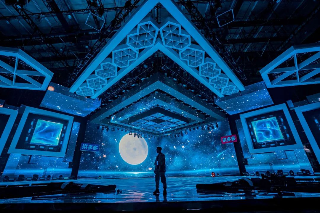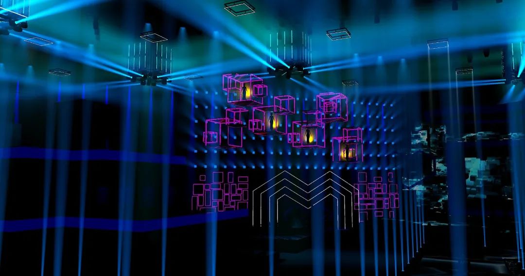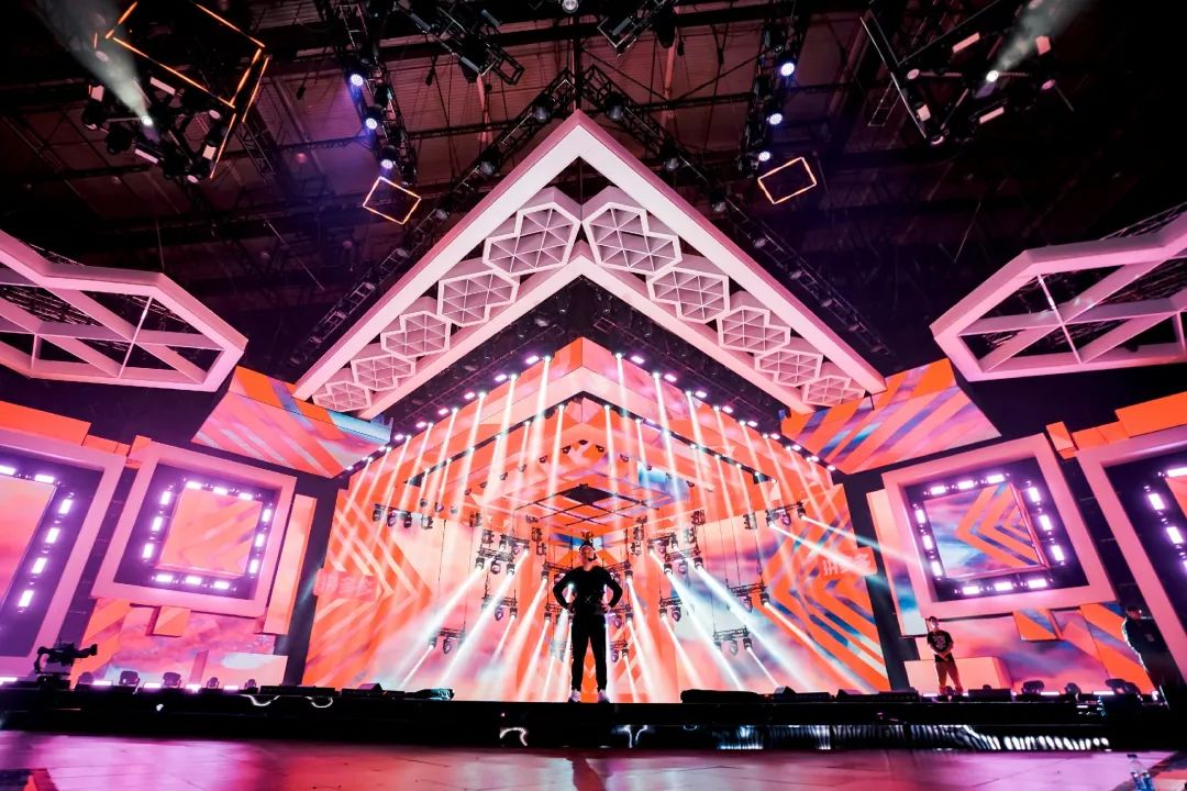 因为整个舞美设计都是方方正正的,灯光设计从舞台造型入手,在顶部做了14组立方体灯阵,在立方体四周都安装了像素灯条和50组四方形像素灯,悬空吊挂在上方,来配合整个舞美设计的视觉效果,把舞美设计语言概念连贯起来。