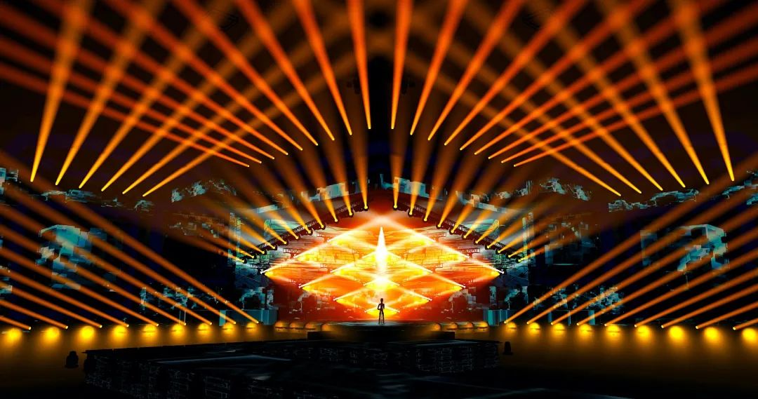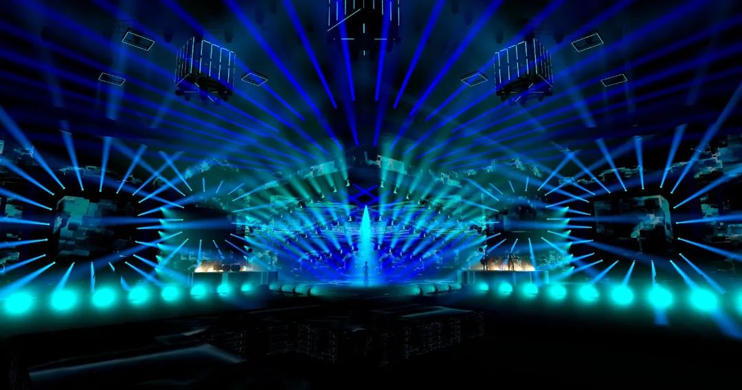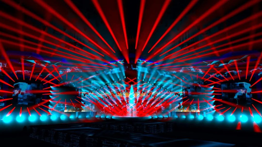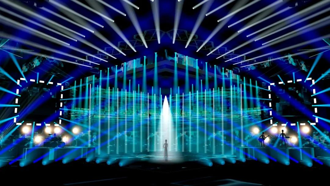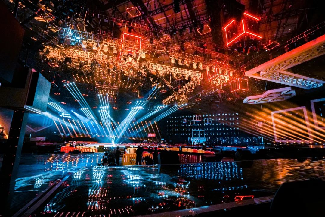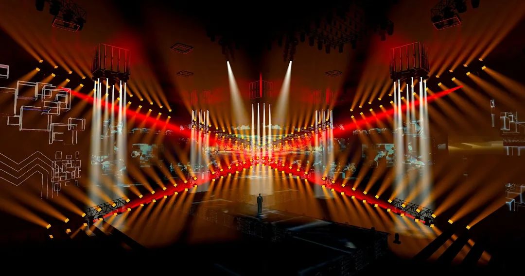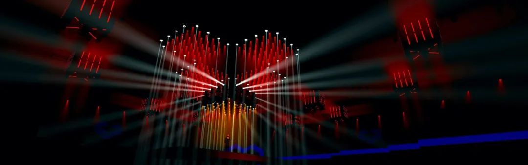 主舞台作为主要表演区域,是本次设计的重点。灯光在设计过程中构思了许多想法,一开始想将灯藏于屏幕当中,但由于主舞台不是采用冰屏,无办法在大屏没办法藏灯,最终只能在顶部装灯。为了丰富主舞台区域的效果,采用15组3米竖条数控灯架和18组2米横条数控灯架,来增加主舞台区域的灯光效果和亮点。