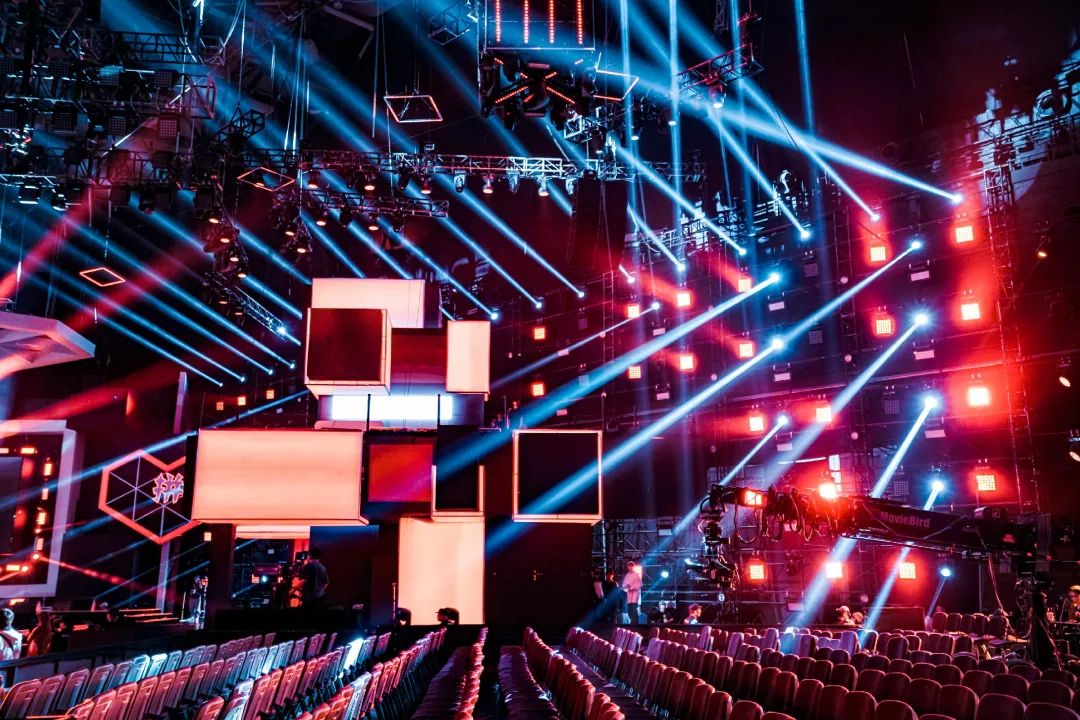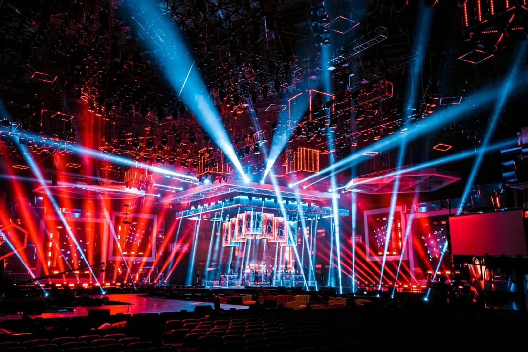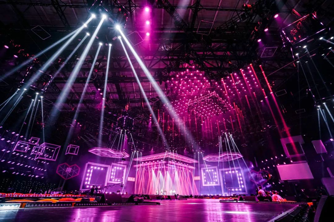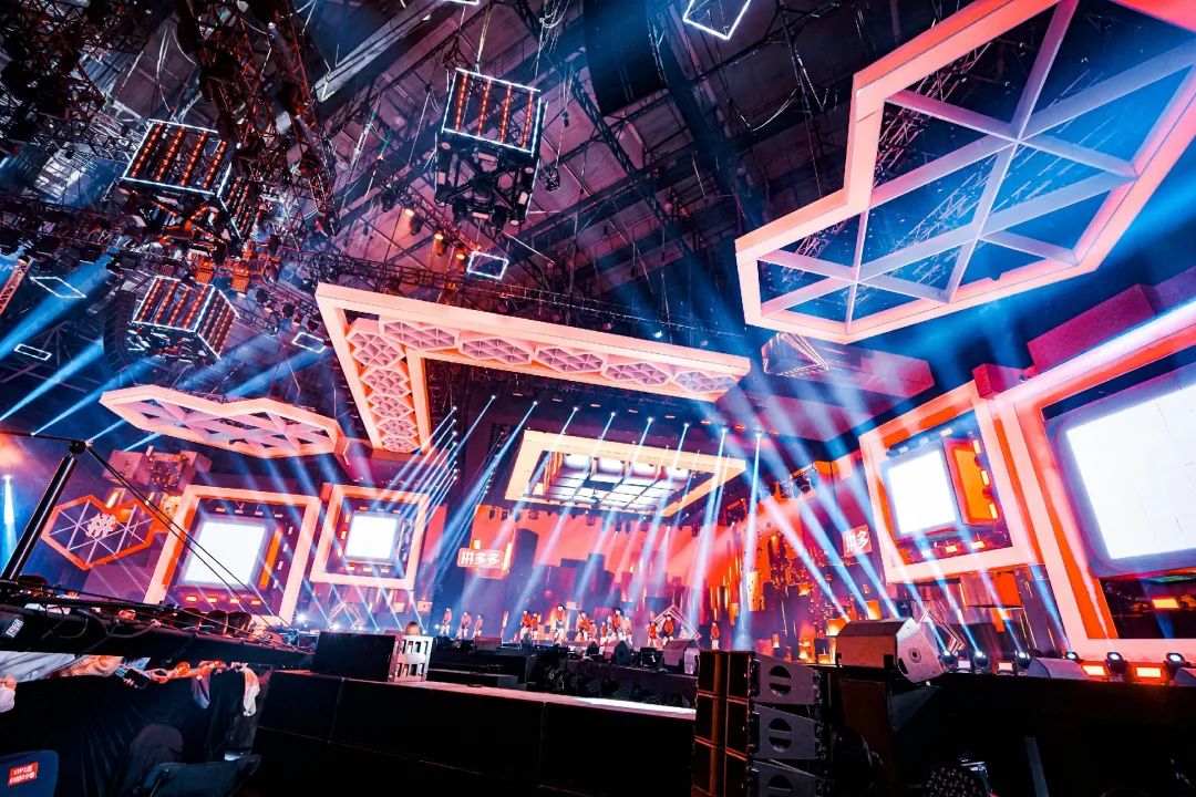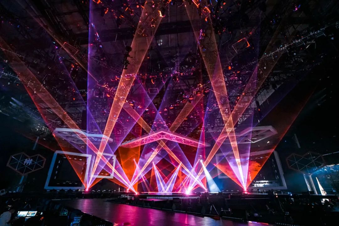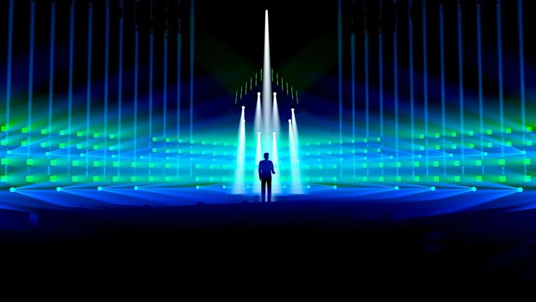 主舞台作为主要表演区域,是本次设计的重点。灯光在设计过程中构思了许多想法,一开始想将灯藏于屏幕当中,但由于主舞台不是采用冰屏,无办法在大屏没办法藏灯,最终只能在顶部装灯。为了丰富主舞台区域的效果,采用15组3米竖条数控灯架和18组2米横条数控灯架,来增加主舞台区域的灯光效果和亮点。
