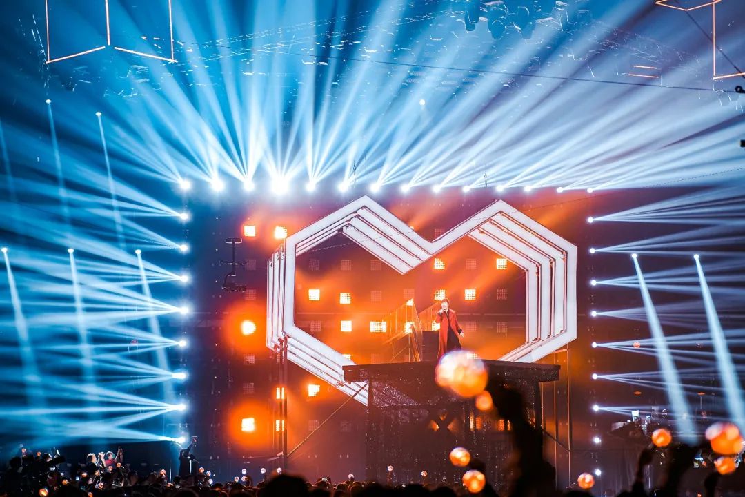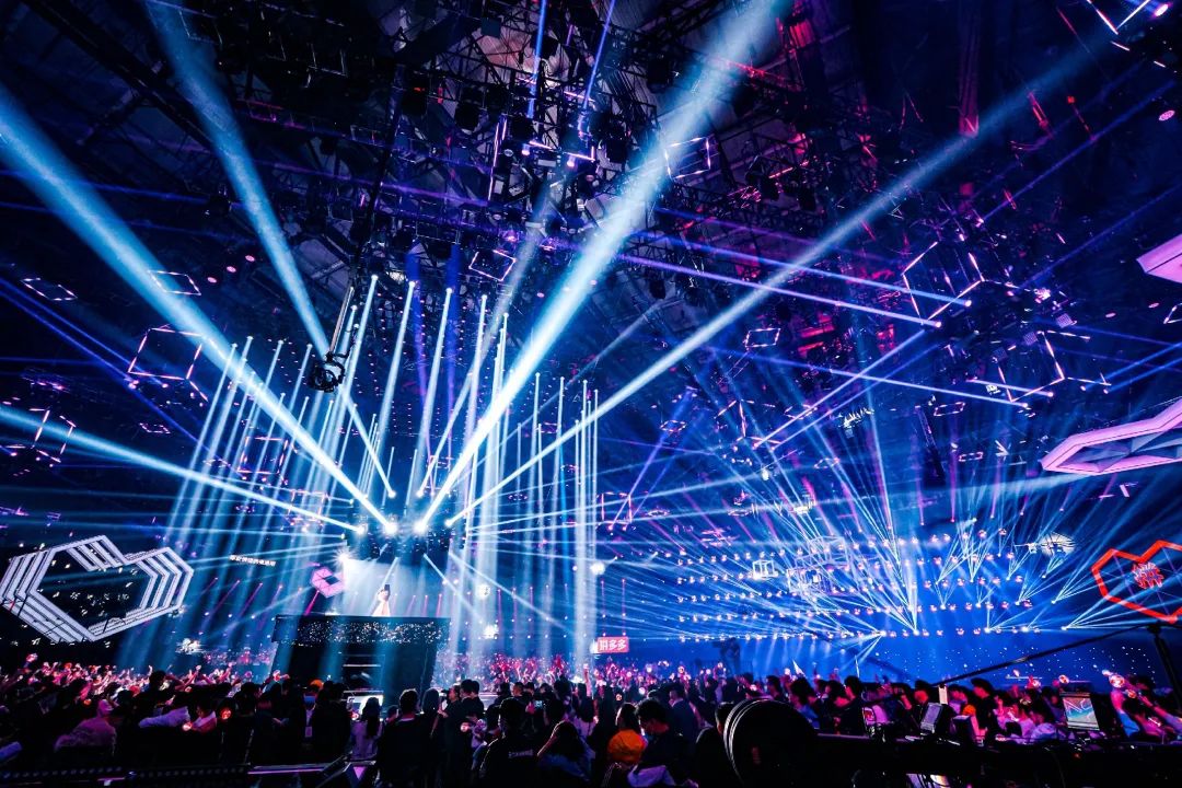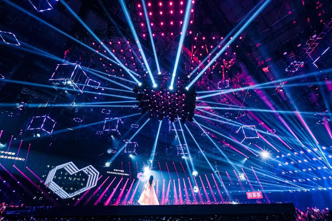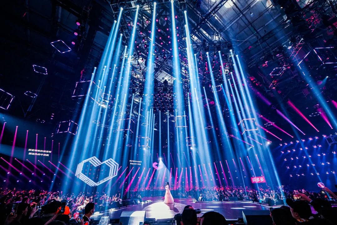 在中心舞台上方设计了8组数控灯架(原本是4组,为了规避飞猫飞行路线,拆分为8组)。心形舞台上方也设计了一组数控灯架,而在心型舞台,灯光还特意设计了一面灯光矩阵,渲染舞台造型的同时配合演出做出更多创意效果。